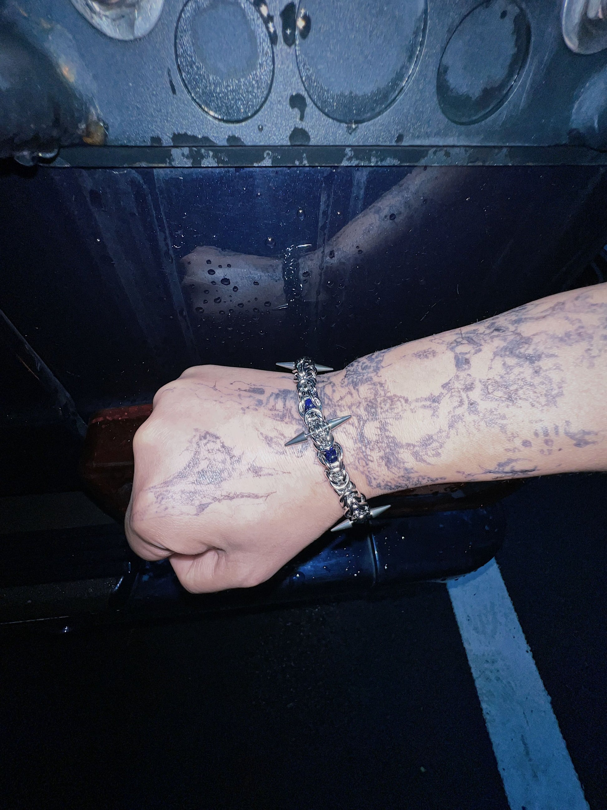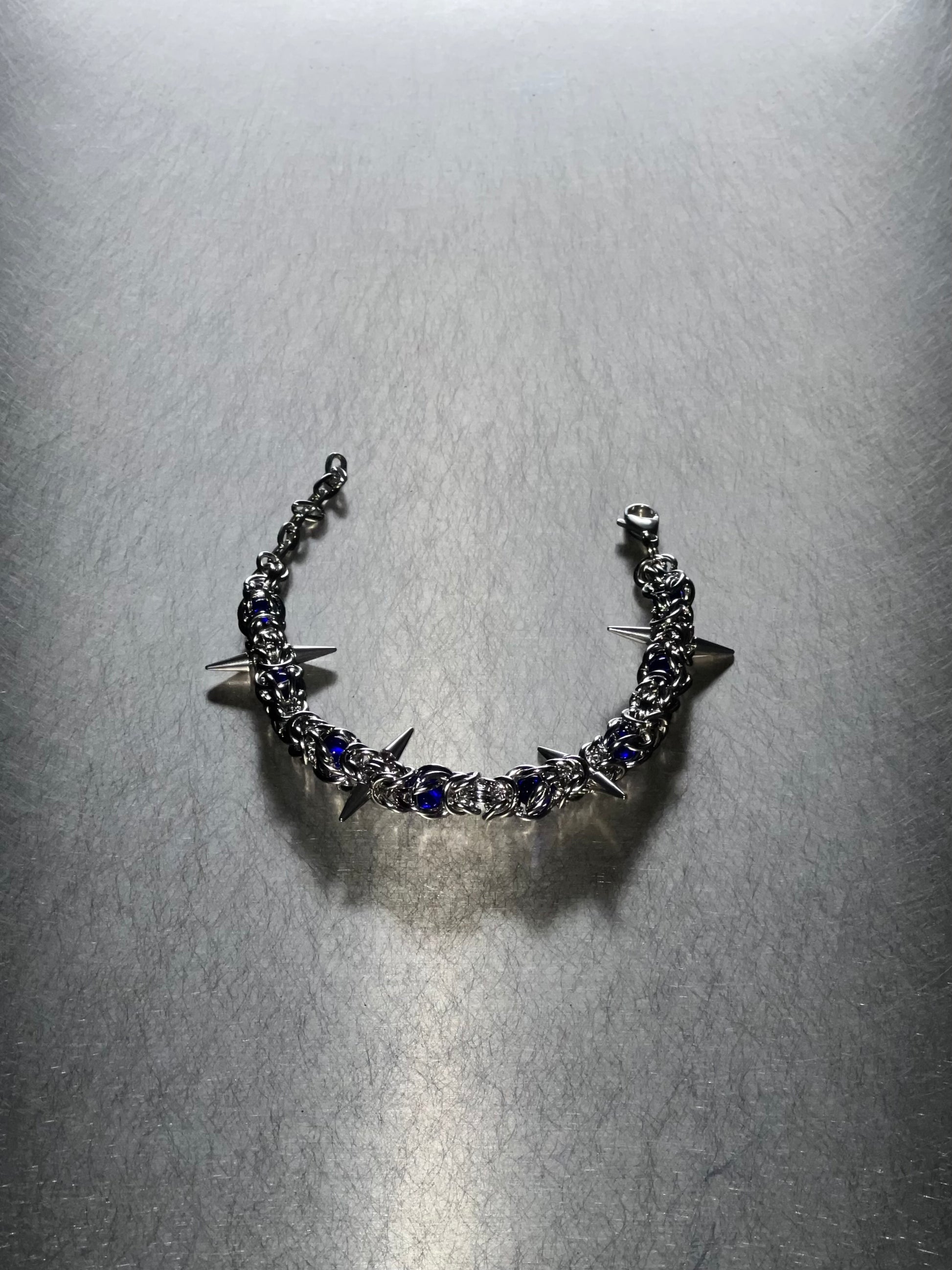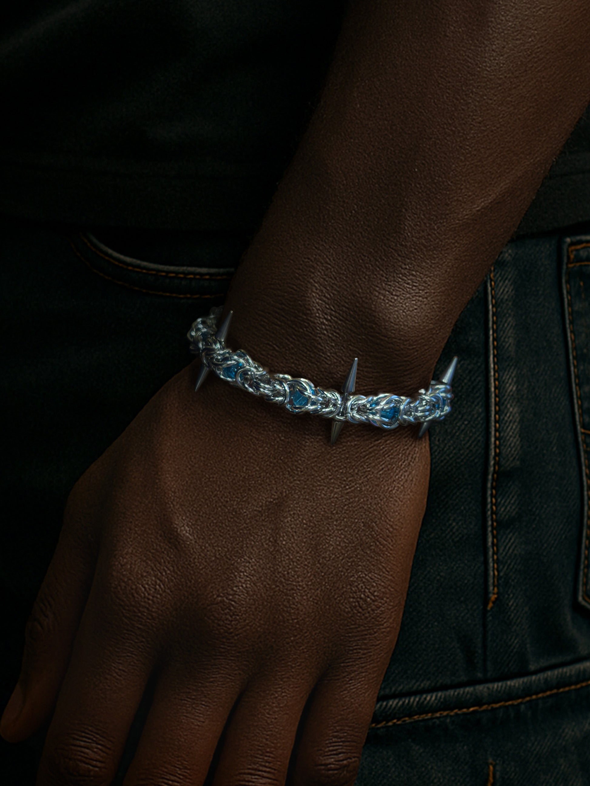 Geschmiedet aus hochdichtem Titanstahl und umhüllt von tiefen, handwerklich gefertigten Steinen, ist jedes Segment von Hand verbunden, um einen gepanzerten, rhythmischen Look zu schaffen. Die markanten Spike-Details setzen einen scharfen Kontrapunkt zu den glatten, spiegelnden Flächen und schaffen ein Gleichgewicht zwischen Gefahr und Design. Abgeschlossen mit einem verstellbaren Verschluss, um sich perfekt an deine Passform anzupassen.