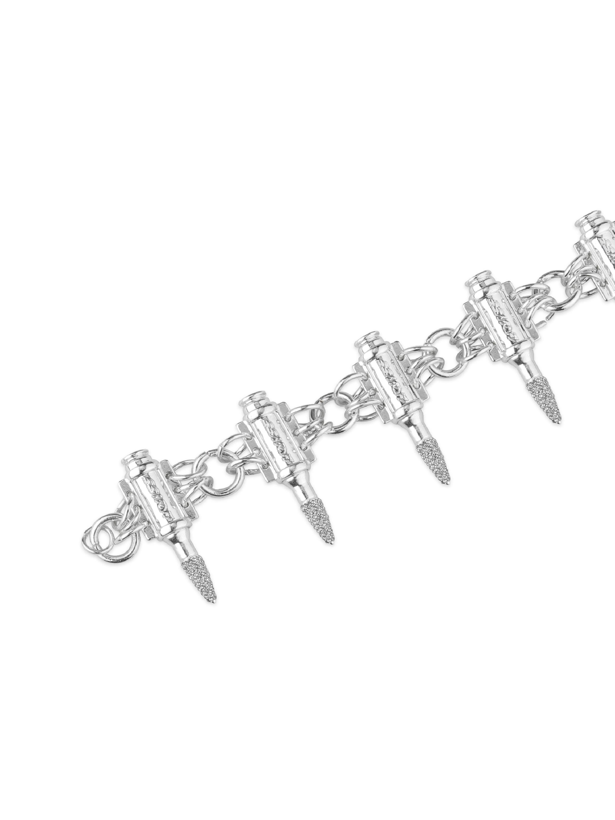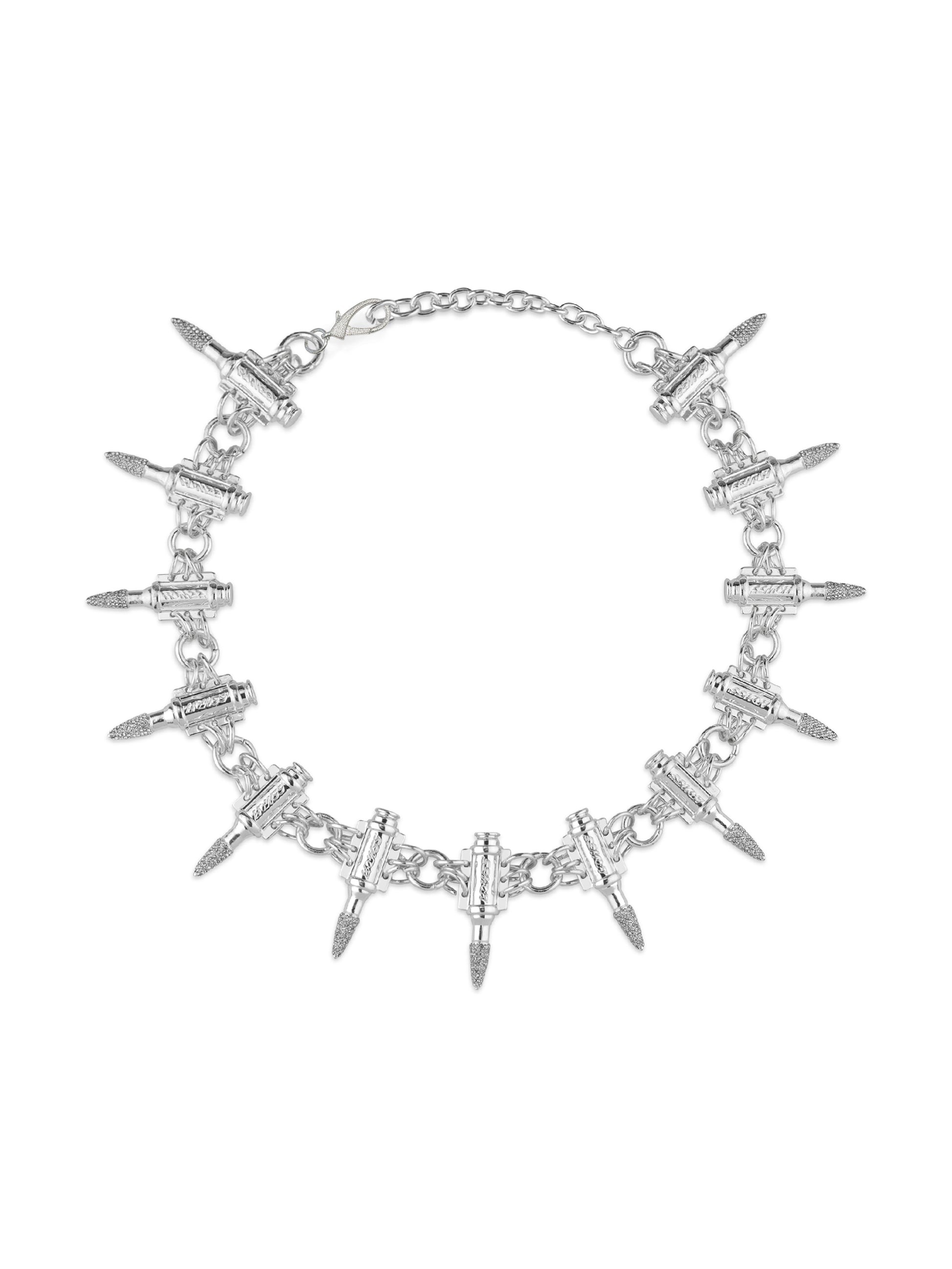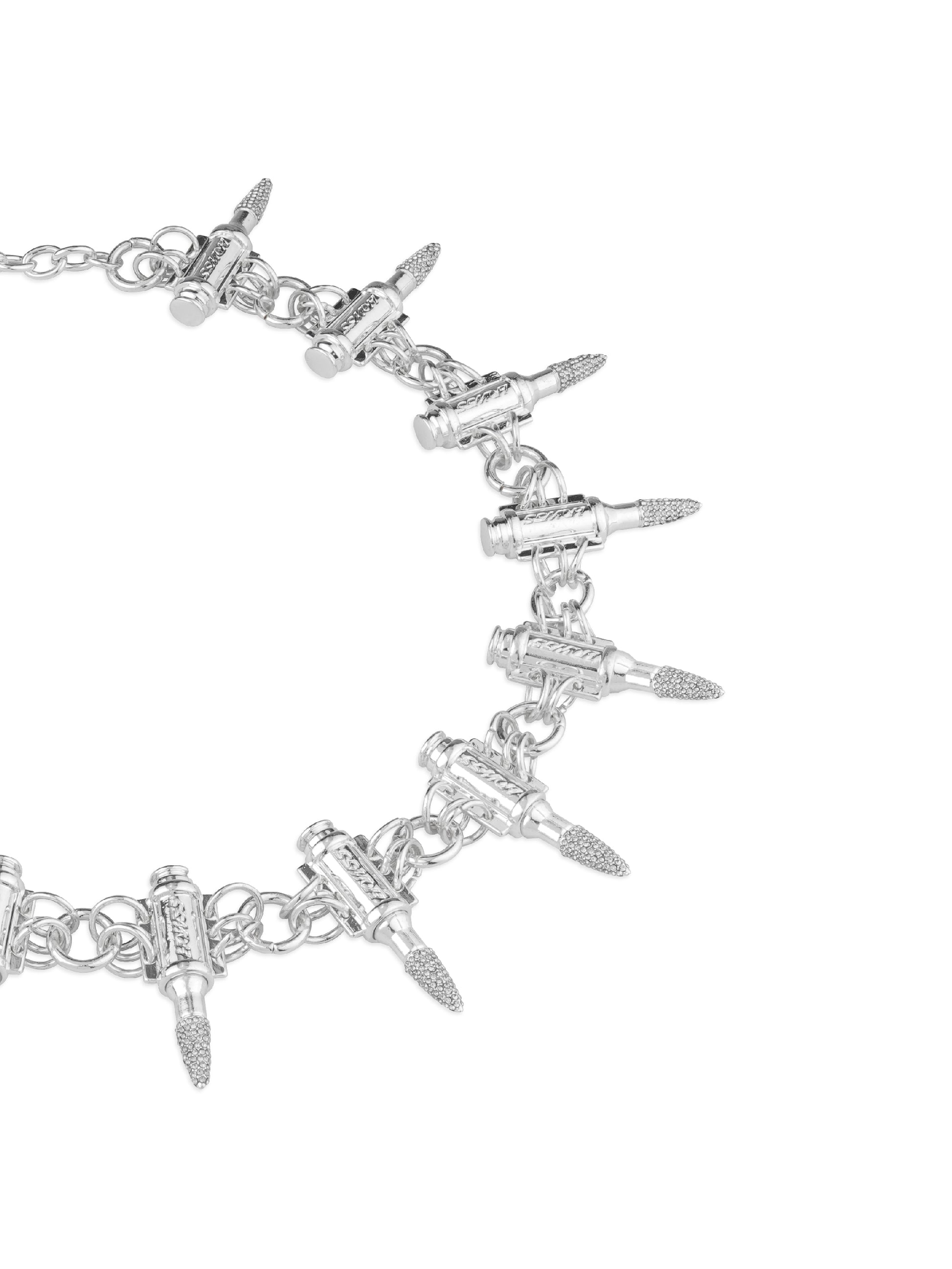 Gefertigt aus einer hochwertigen Legierung mit weißvergoldeter Beschichtung für einen klaren, kühlen Glanz. Jede Patronenspitze ist von Hand mit Strasssteinen in optischer Qualität besetzt, die scharfe Lichtreflexe erzeugen.