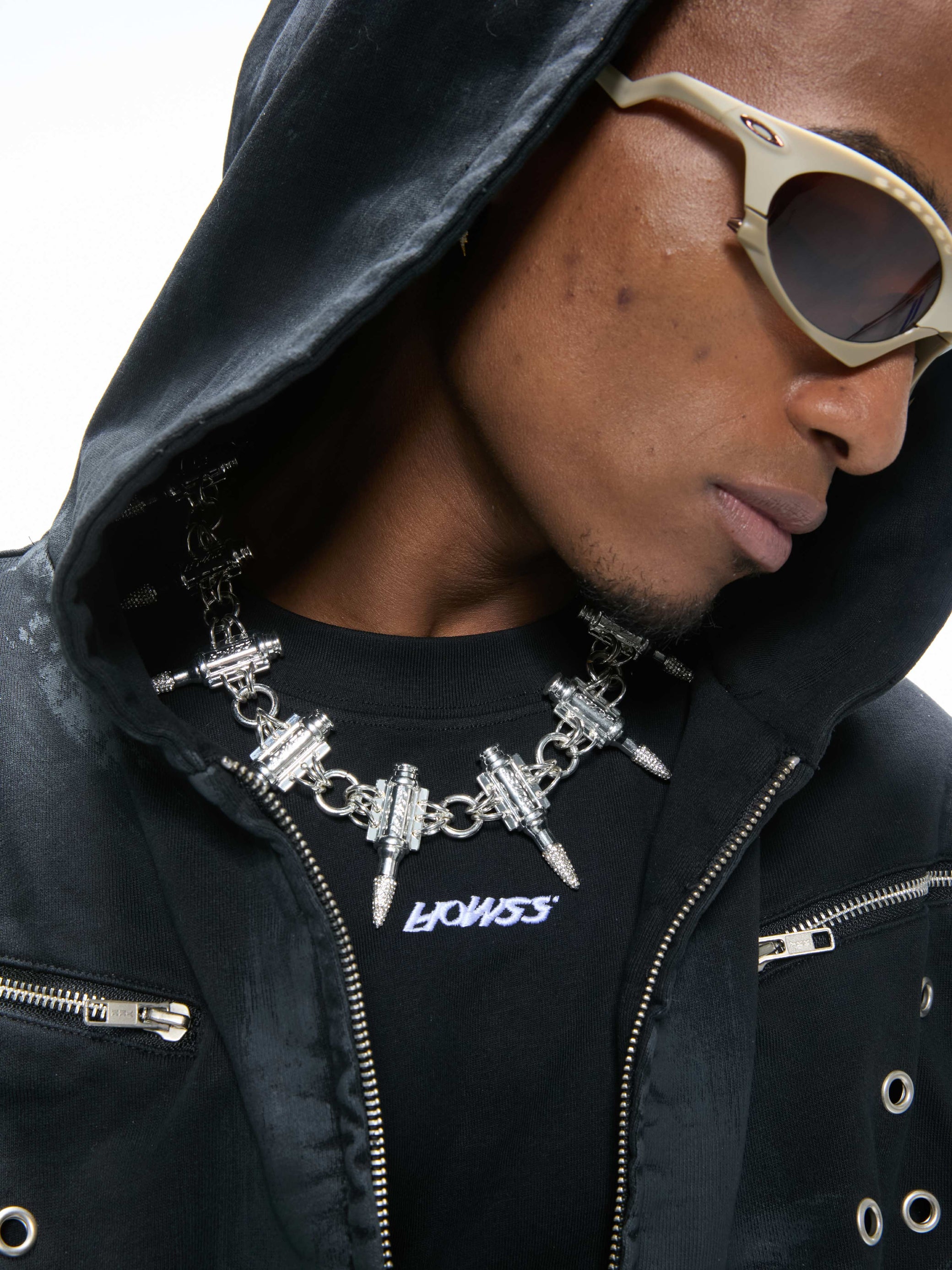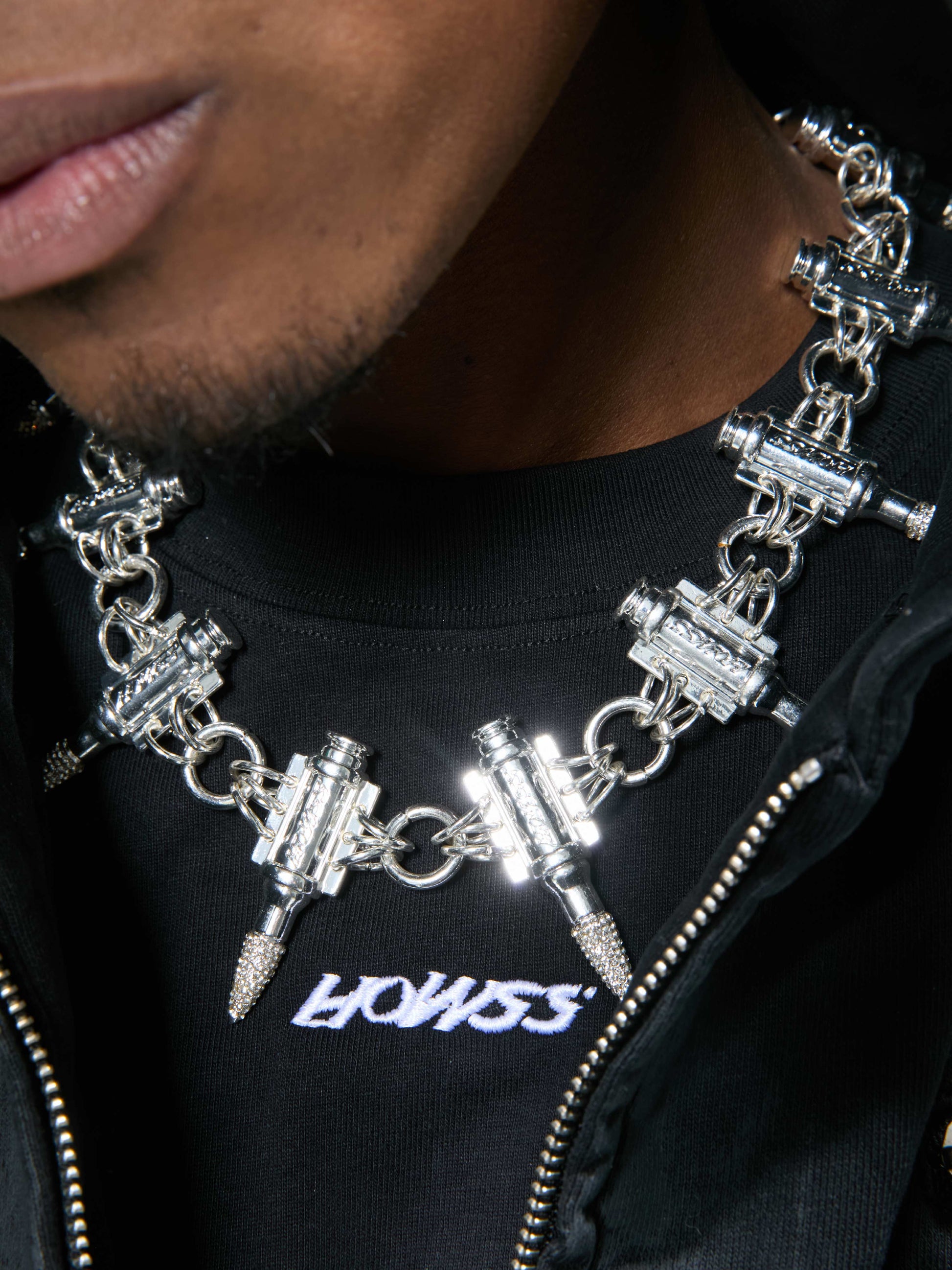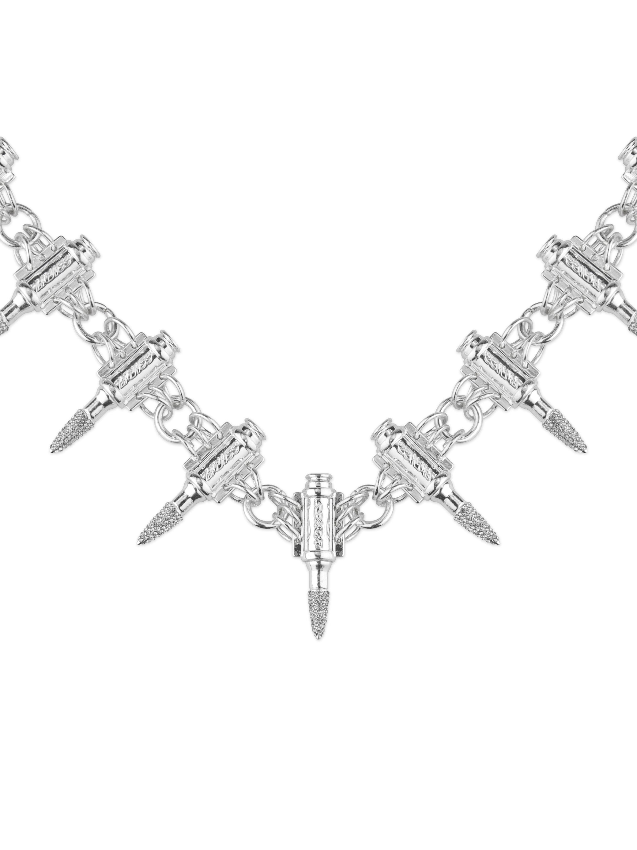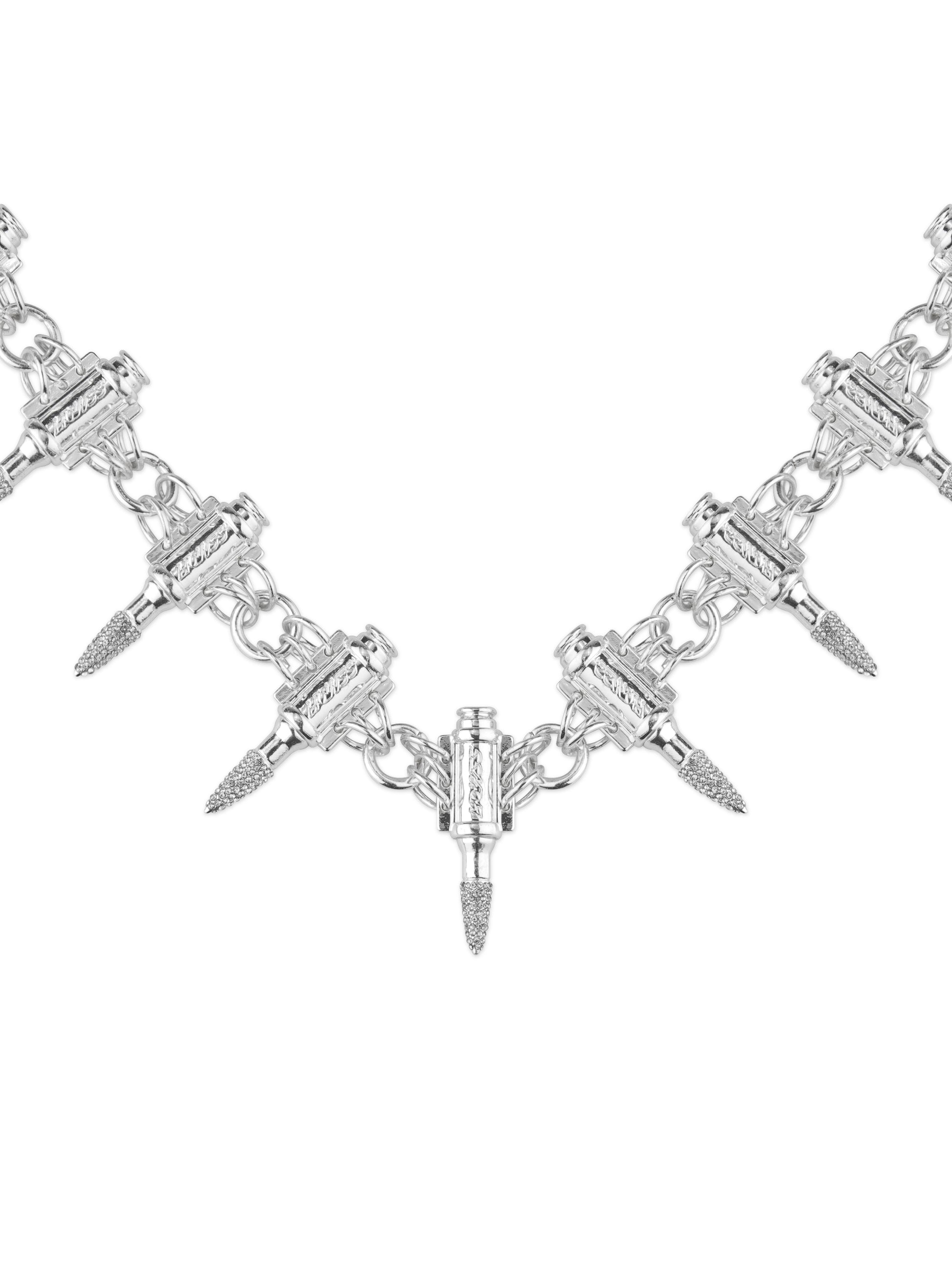 Gefertigt aus einer hochwertigen Legierung mit weißvergoldeter Beschichtung für einen klaren, kühlen Glanz. Jede Patronenspitze ist von Hand mit Strasssteinen in optischer Qualität besetzt, die scharfe Lichtreflexe erzeugen.