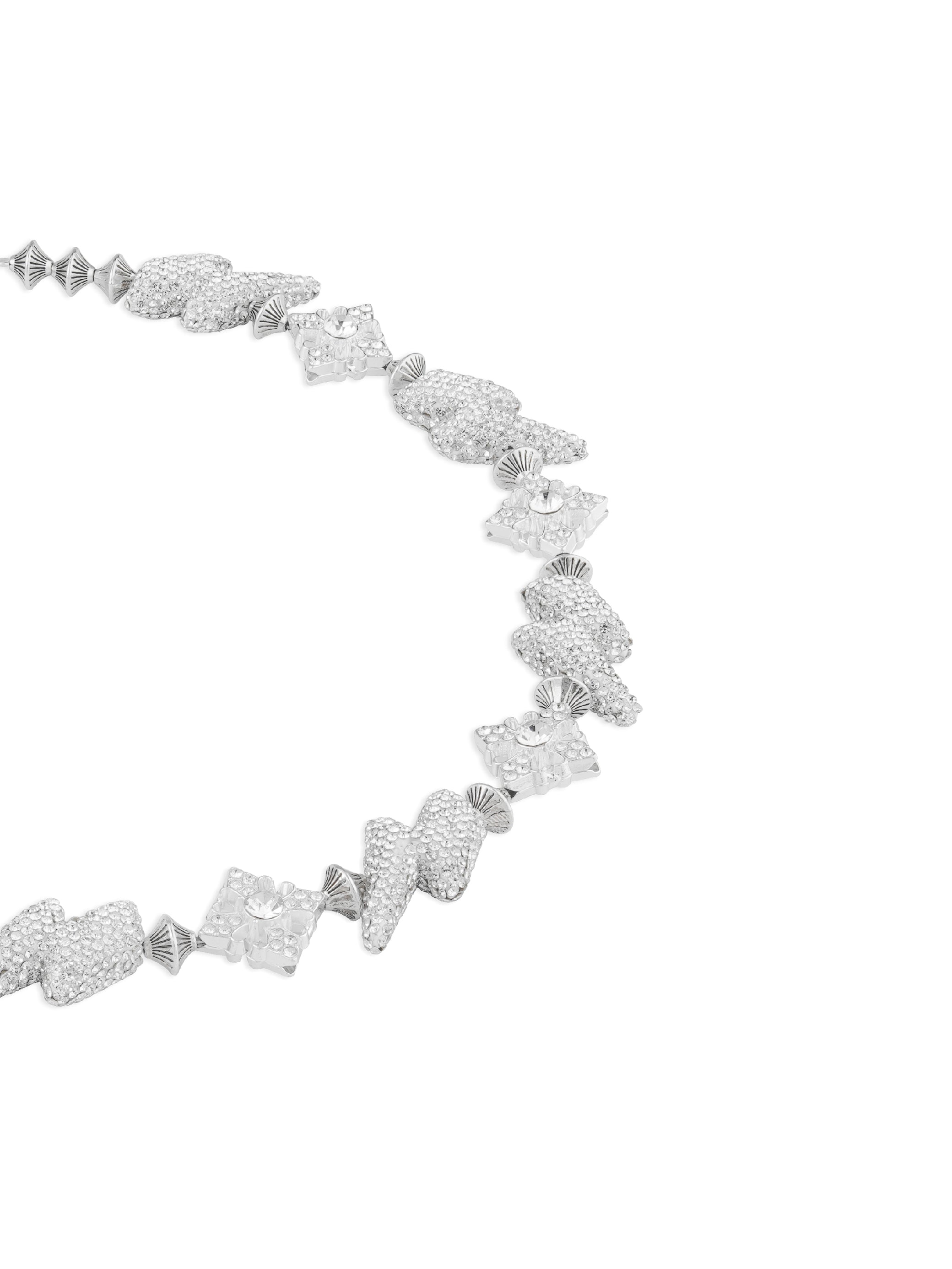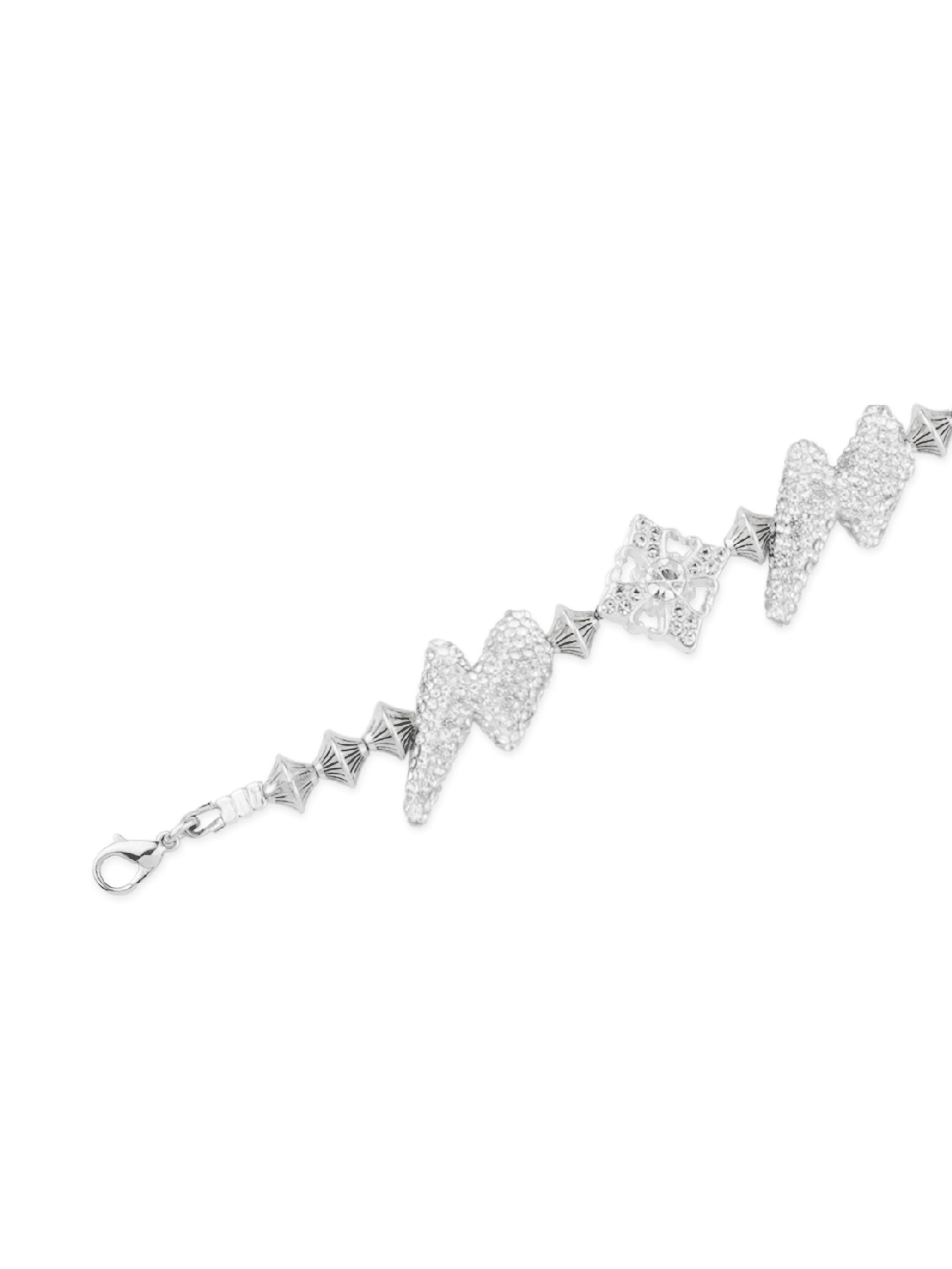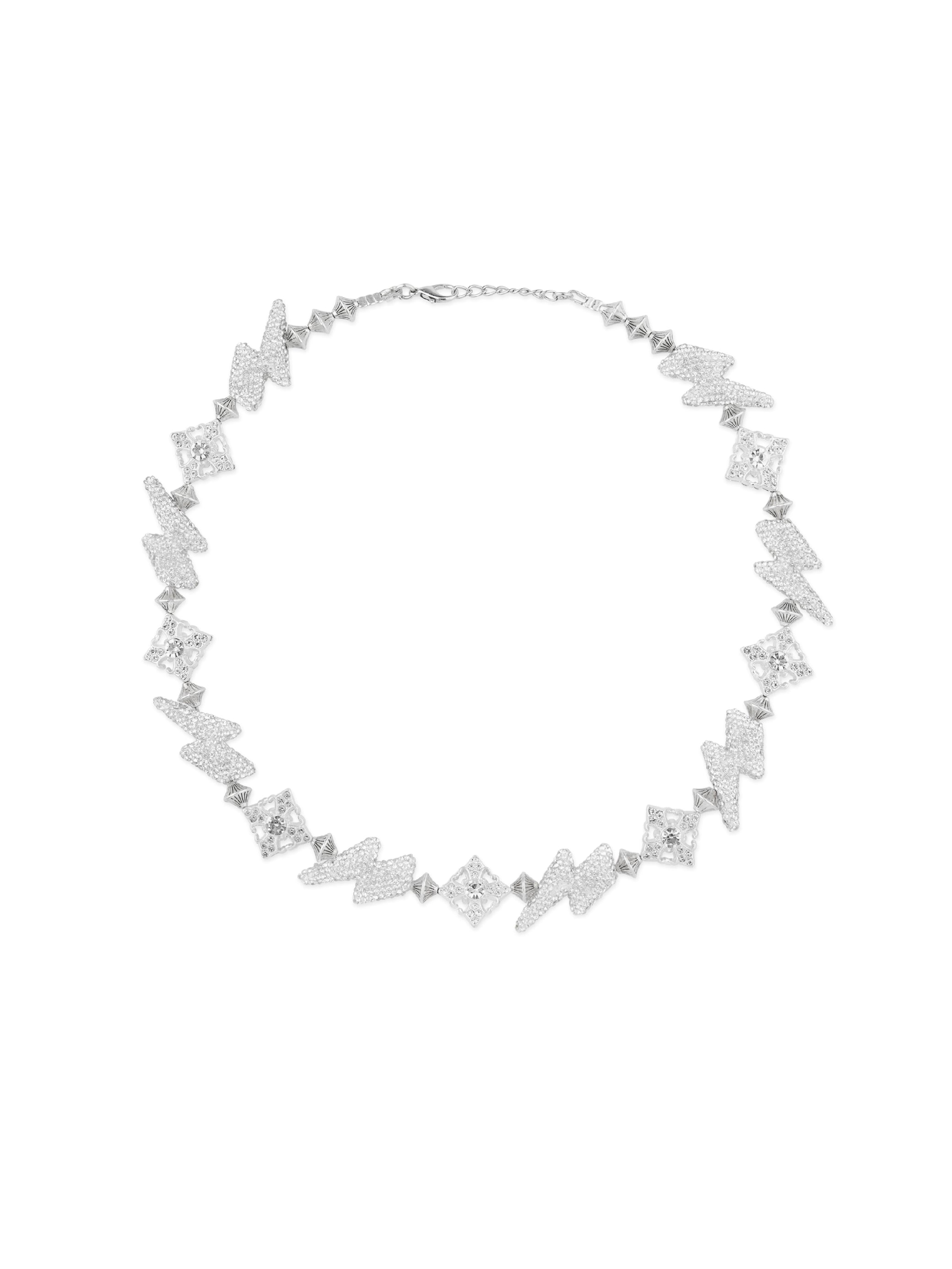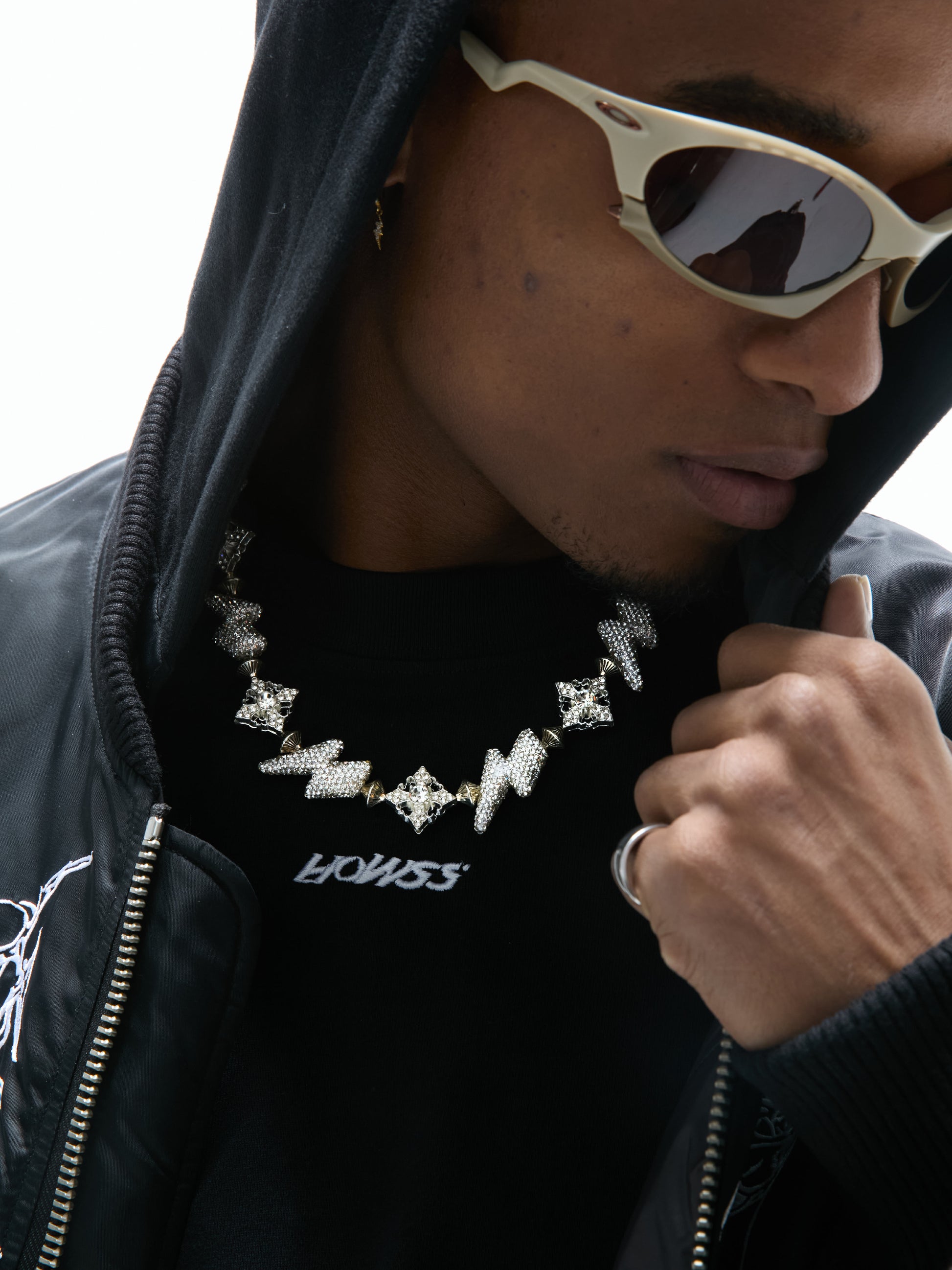 Cada eslabón en forma de rayo se engasta a mano con resina de calidad óptica para una reflectividad intensa y un brillo nítido. Todos los componentes estructurales están fundidos en aleación y pulidos, ofreciendo un acabado limpio, industrial y con peso sólido.
