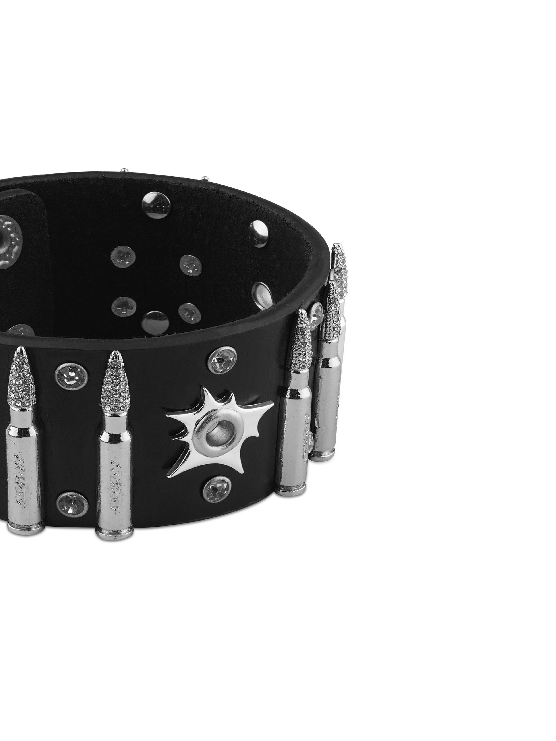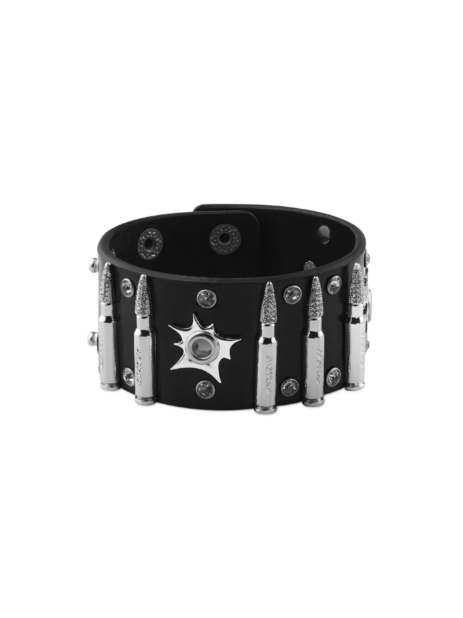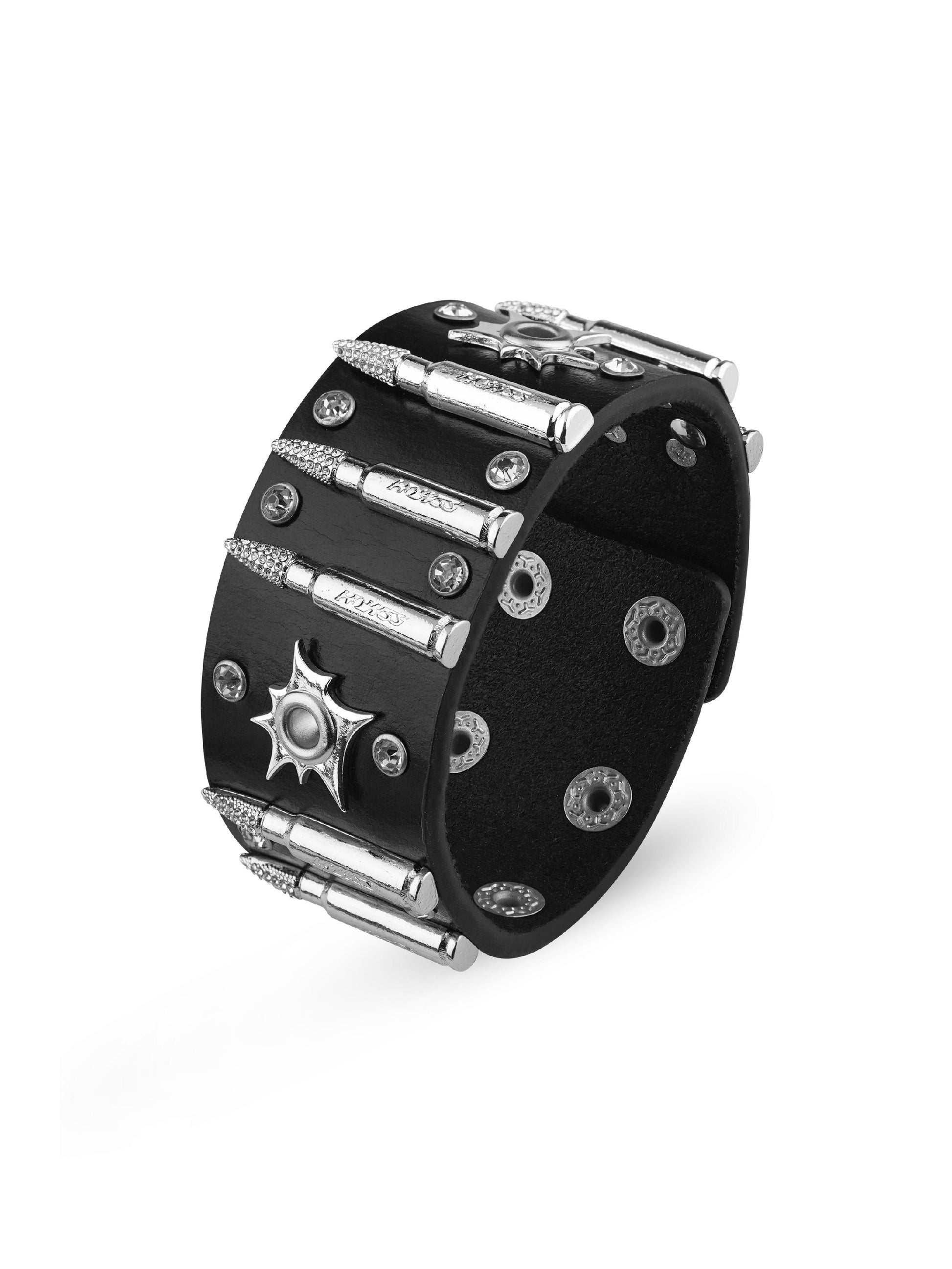 El cuero de primera calidad forma la base de la pulsera, combinando flexibilidad con durabilidad a largo plazo. Las tachuelas metálicas en forma de bala están fundidas en aleación y pulidas a mano, combinadas con pedrería engastada a mano para crear un contraste marcado entre dureza y brillo.