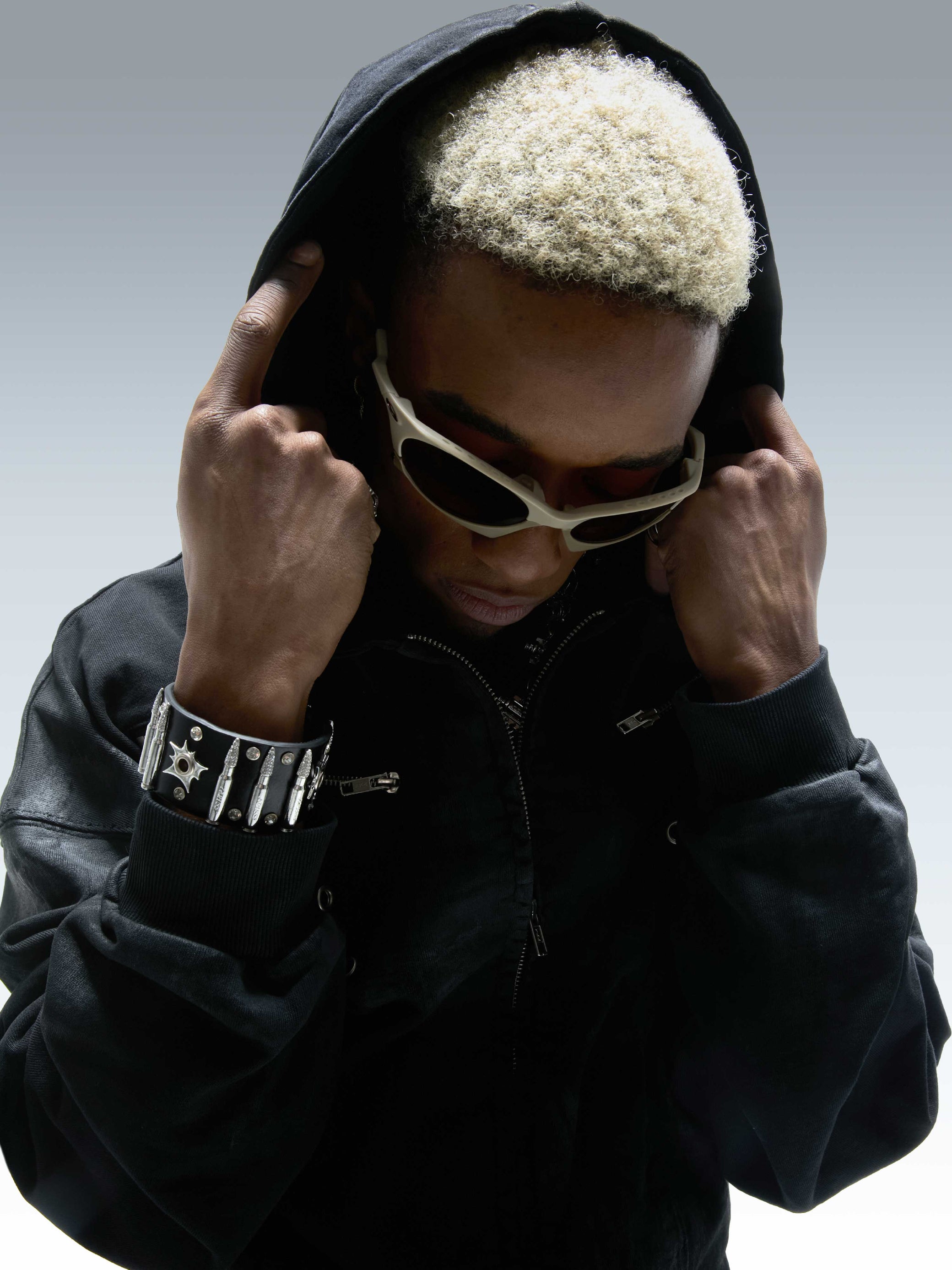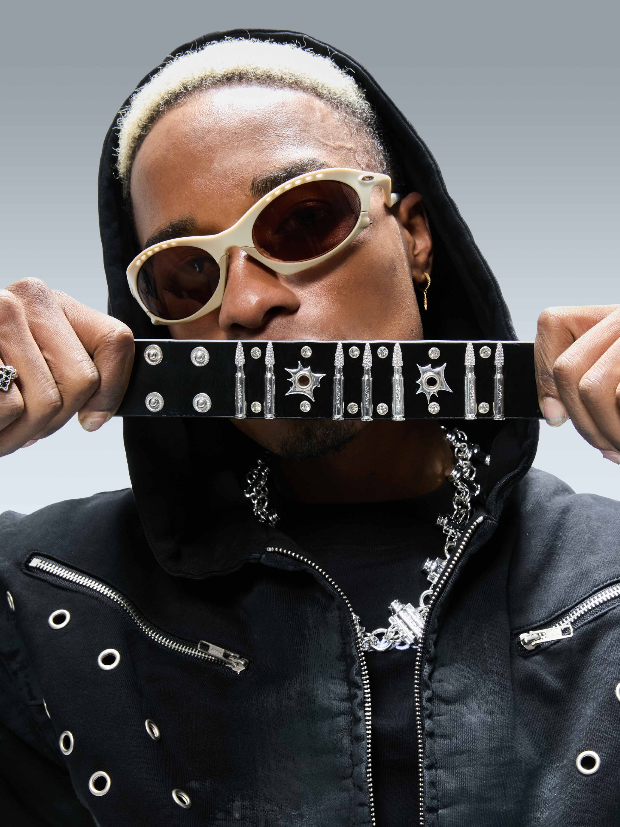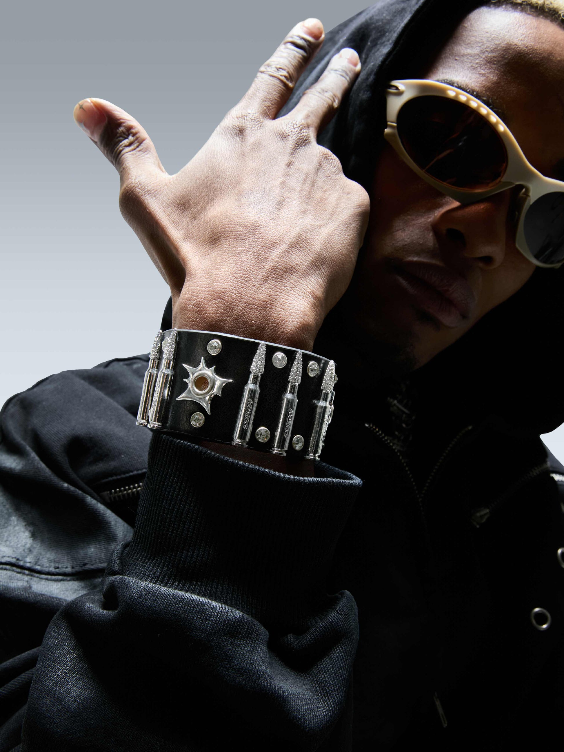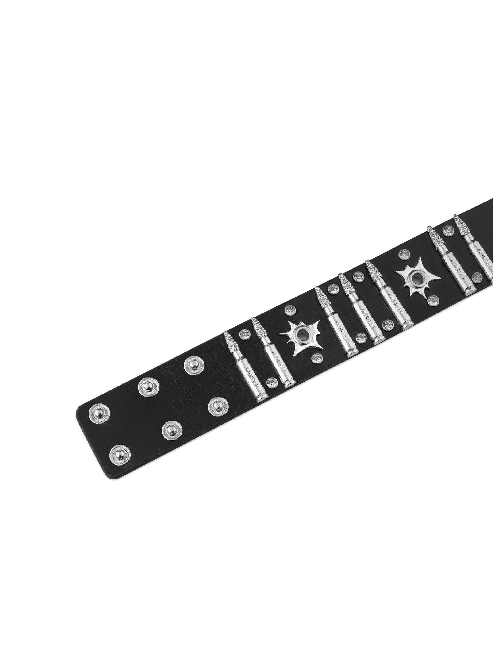 El cuero de primera calidad forma la base de la pulsera, combinando flexibilidad con durabilidad a largo plazo. Las tachuelas metálicas en forma de bala están fundidas en aleación y pulidas a mano, combinadas con pedrería engastada a mano para crear un contraste marcado entre dureza y brillo.