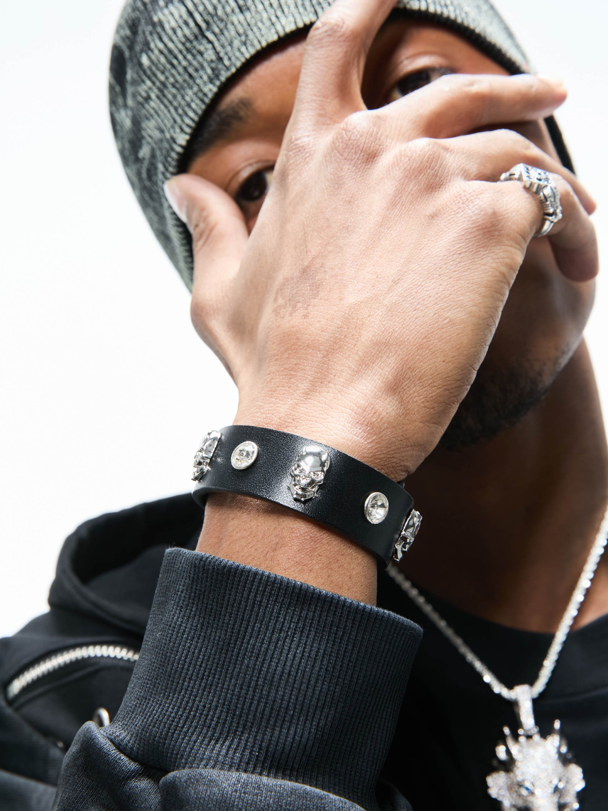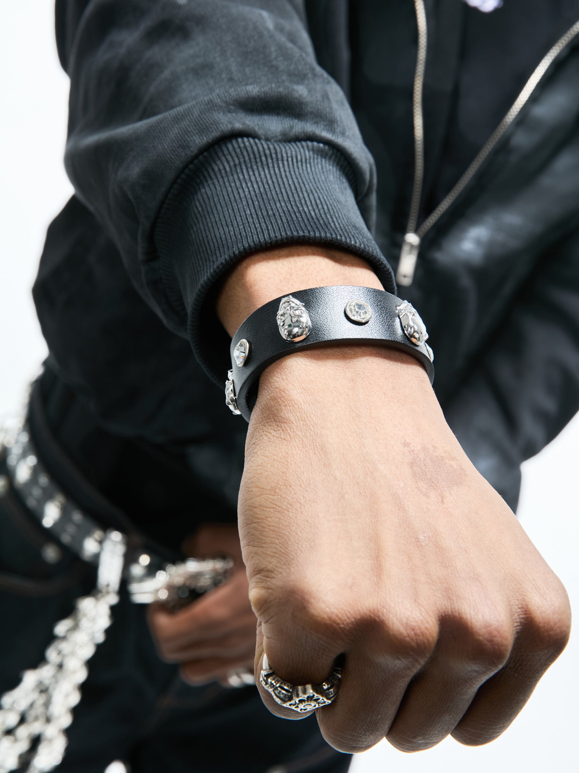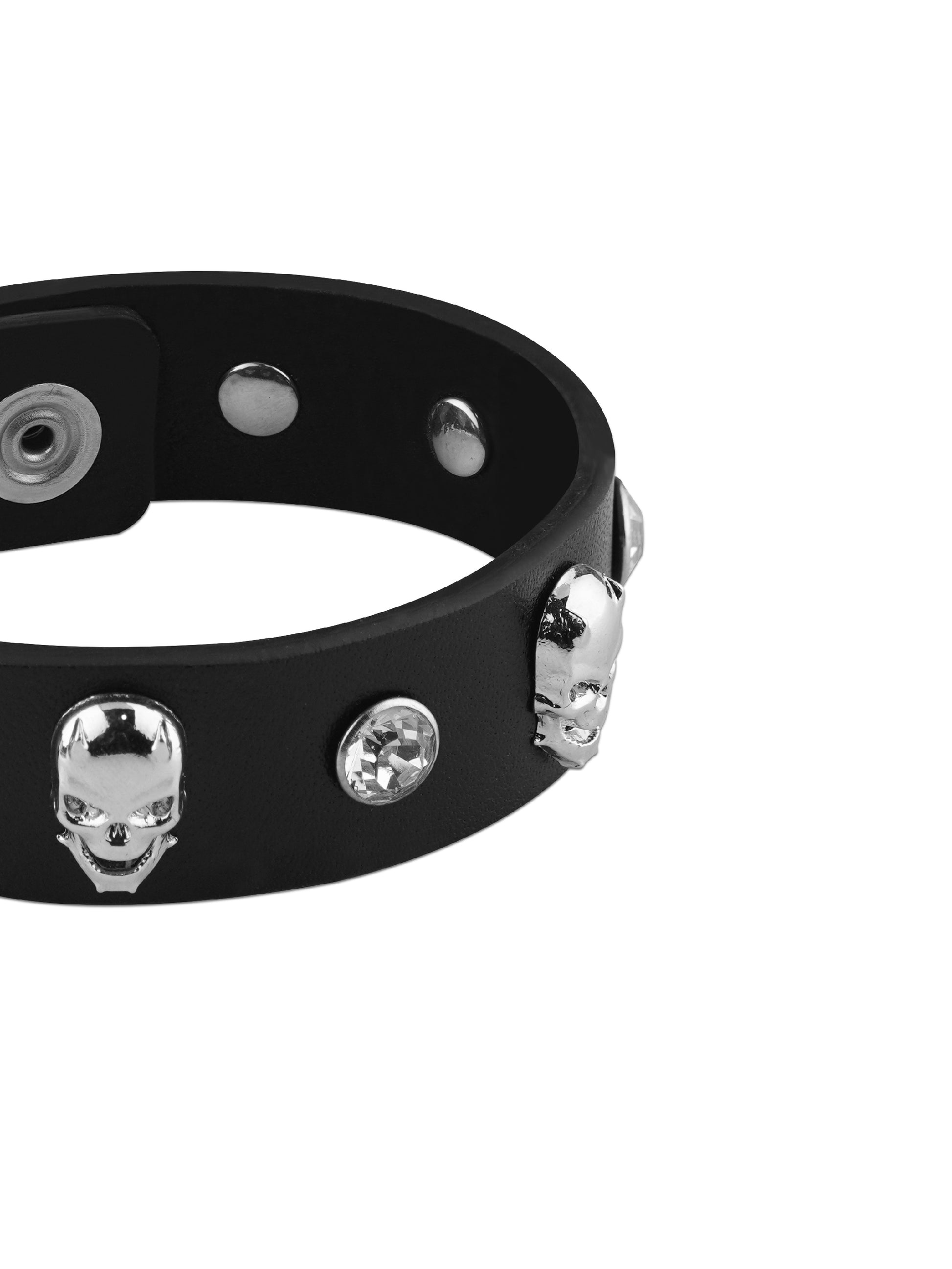 El cuero de primera calidad forma la base de la pulsera, ofreciendo suavidad y durabilidad. Cada cristal se engasta a mano para lograr el máximo brillo, mientras que las piezas metálicas en forma de calavera se funden en aleación con un acabado pulido, creando un contraste impactante de texturas.