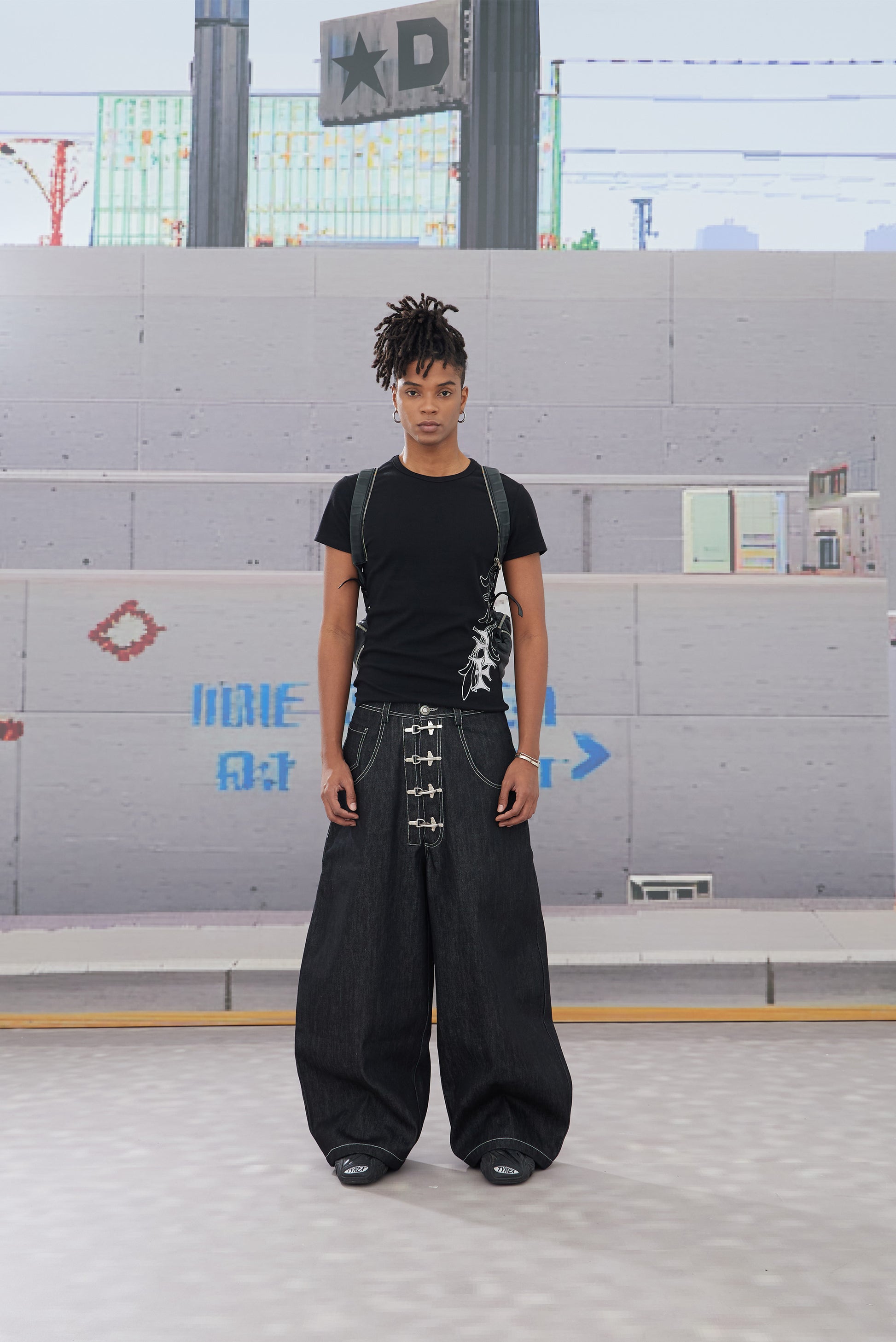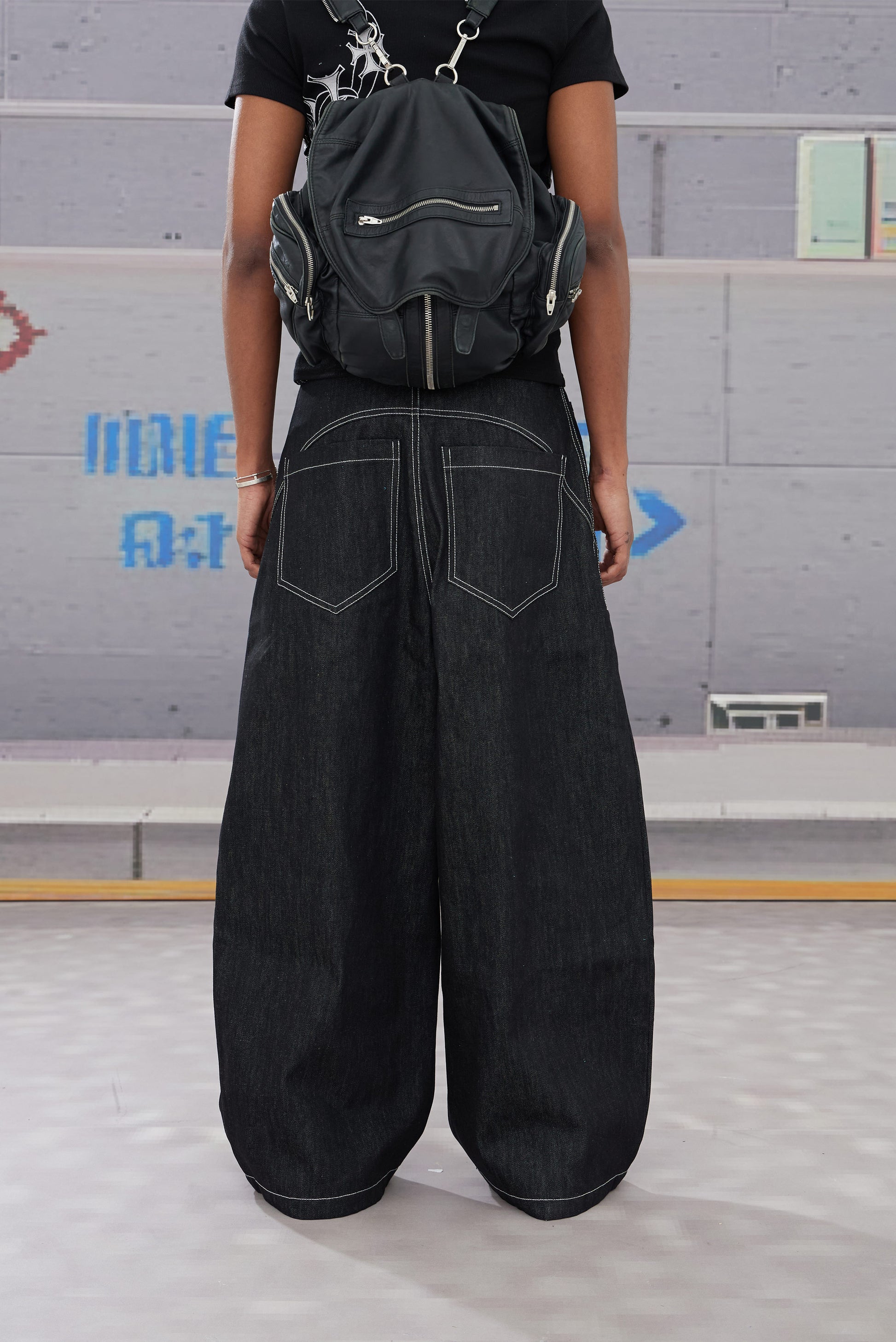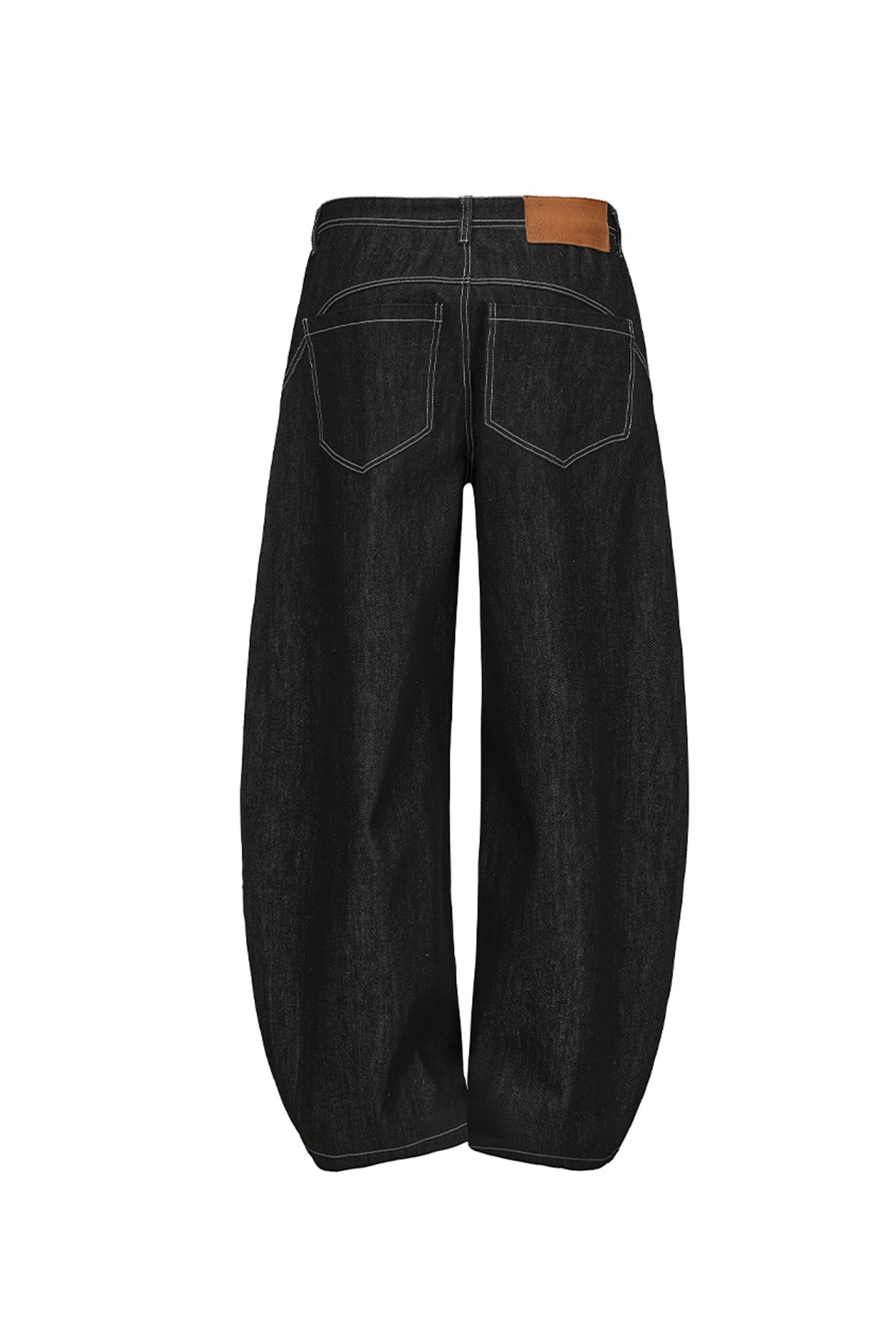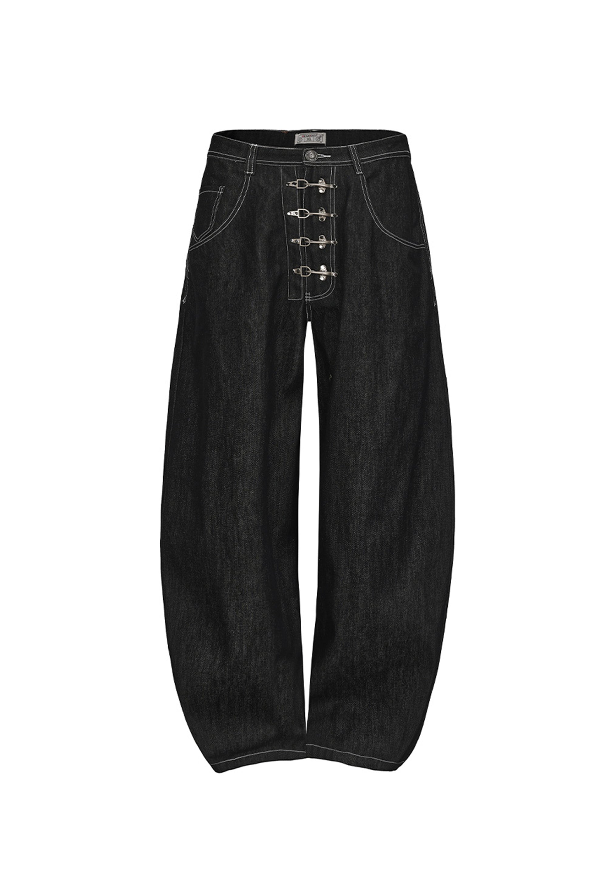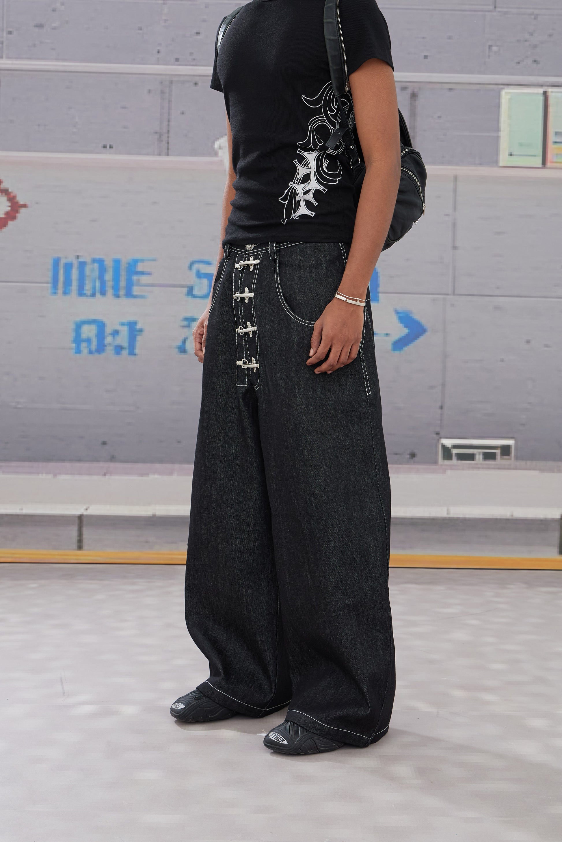 Crafted from raw denim, this black jean carries a vintage tone with a modern edge. The loose silhouette embodies an effortless street attitude, while the row of exposed button fly hardware at the front breaks convention with a bold, avant-garde touch. Classic black meets distinctive detailing — easy to style, hard to ignore. Step out and own your look.