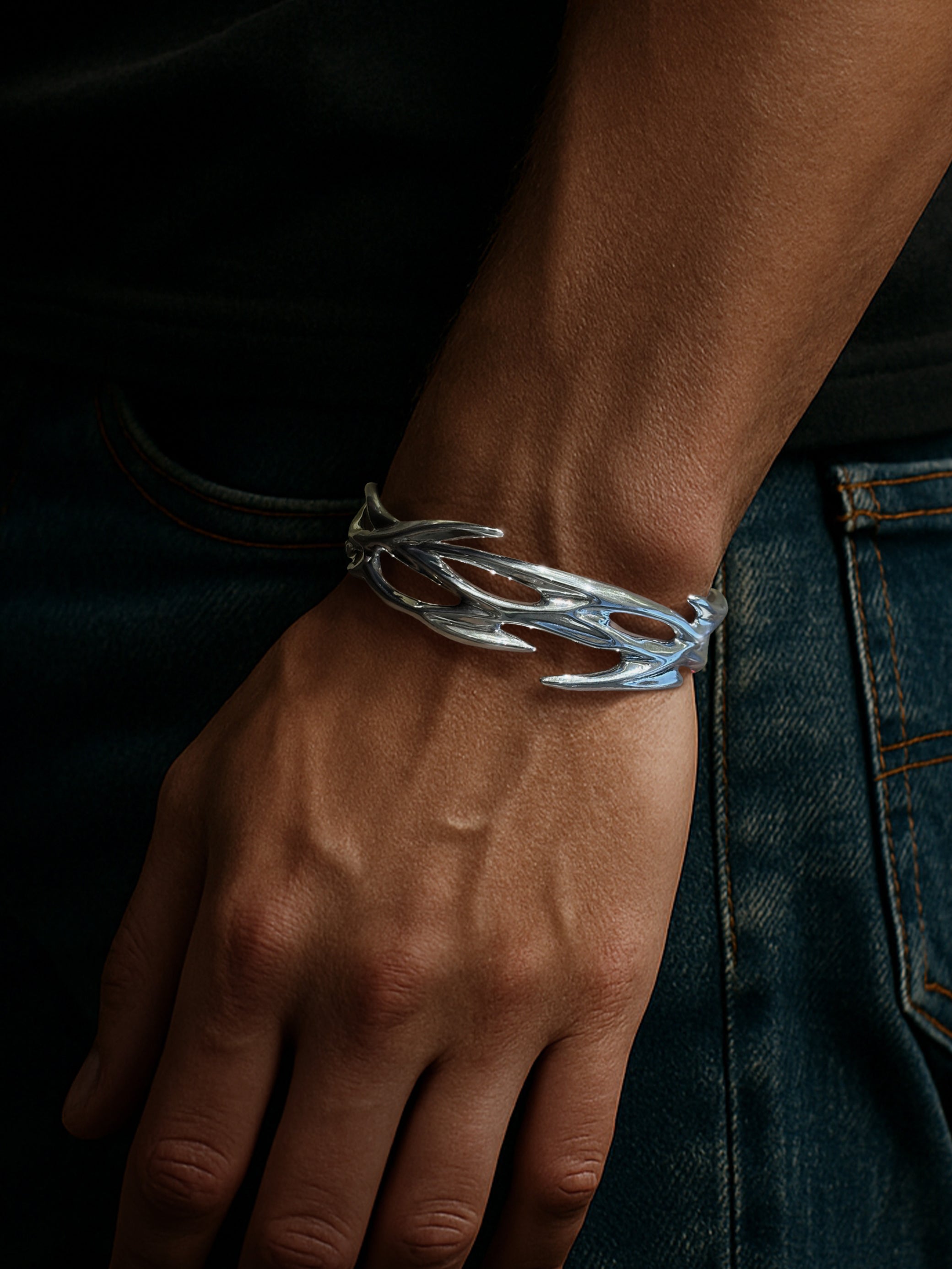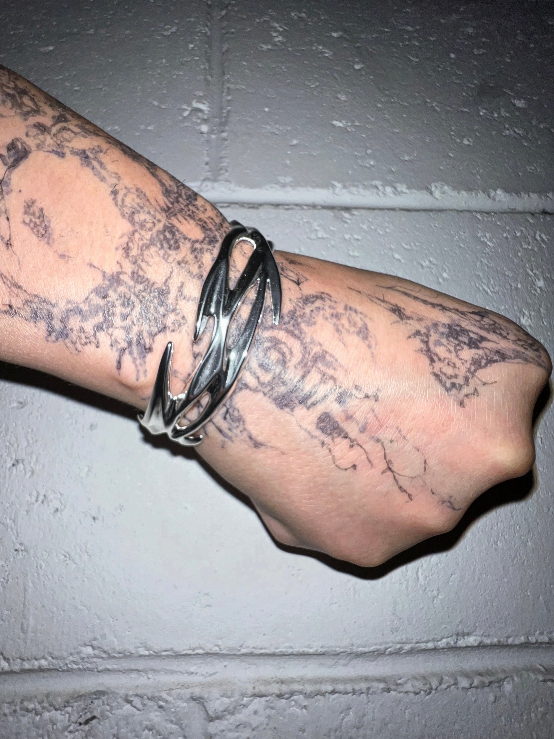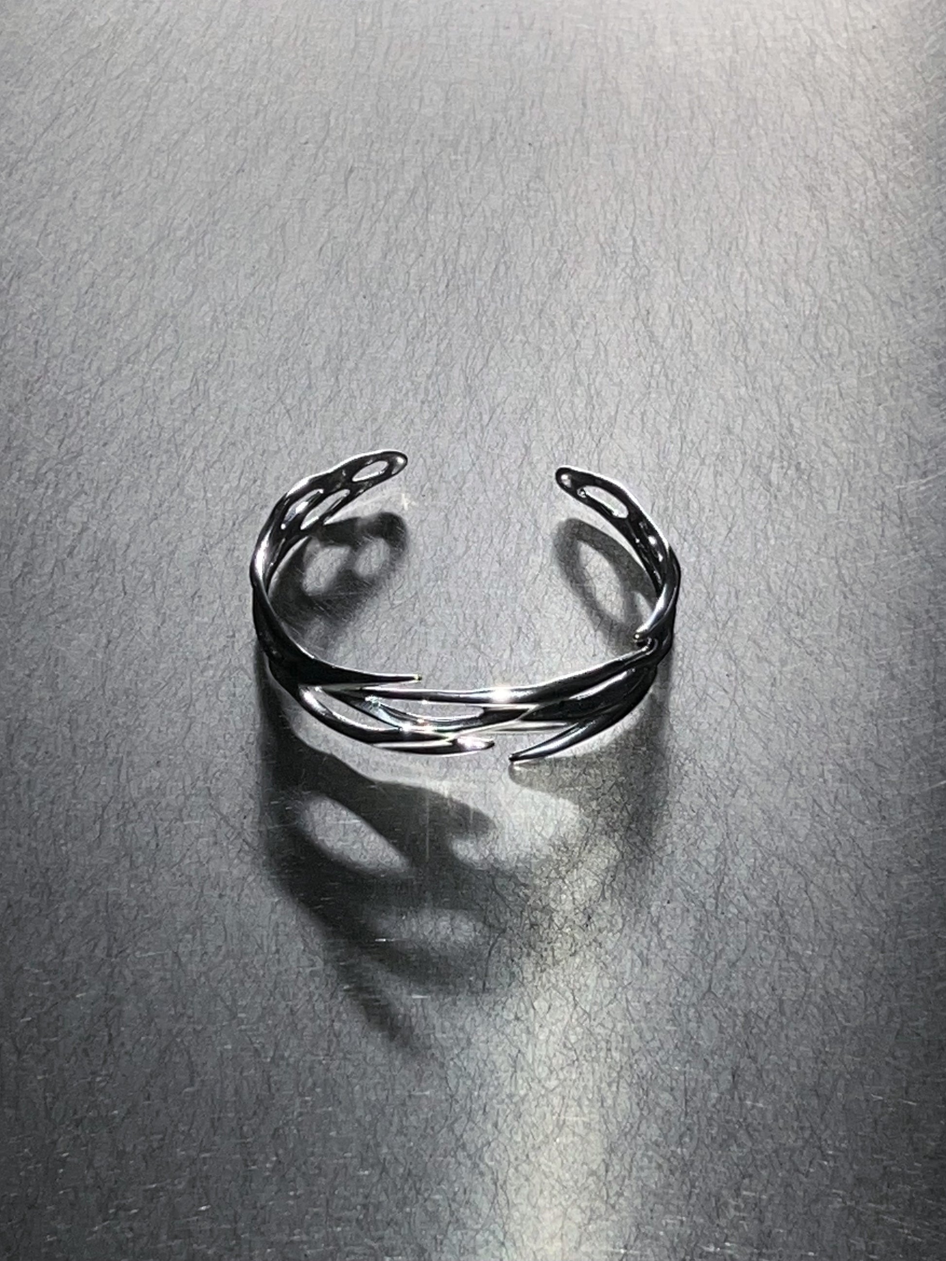 Conçu en exclusivité par HOWSS, FLUXFANG capture le chaos brut du métal en fusion au moment du coulage — un instant où chaleur, mouvement et déformation ne font plus qu’un. Avec ses courbes dynamiques et ses crêtes évidées, il évoque des griffes nées d’un fleuve d’argent, entre liquide et lame.