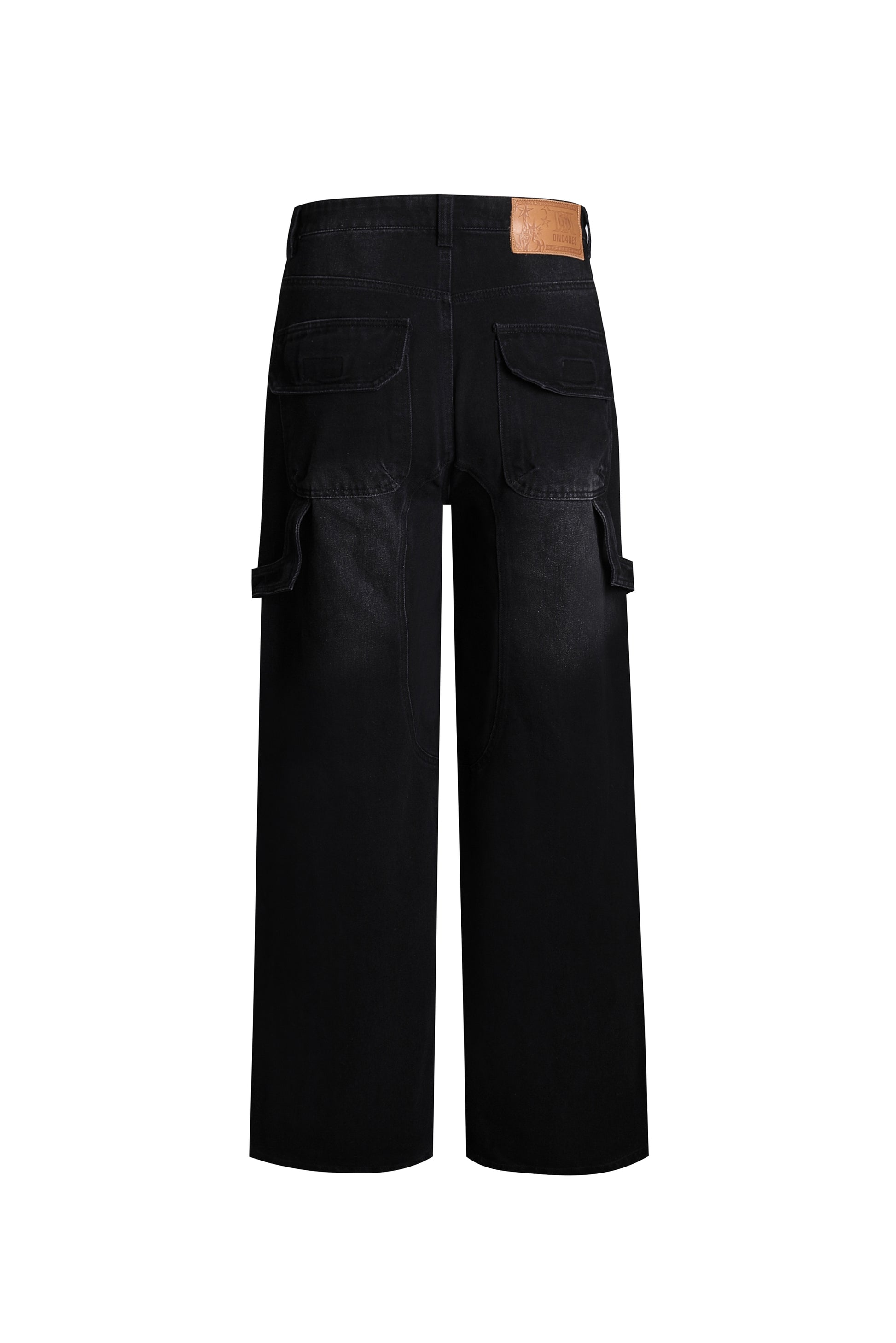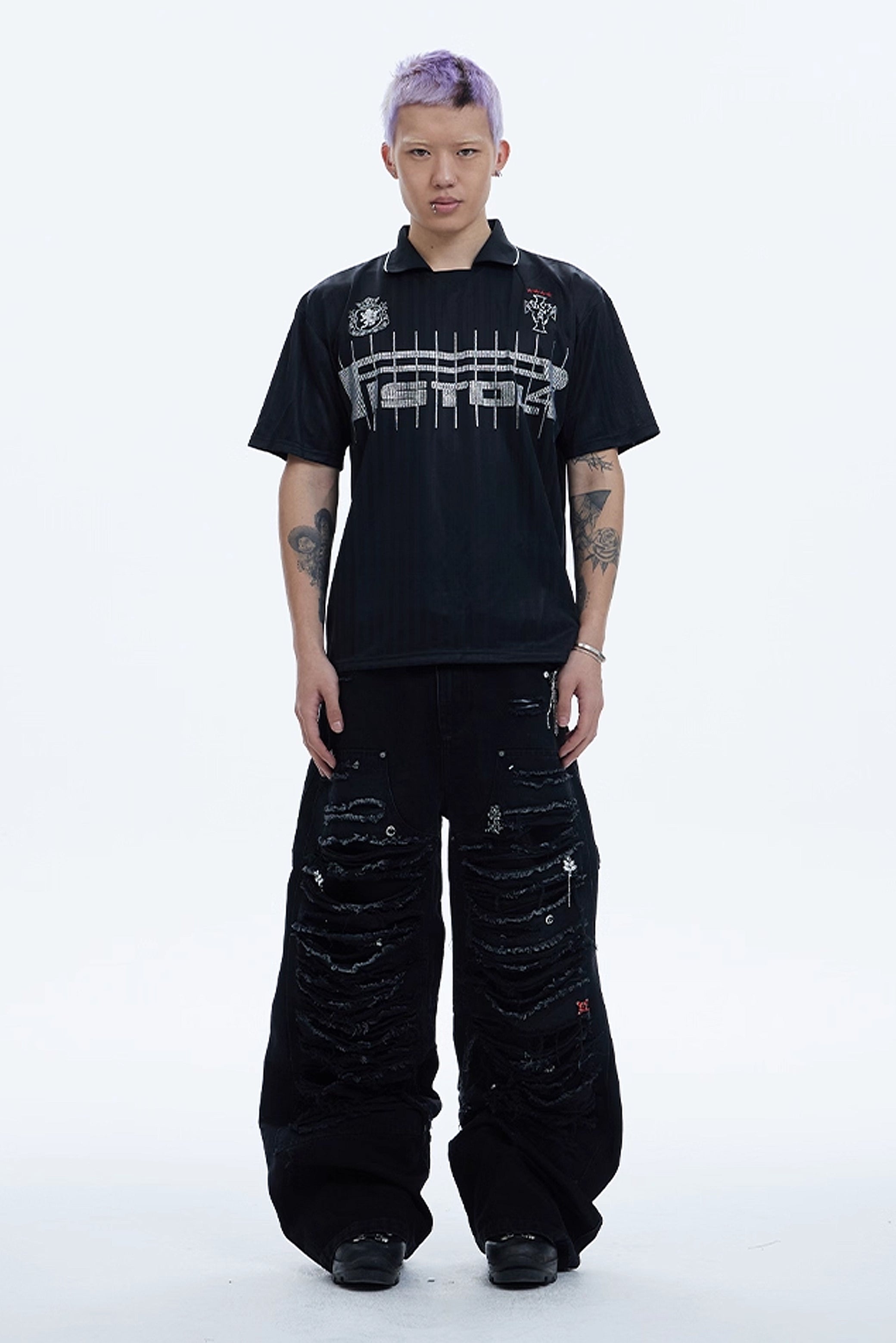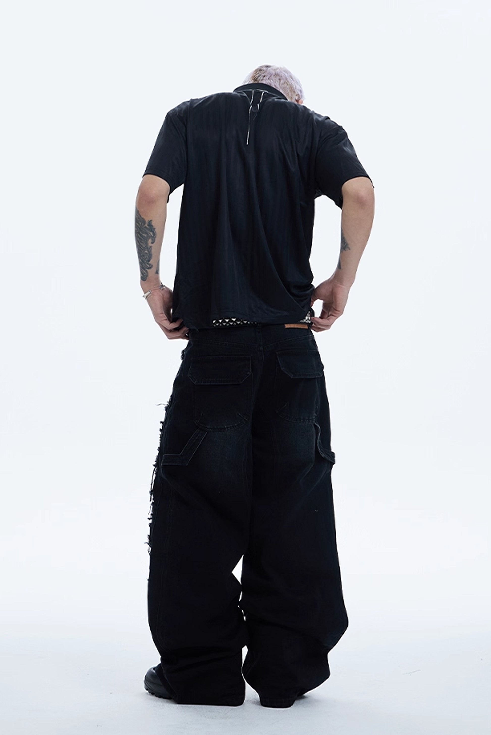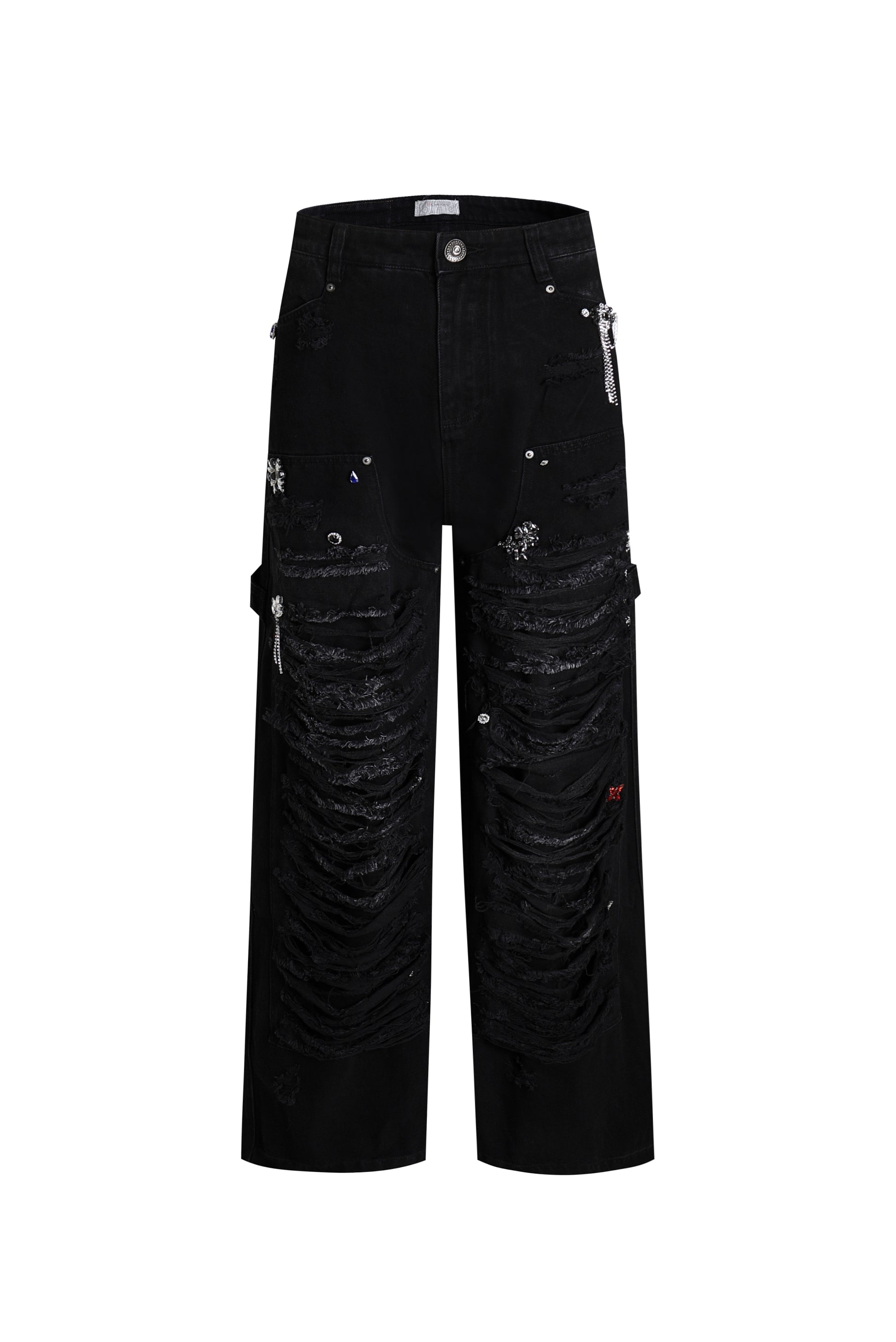 Questo paio di jeans carpenter adotta una silhouette extra ampia, con ginocchia strappate e sfrangiate per un look grunge vissuto. Le applicazioni simili a gemme aggiungono un tocco appariscente in stile streetwear. Lavati e invecchiati con accessori selezionati, questi jeans emanano un fascino vintage naturale e una struttura scolpita. Ovunque tu sia, si distinguono come capo d’impatto.