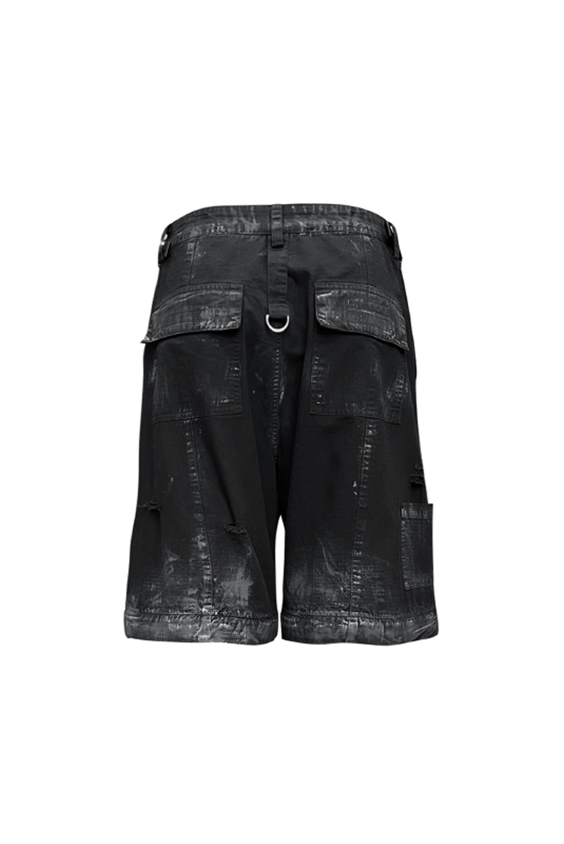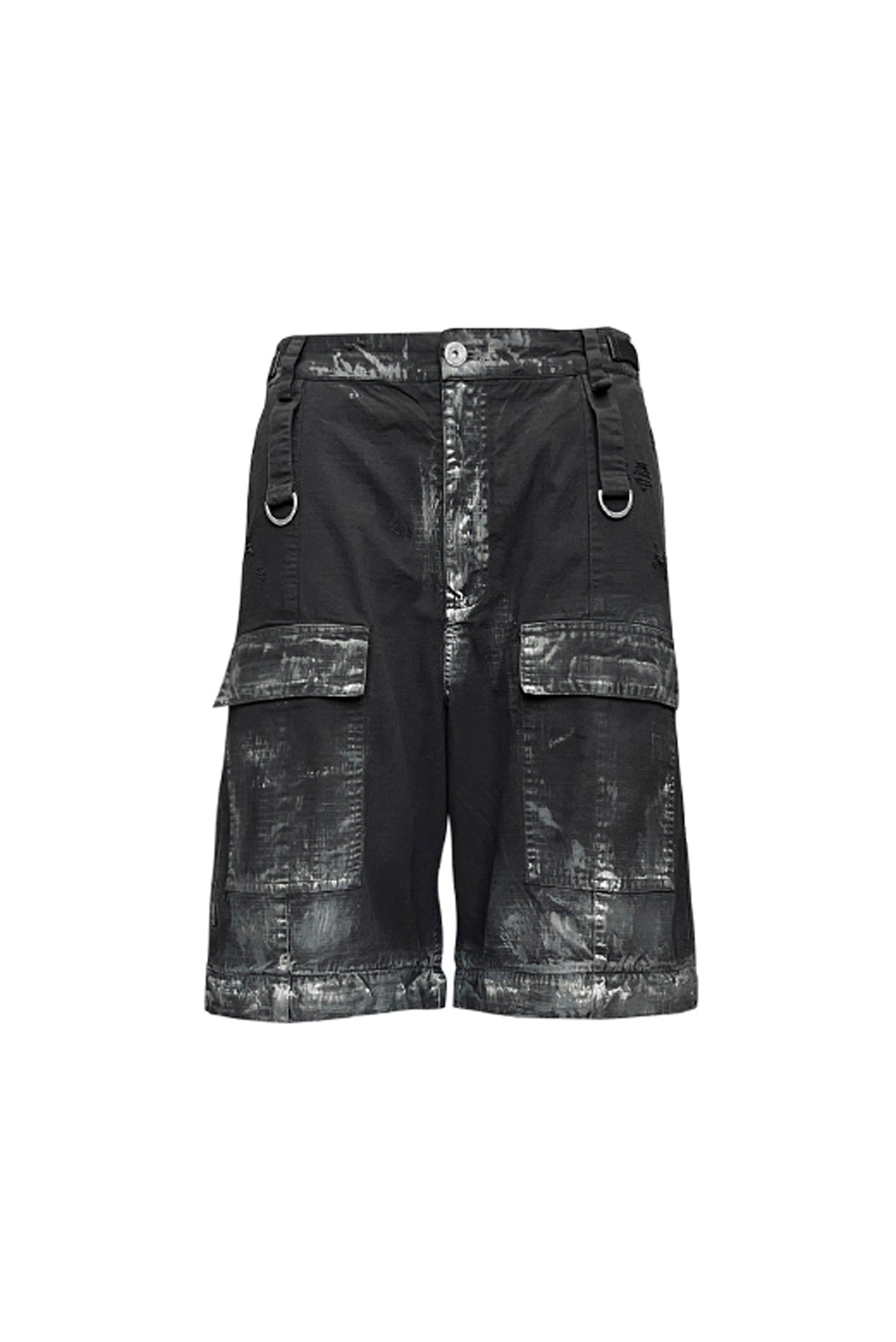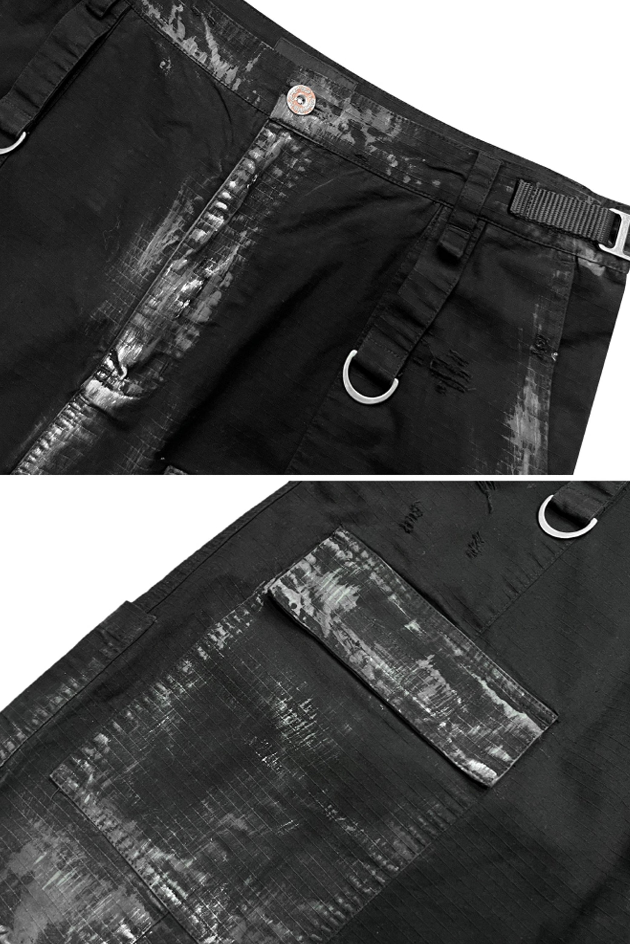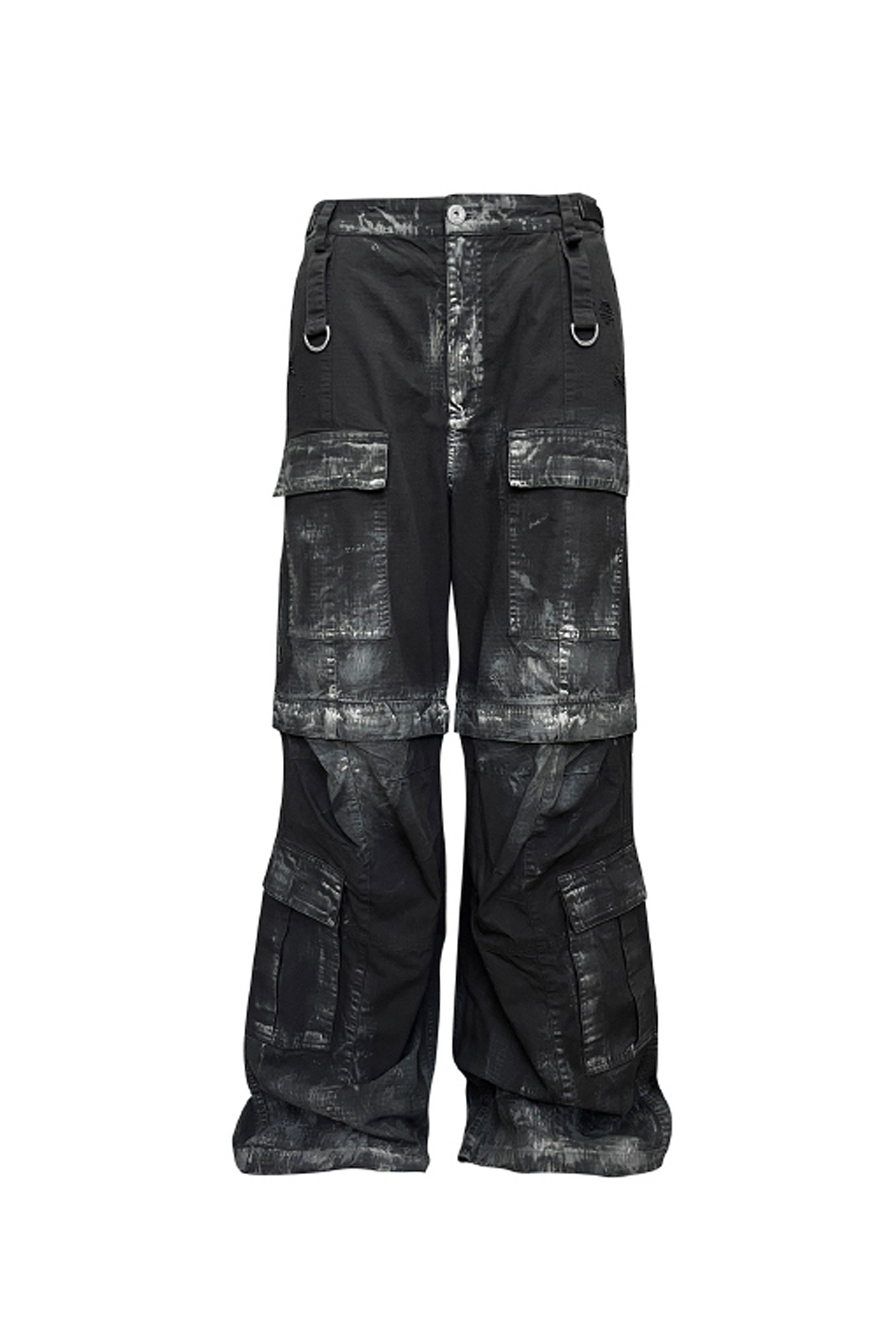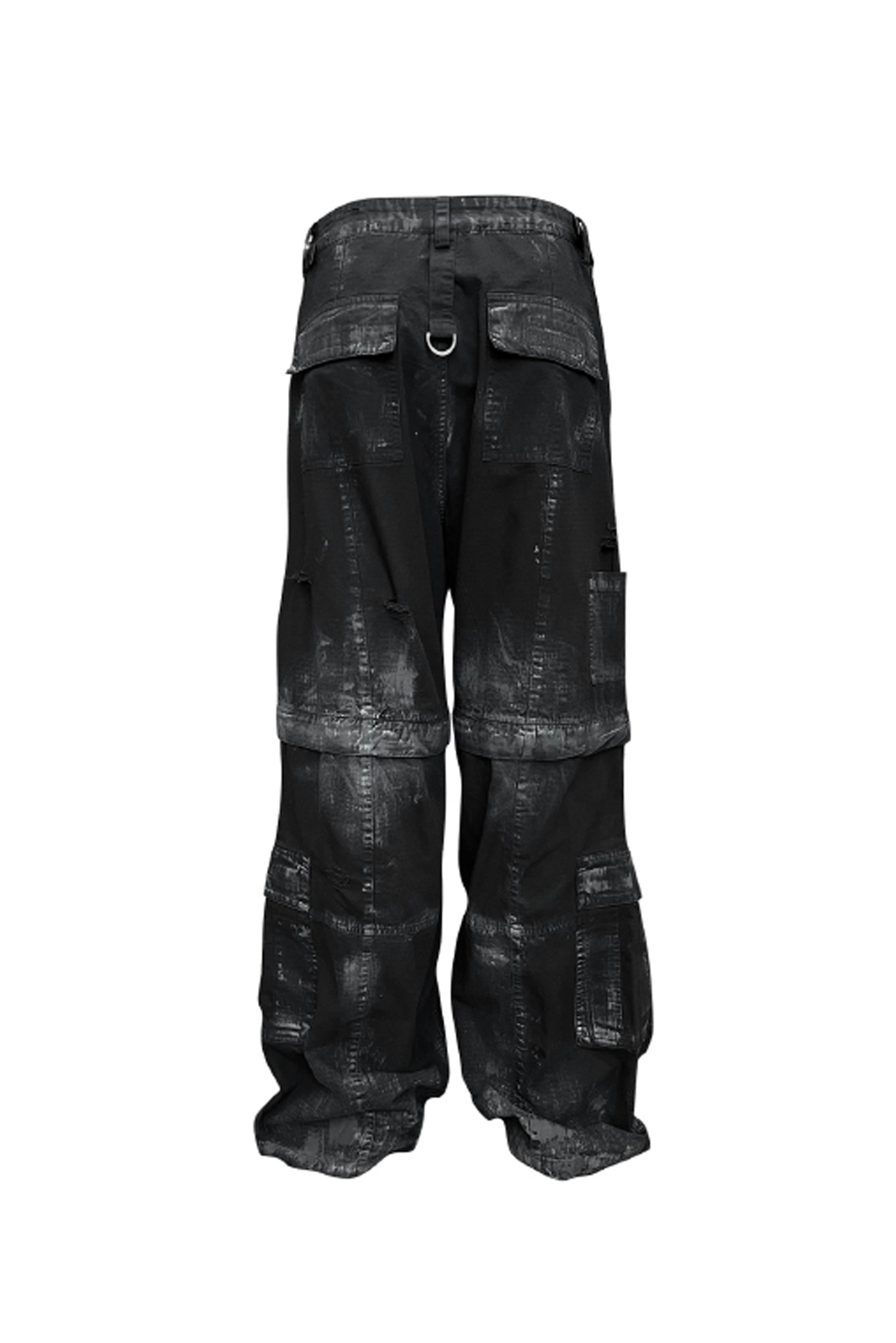 • Adjustable waistband with worn metal buckles and sandblasted texture.