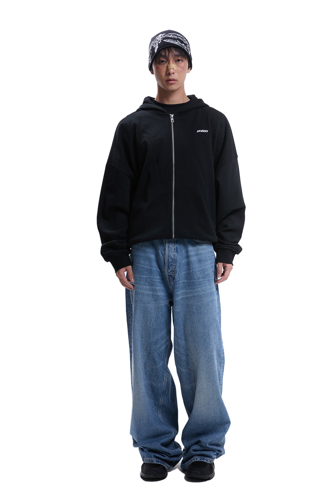 胸の下にHOWSSロゴの刺繍が施された黒のオーバーサイズフーディー。日常使いに必須のアイテム。