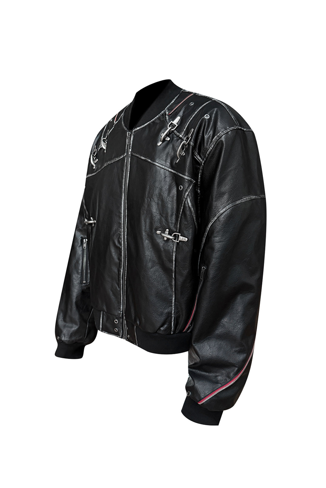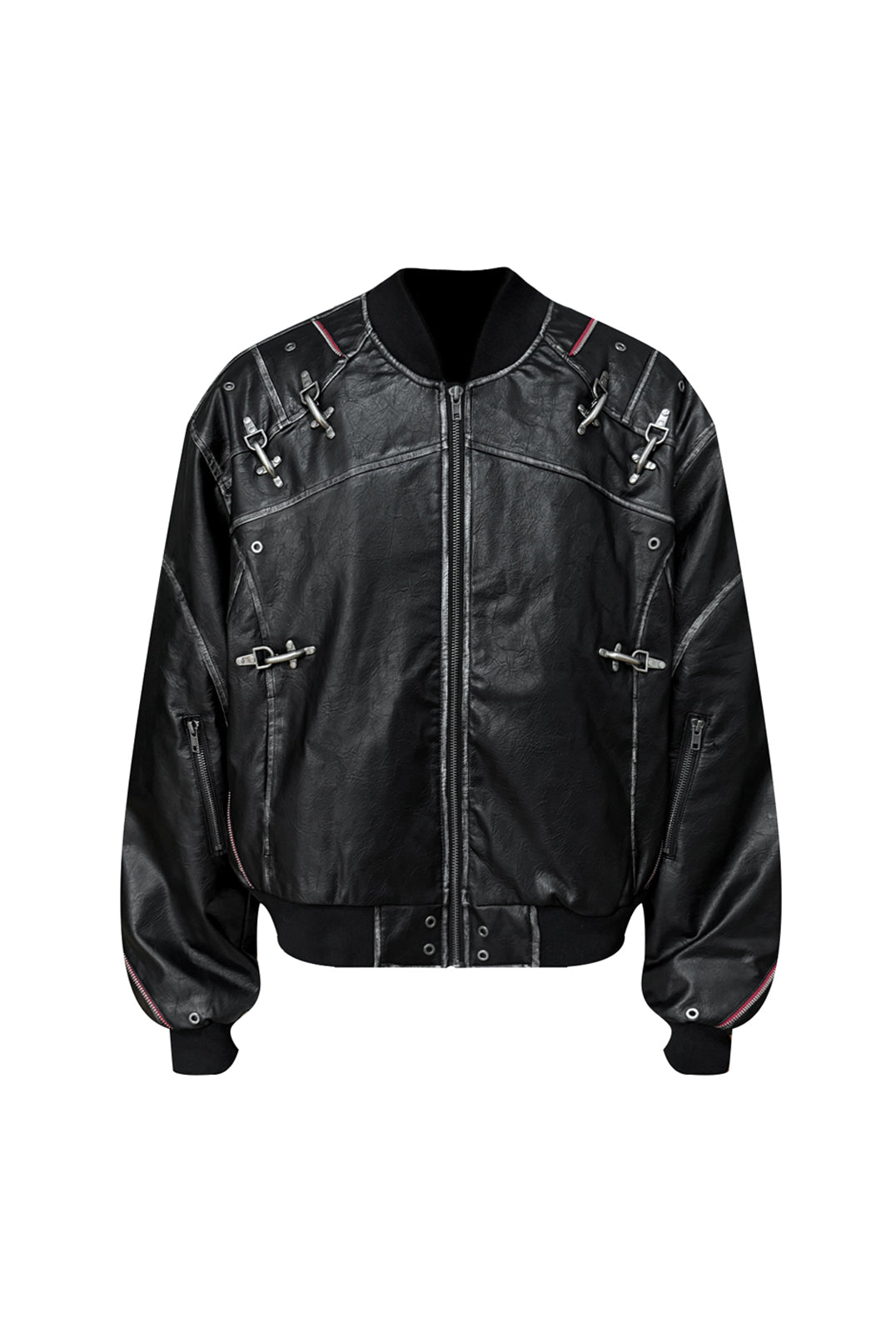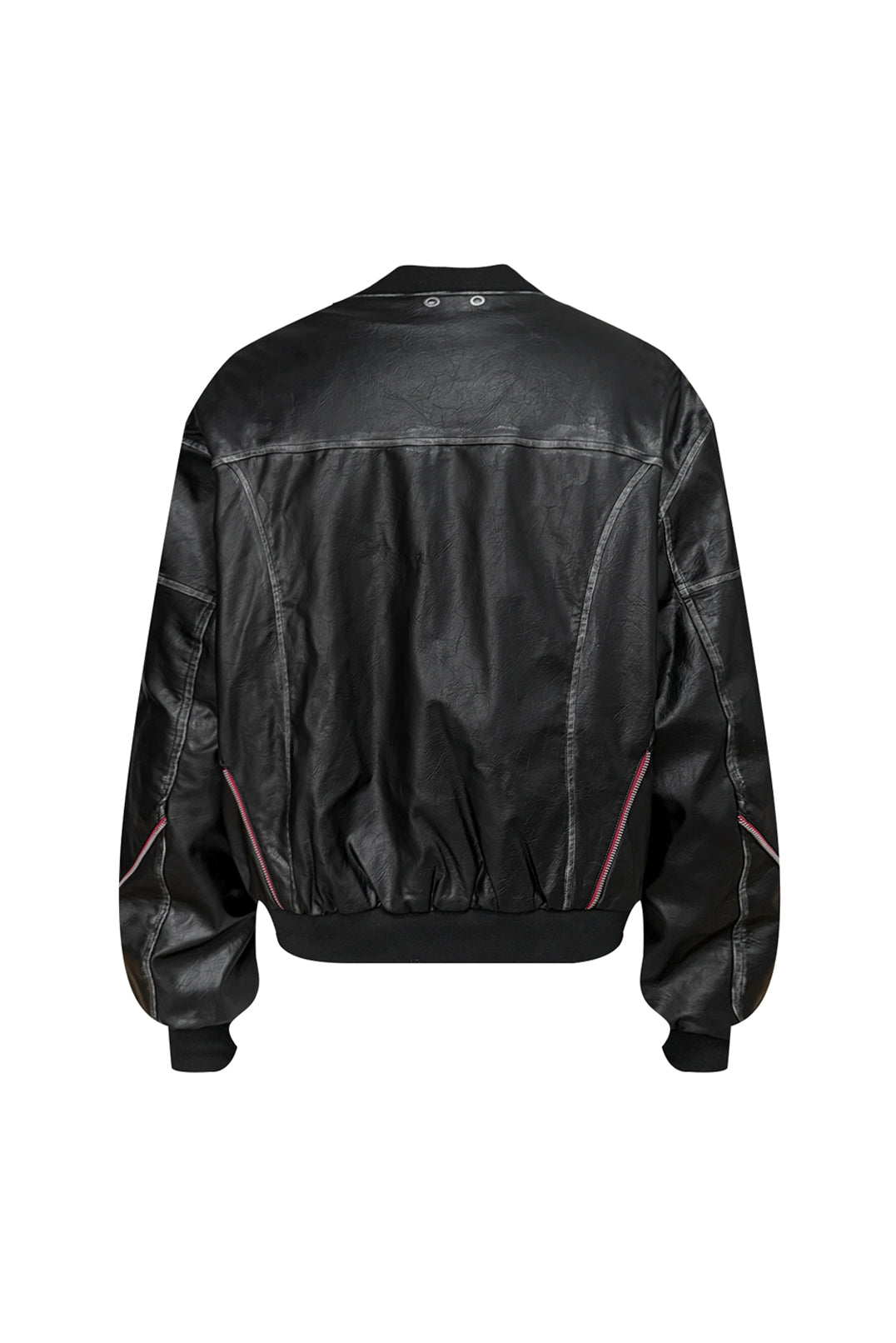 特別なウォッシュとダメージ加工を施したPUレザーを使用し、しっかりとしたハリを保ちながらも、自然な着慣れ感を表現。マルチパネル構造がデザイン全体に奥行きを与え、各シームにはカスタムのダメージ加工を施すことでヴィンテージライクな表情をプラス。異素材ミックスのメタルパーツとコントラストの効いたジッパーテープが鋭いビジュアルアクセントとなり、クロップド幅とワイドショルダーのカッティングが、着用時に力強く指揮的な存在感を生み出します。