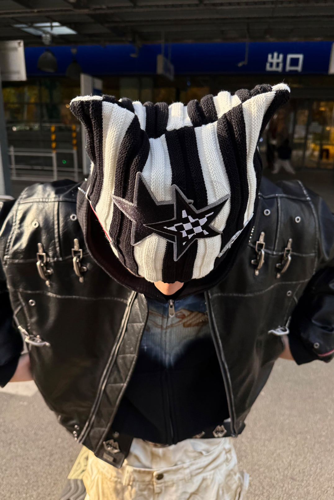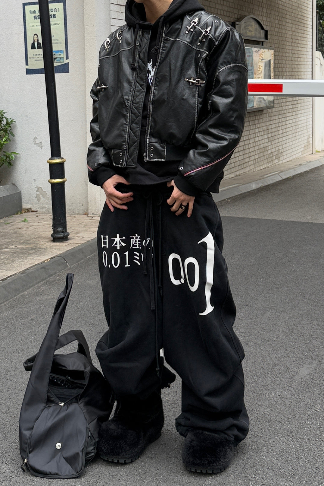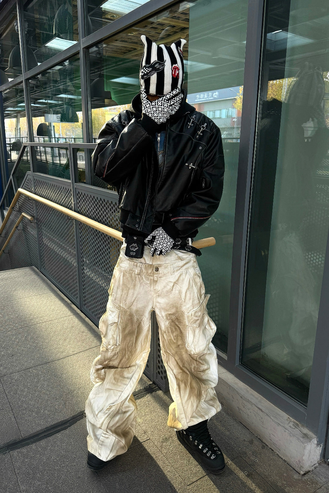 特別なウォッシュとダメージ加工を施したPUレザーを使用し、しっかりとしたハリを保ちながらも、自然な着慣れ感を表現。マルチパネル構造がデザイン全体に奥行きを与え、各シームにはカスタムのダメージ加工を施すことでヴィンテージライクな表情をプラス。異素材ミックスのメタルパーツとコントラストの効いたジッパーテープが鋭いビジュアルアクセントとなり、クロップド幅とワイドショルダーのカッティングが、着用時に力強く指揮的な存在感を生み出します。