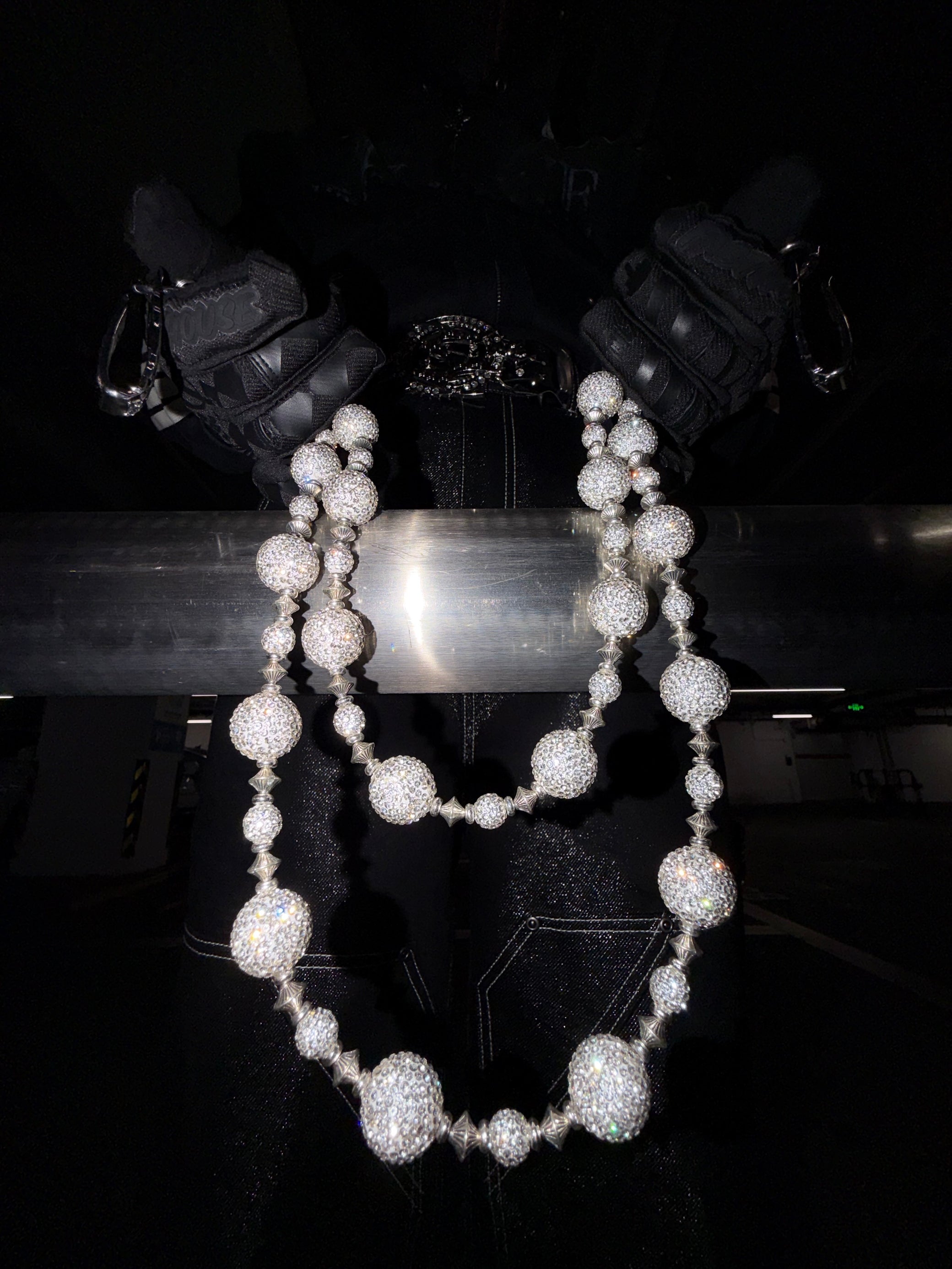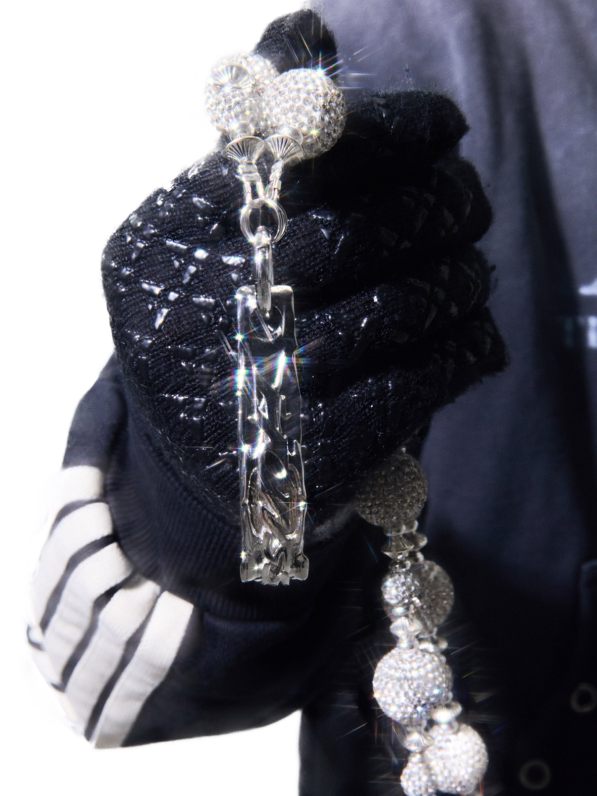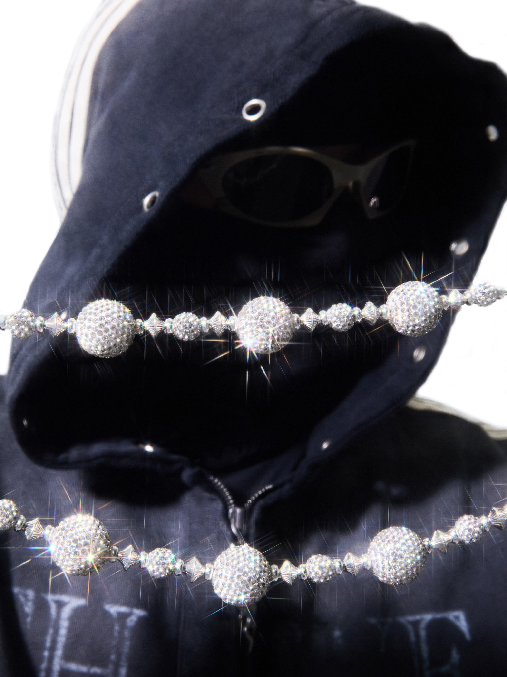 各ラウンドリンクには光学グレードのレジンを手作業でセットし、クリアラインストーンをフルに埋め込むことで、チェーン全体に均一でアイシーな輝きを生み出しています。