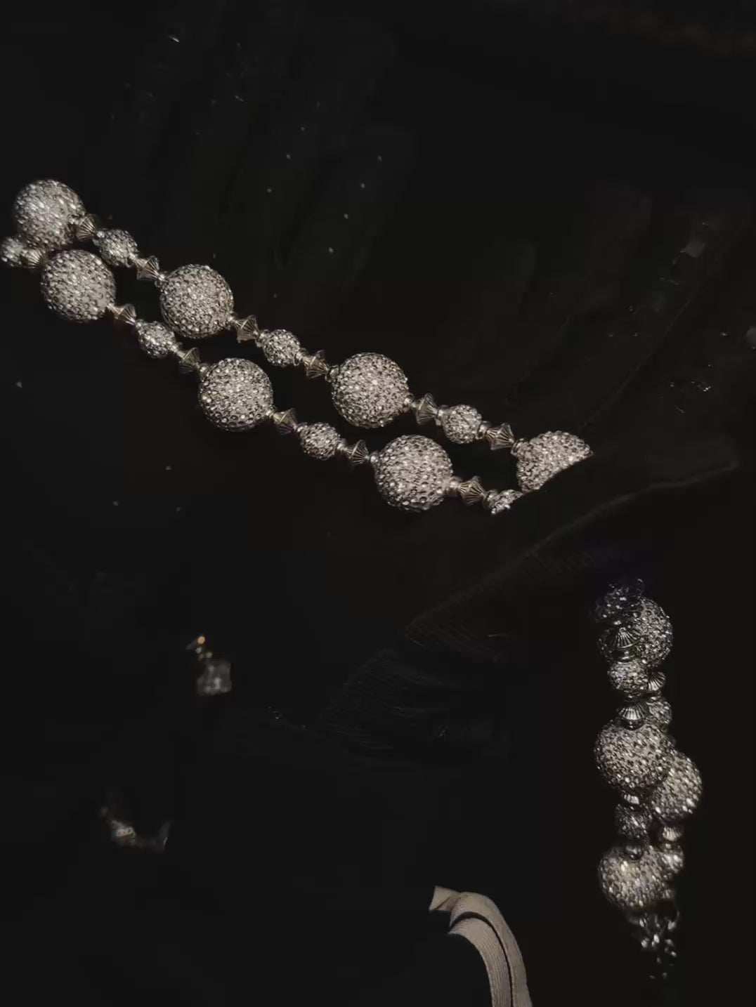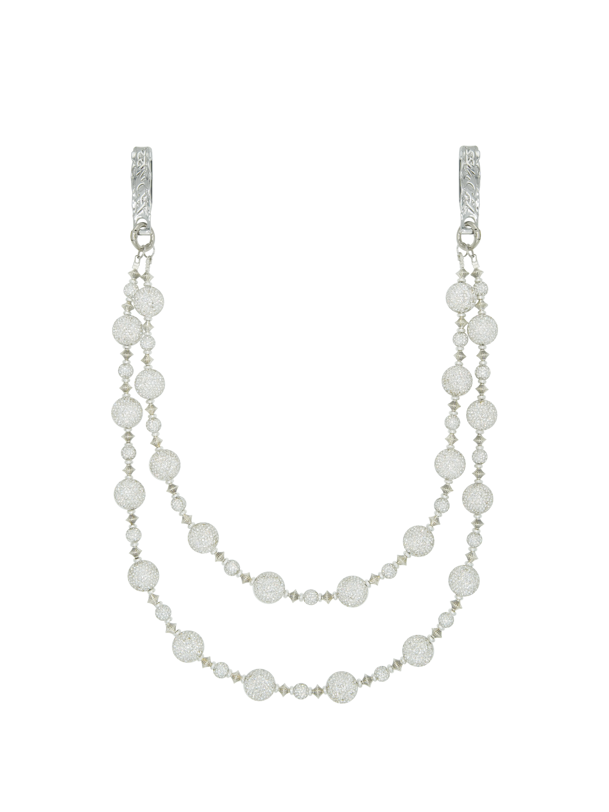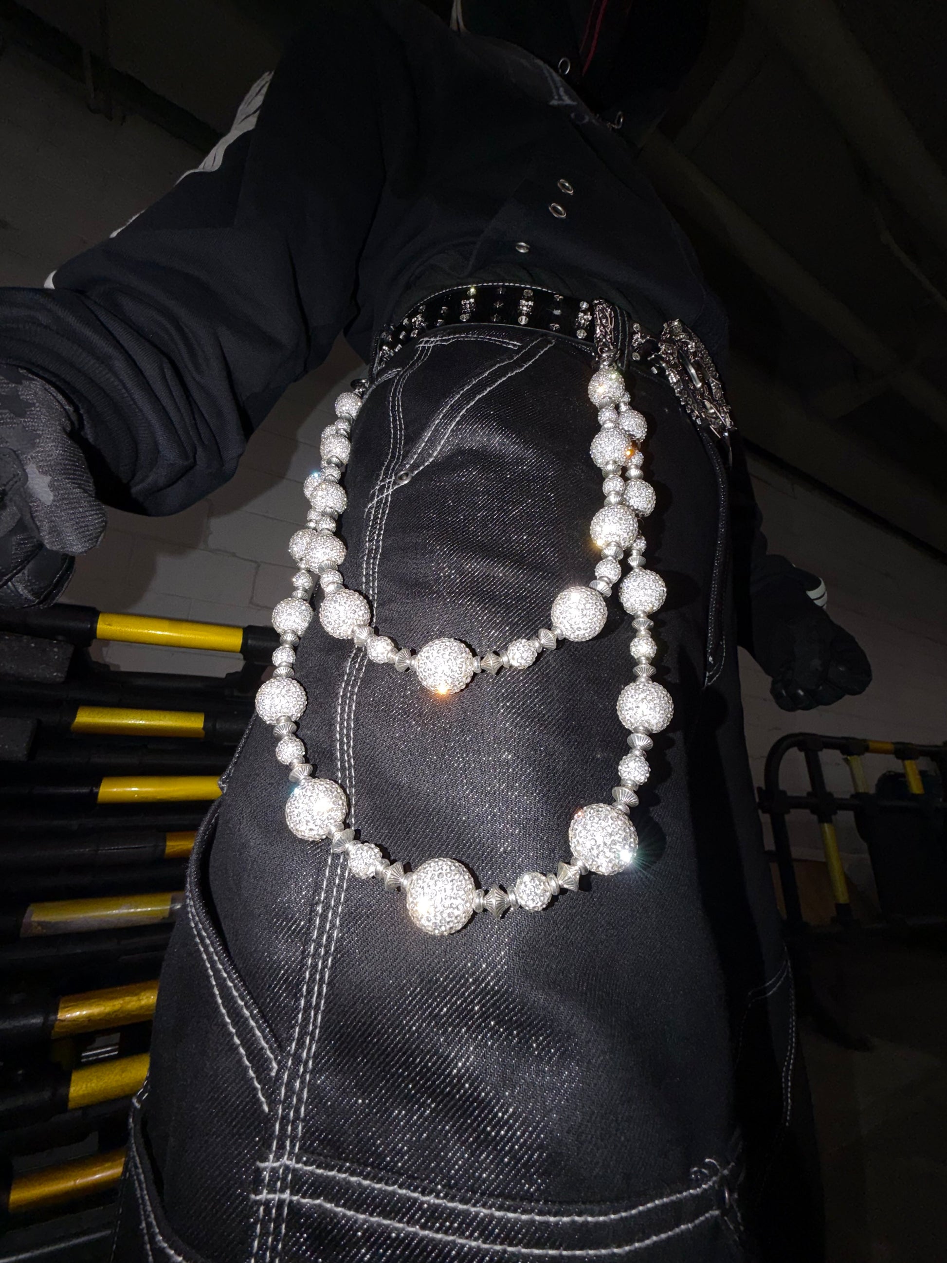 各ラウンドリンクには光学グレードのレジンを手作業でセットし、クリアラインストーンをフルに埋め込むことで、チェーン全体に均一でアイシーな輝きを生み出しています。