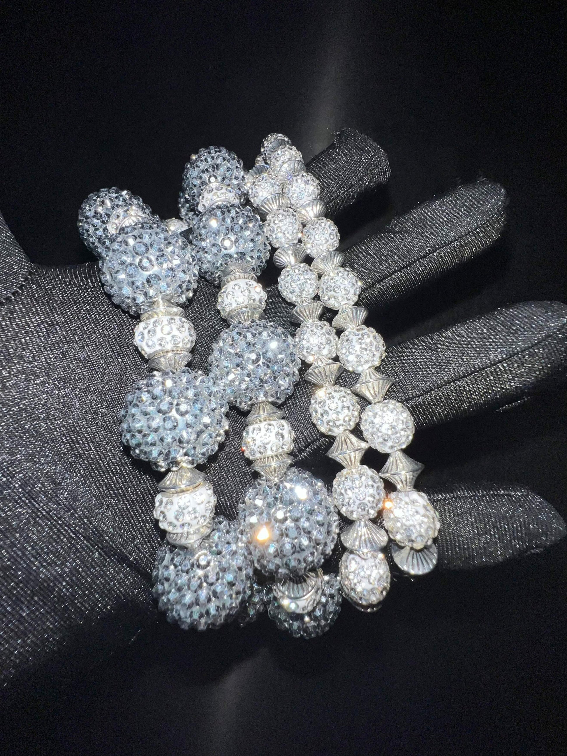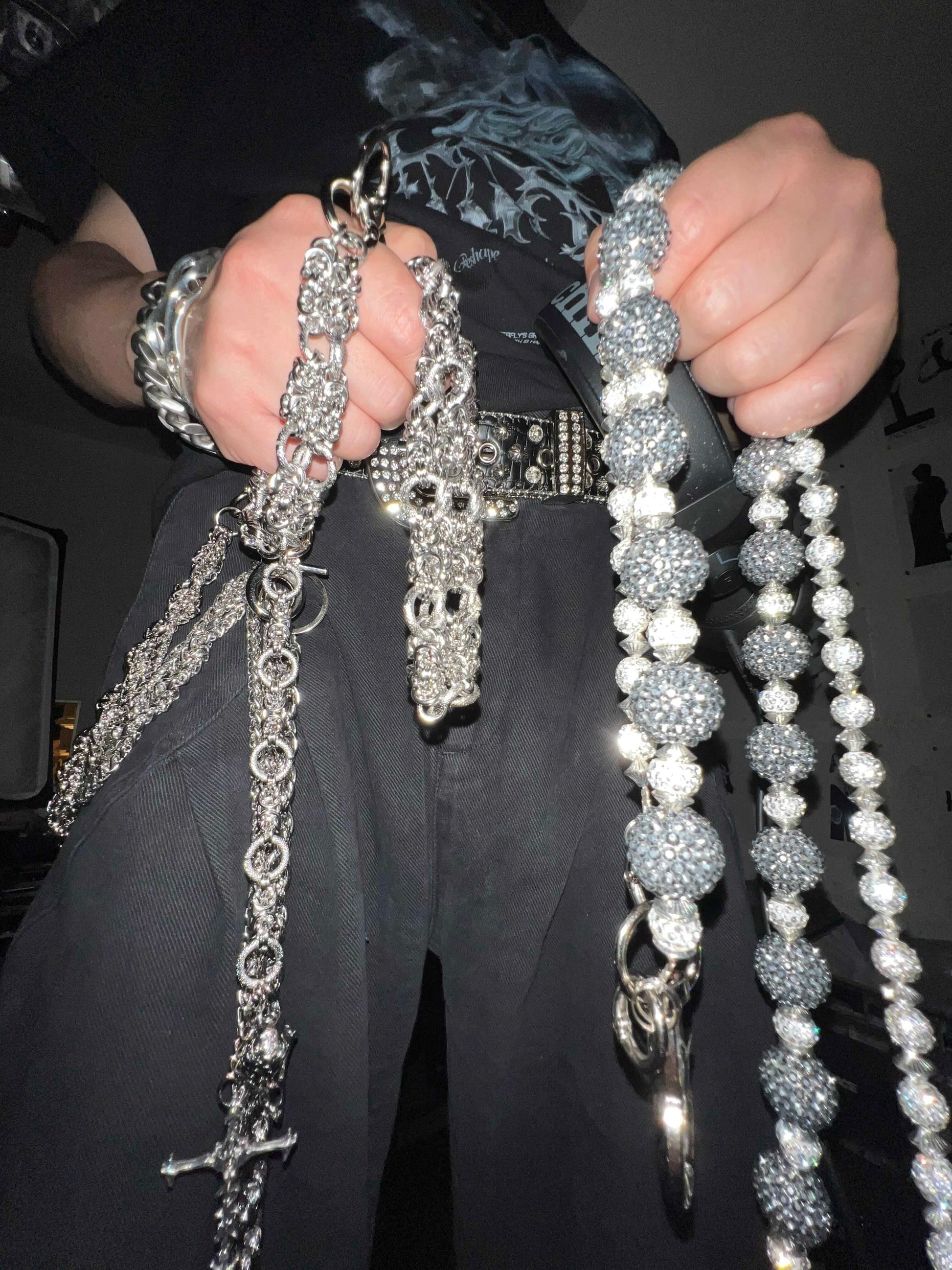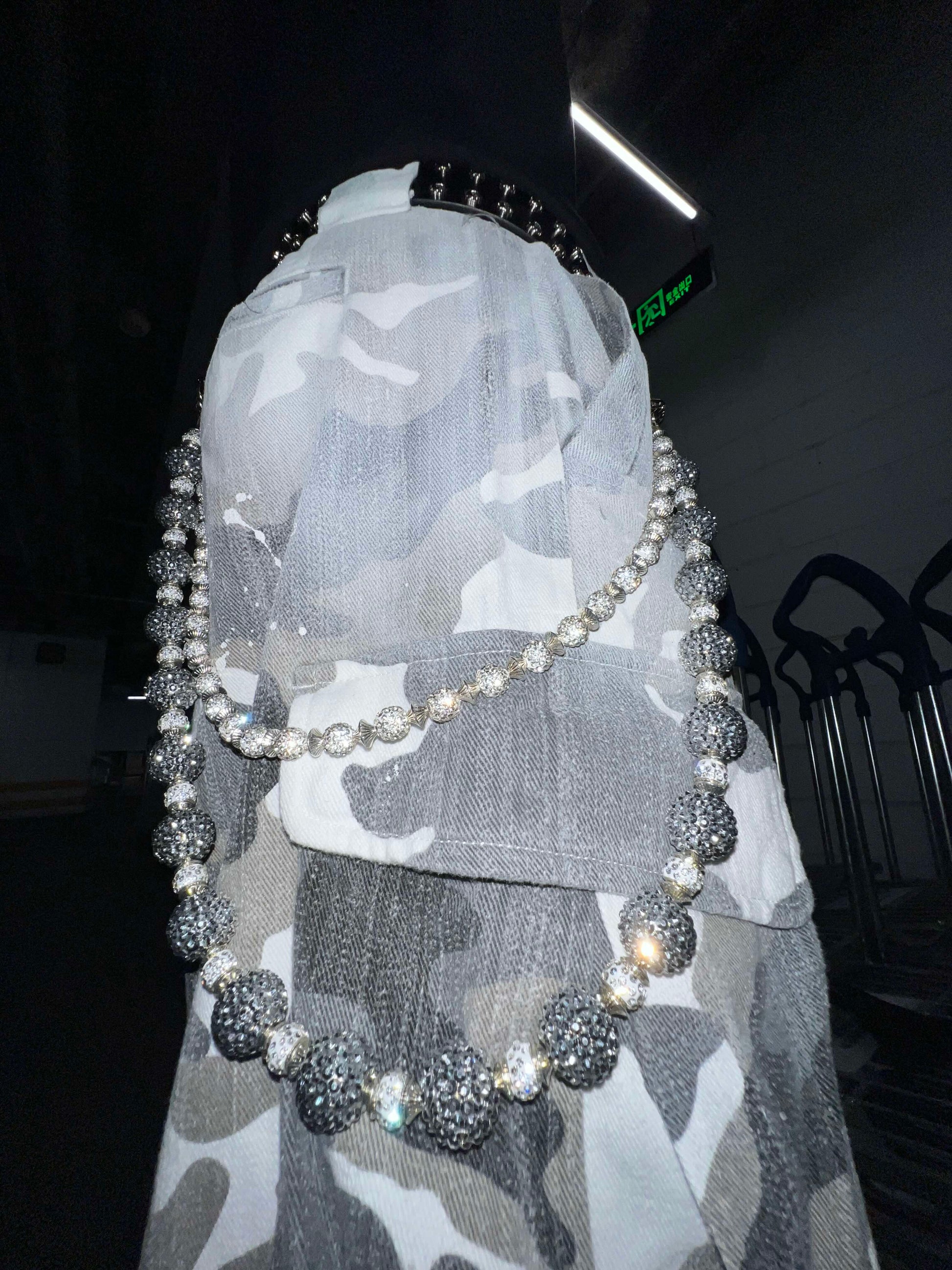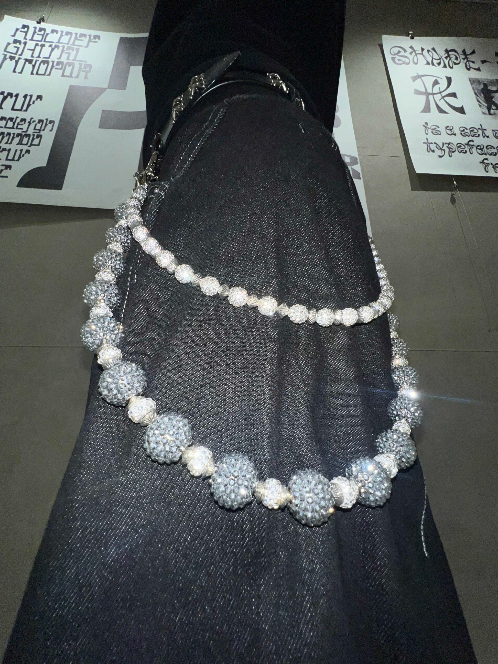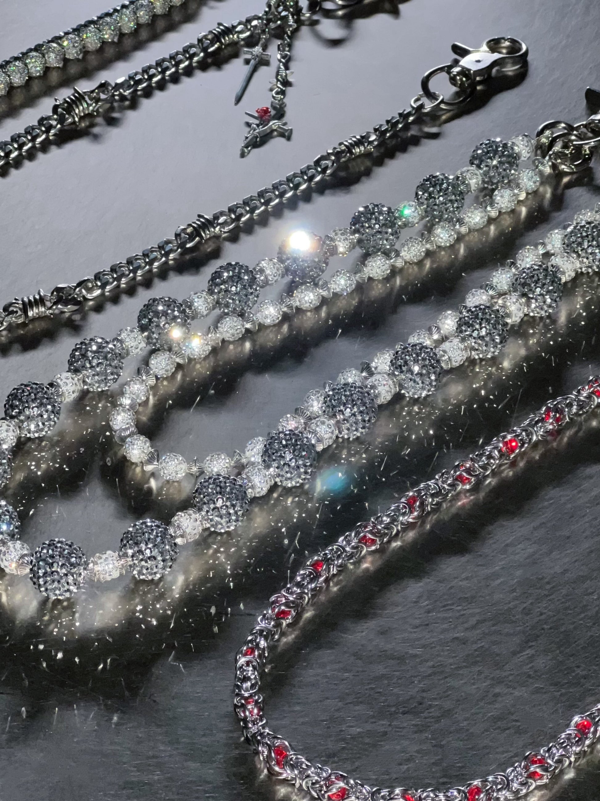 月光の静かな力を映すように手作業で仕上げたムーンリット・バブルチェーンは、柔らかさとエッジが共存するシルバー調の球体が連なるチェーン。各オーブは高密度レジンコアを持ち、セラミック調のアクセントを重ね、多面体の反射面でコーティング。最大限の輝きと耐久性のために電気メッキ加工され、自然なドレープを実現しています。