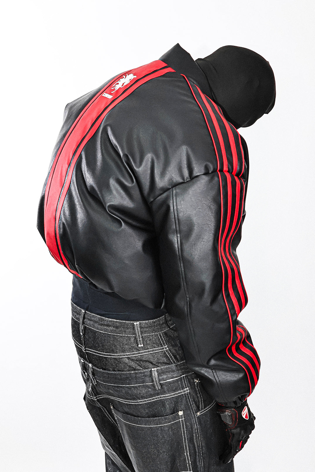 • Fifteen red leather strips in mixed materials run across the body, inspired by racing livery—varying widths create a sense of speed while adding layered visual depth.