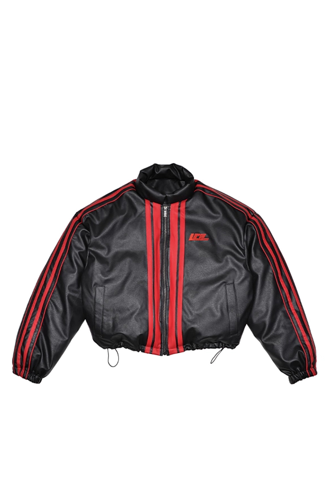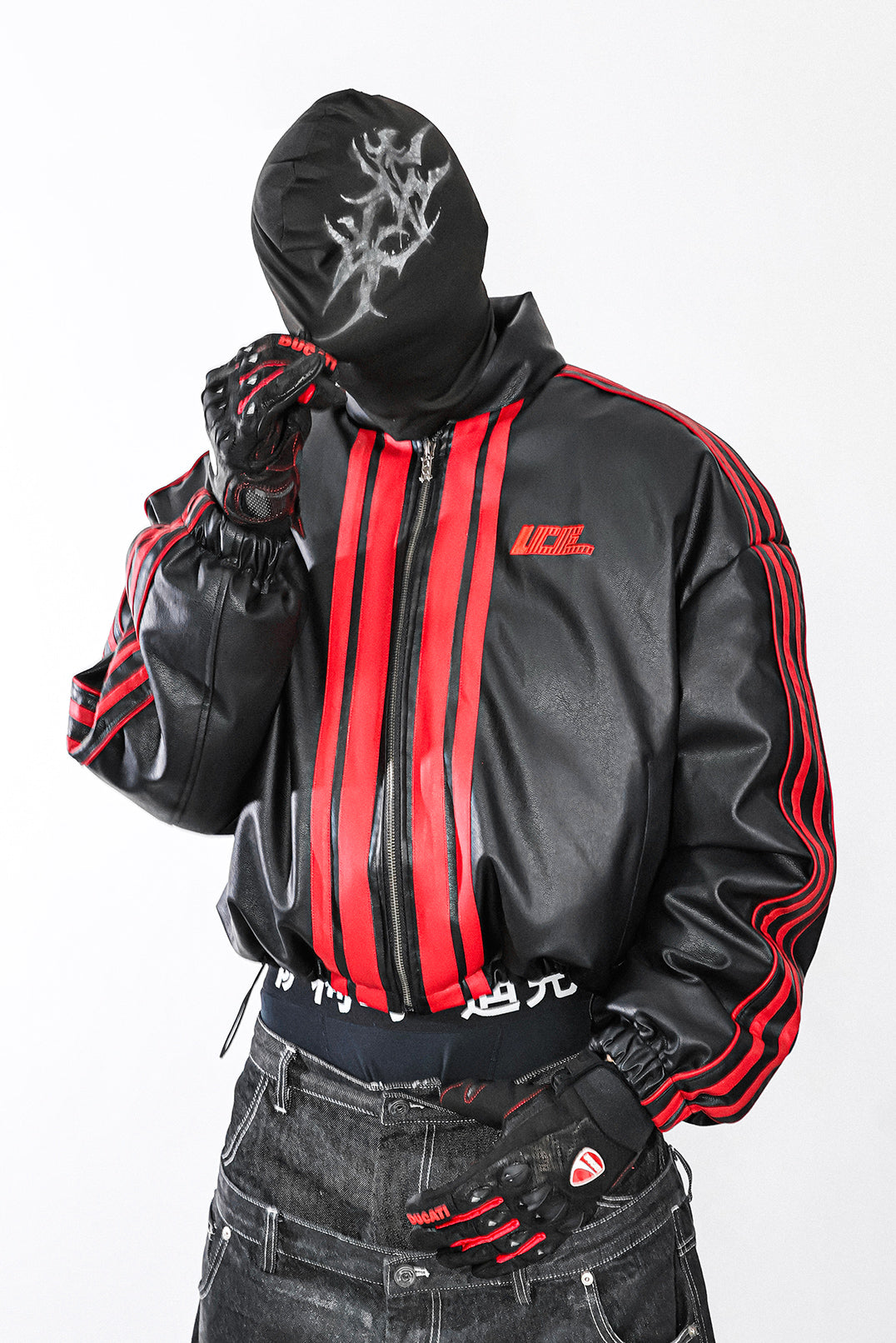• Made from a soft yet textured PU leather, the jacket delivers a dense handfeel with natural wind protection.