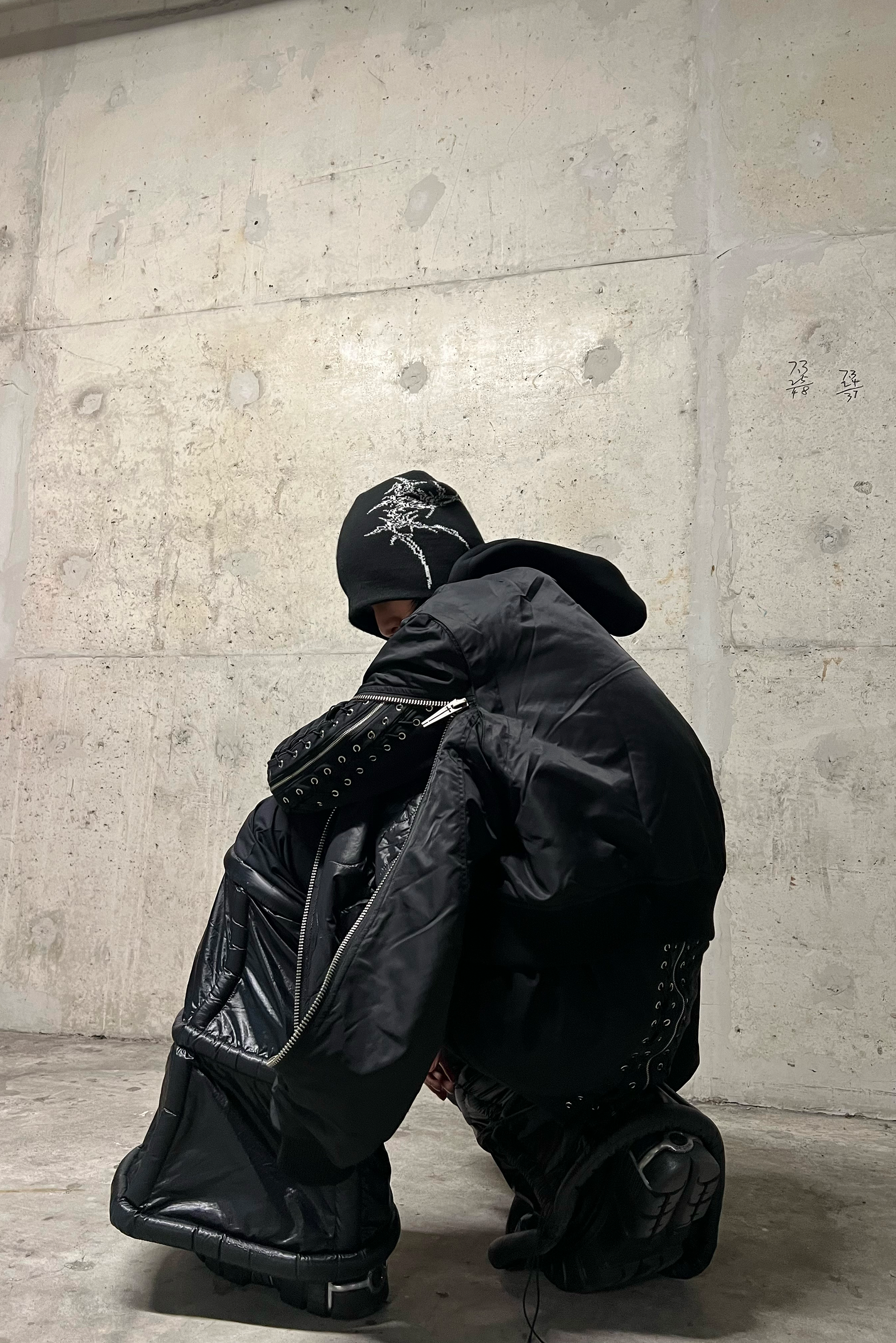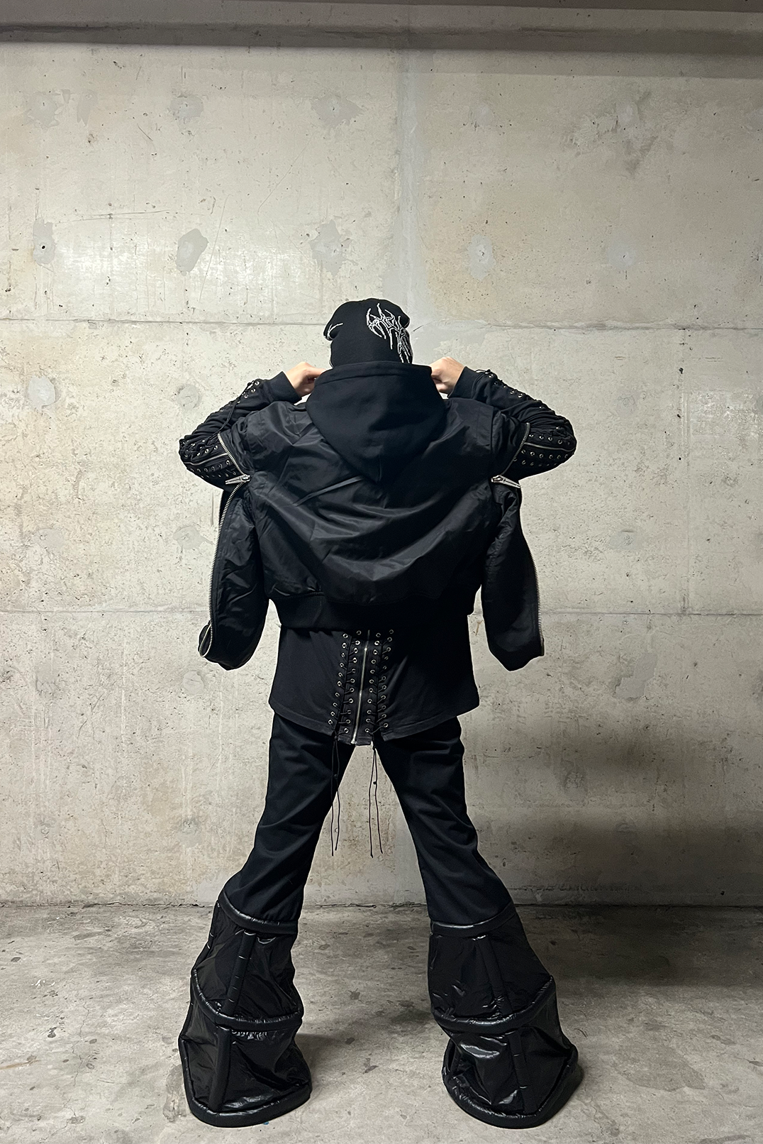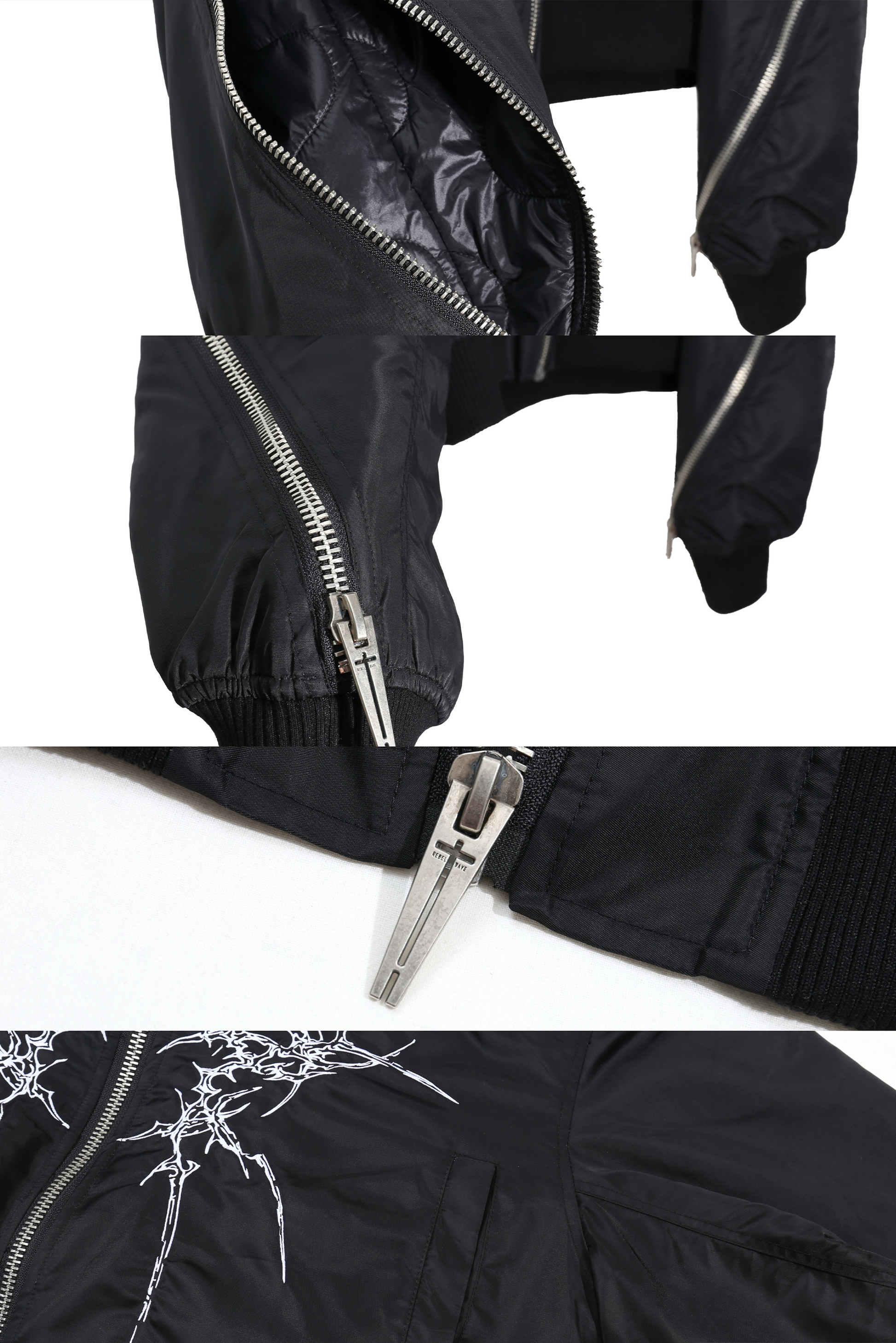 ダブルジップデザインと印象的な骨のプリントを特徴とするこのオーガニックフード付きボンバーは、大胆で未来的なエッジでストリートウェアを再定義します。
