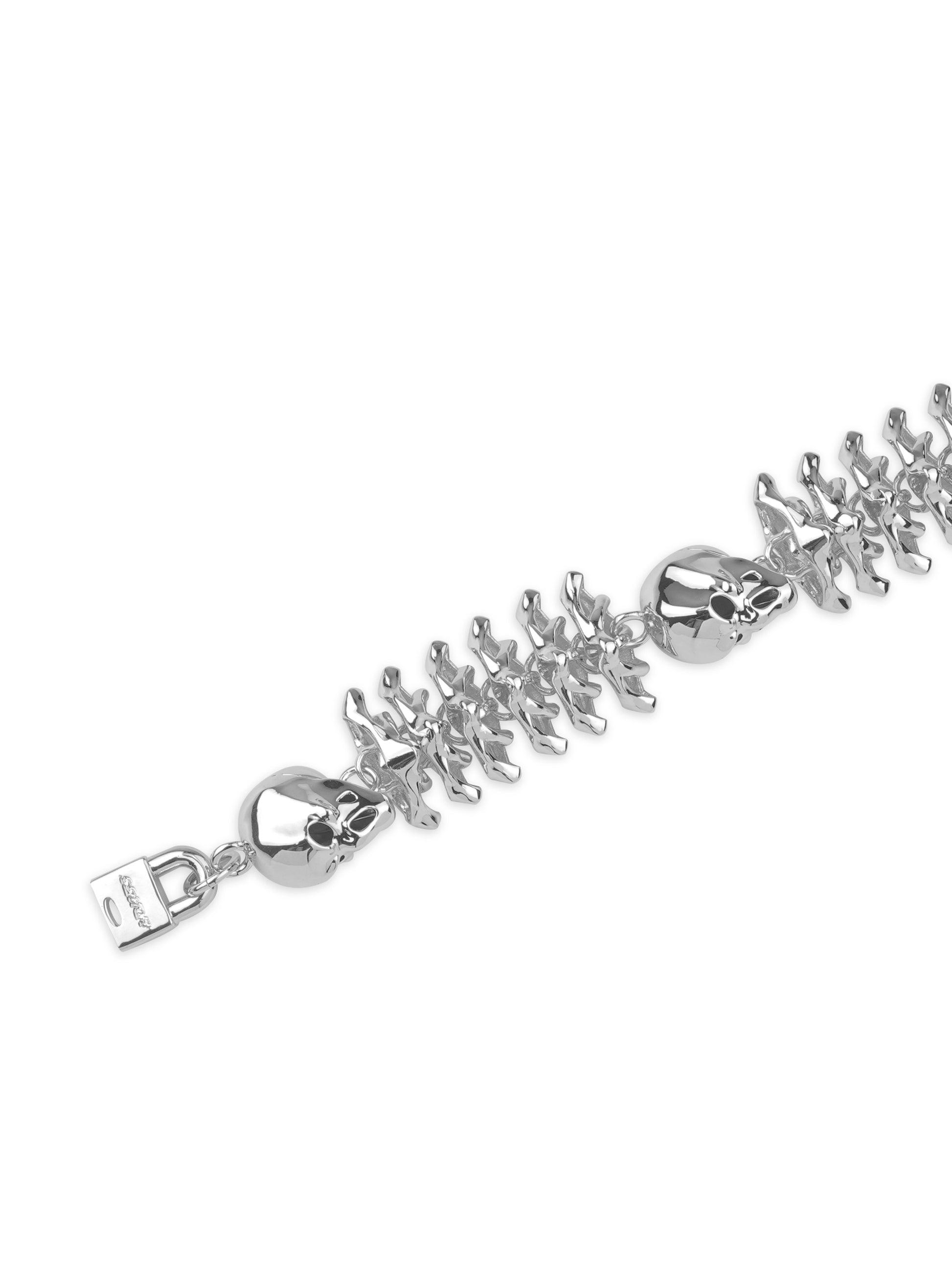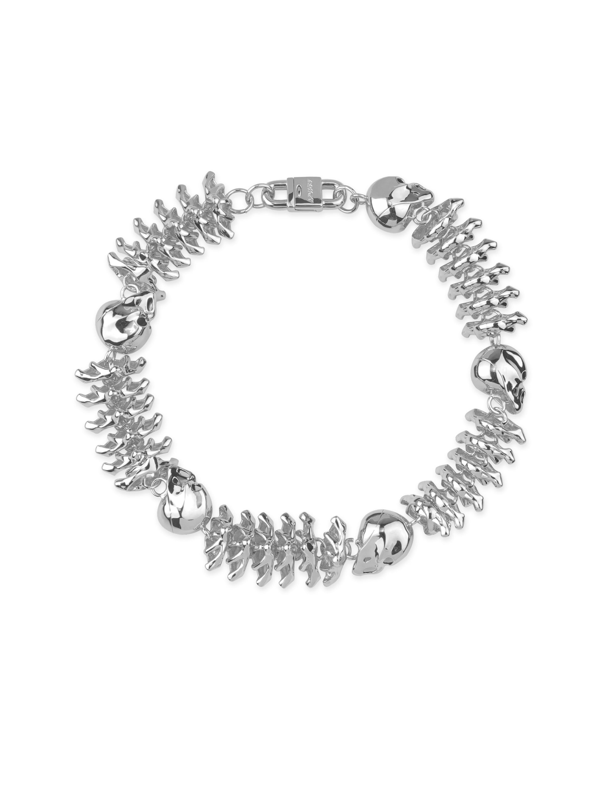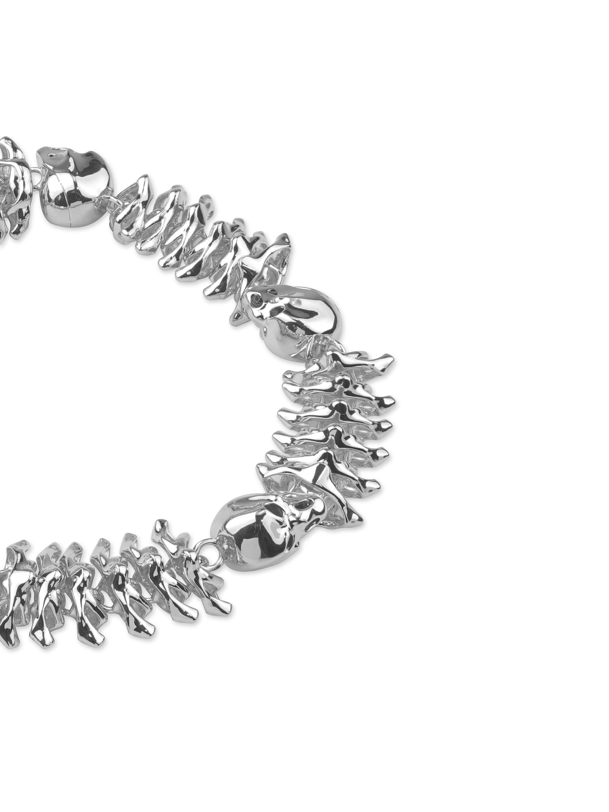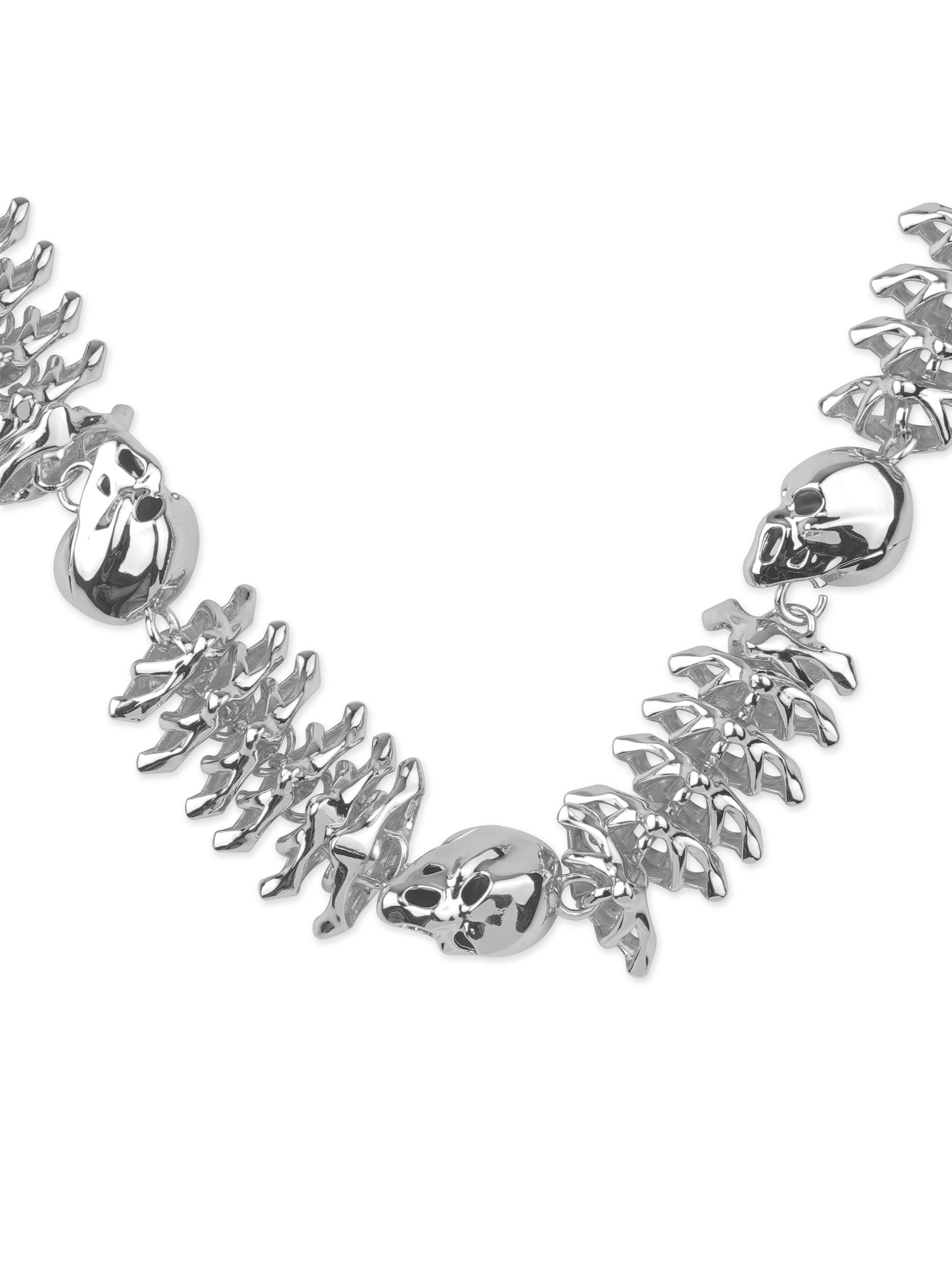 無垢の真鍮をホワイトゴールドでコーティングし、重厚感と冷たい輝きを両立させています。スカルや椎骨は一つひとつ手作業で造形・組み立てされ、未来的なエッジを効かせた精密で獰猛な仕上がりです。