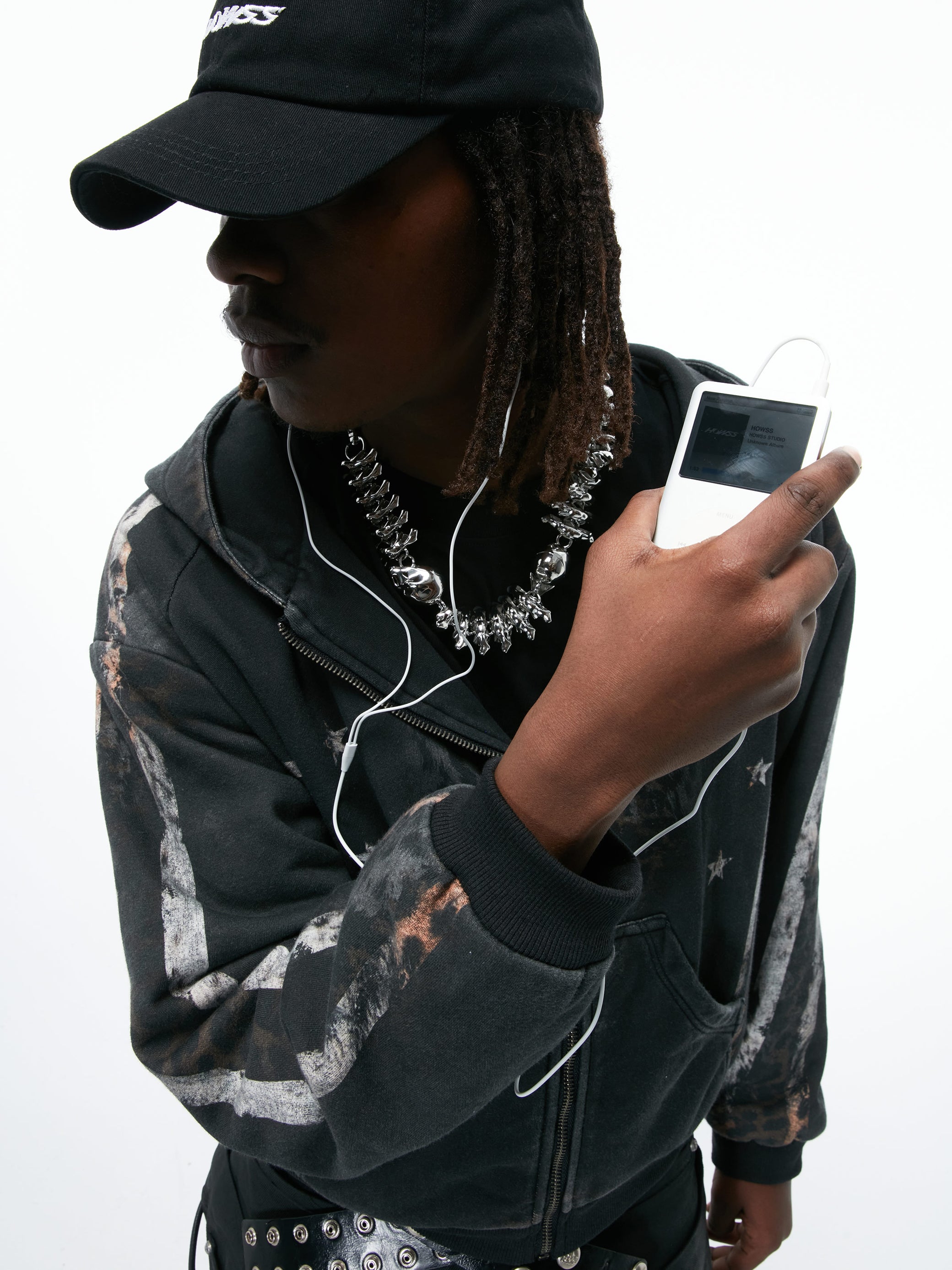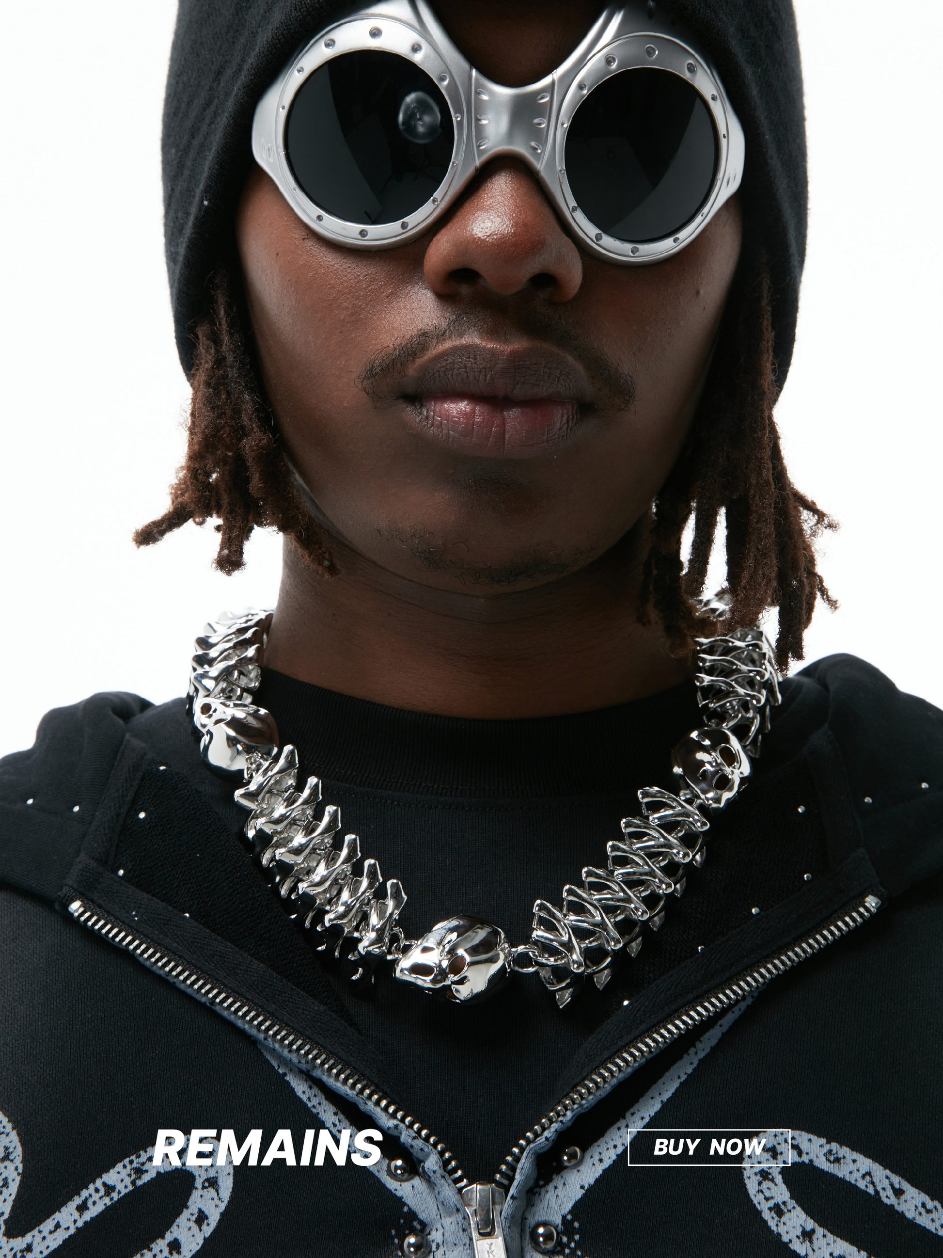 HOWSSによる完全オリジナルデザイン。このチェーンは、かつて空を焼き尽くし、やがて粉々に砕け散った「彗星の残骸」をモチーフにしています。エイリアンのスカルとスパインリンクが、その断ち切られた軌跡をなぞるように連なり、「地球外の何か」の遺物を思わせる佇まいに。グロスも偽りも一切なし。