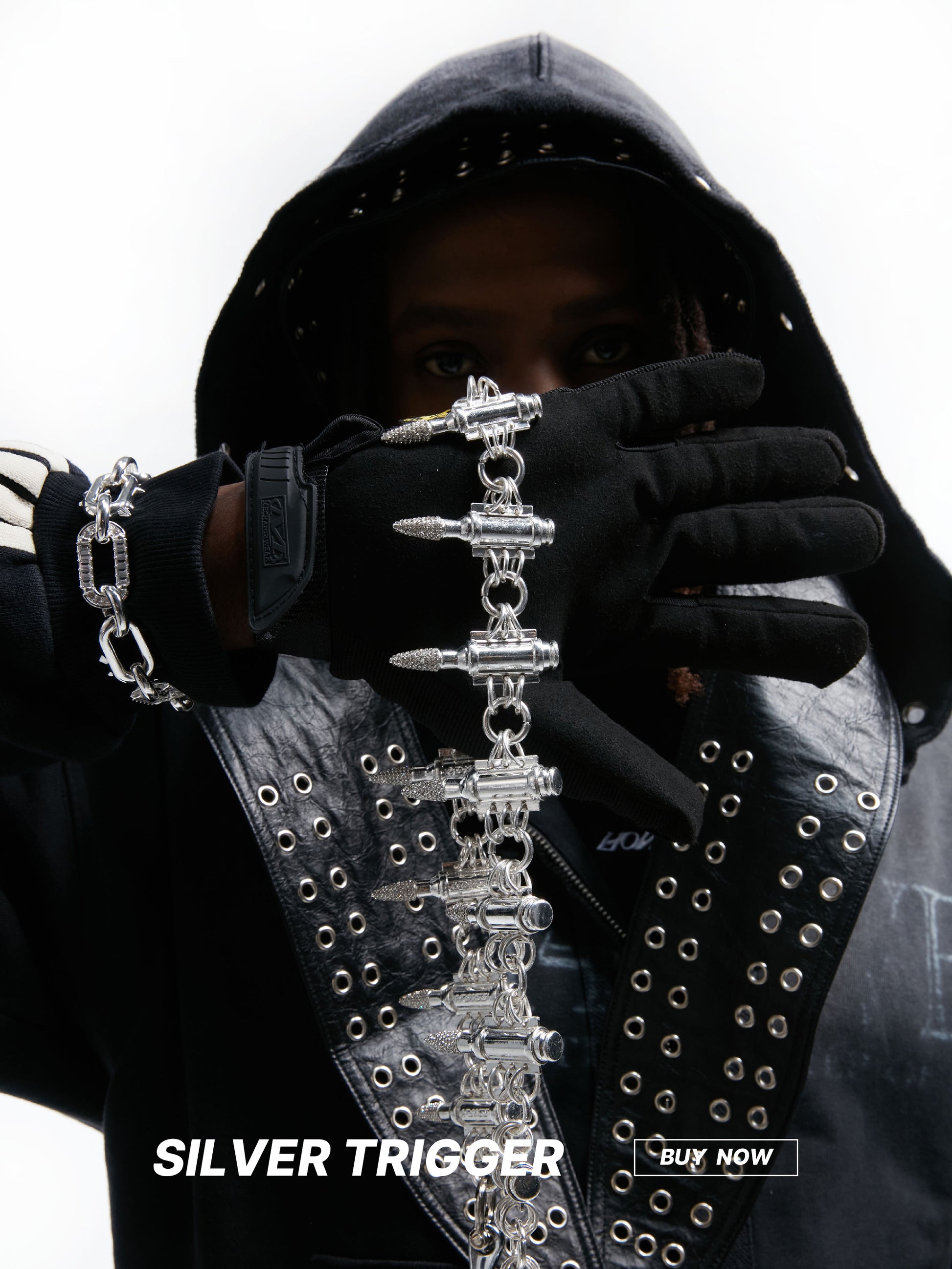 シルバーメッキ亜鉛合金で作られ、冷たく重厚な存在感。バレットペンダントには光学グレードのラインストーンをインレイし、危険なほどシャープな輝きを放ちます。各メタルパーツは武器級の光沢を保つように研磨されています。