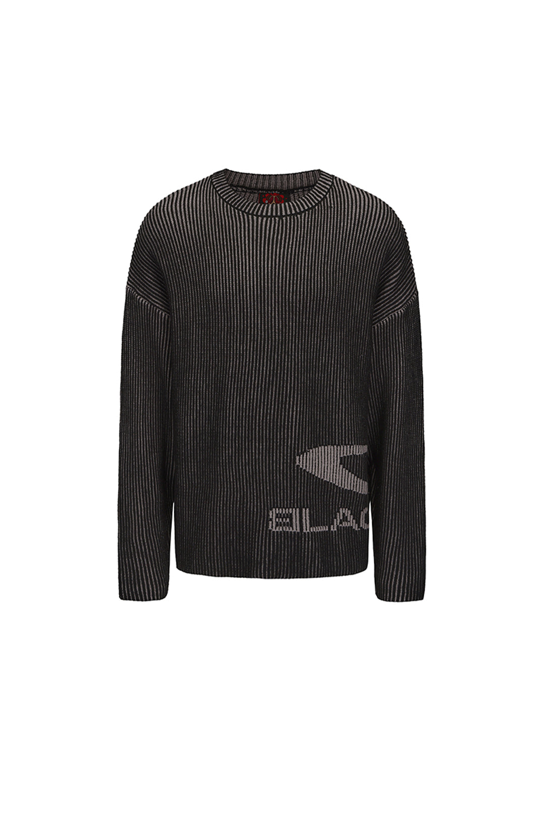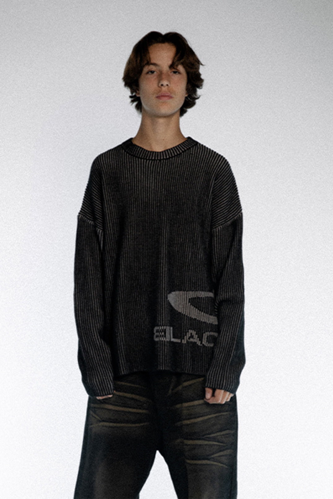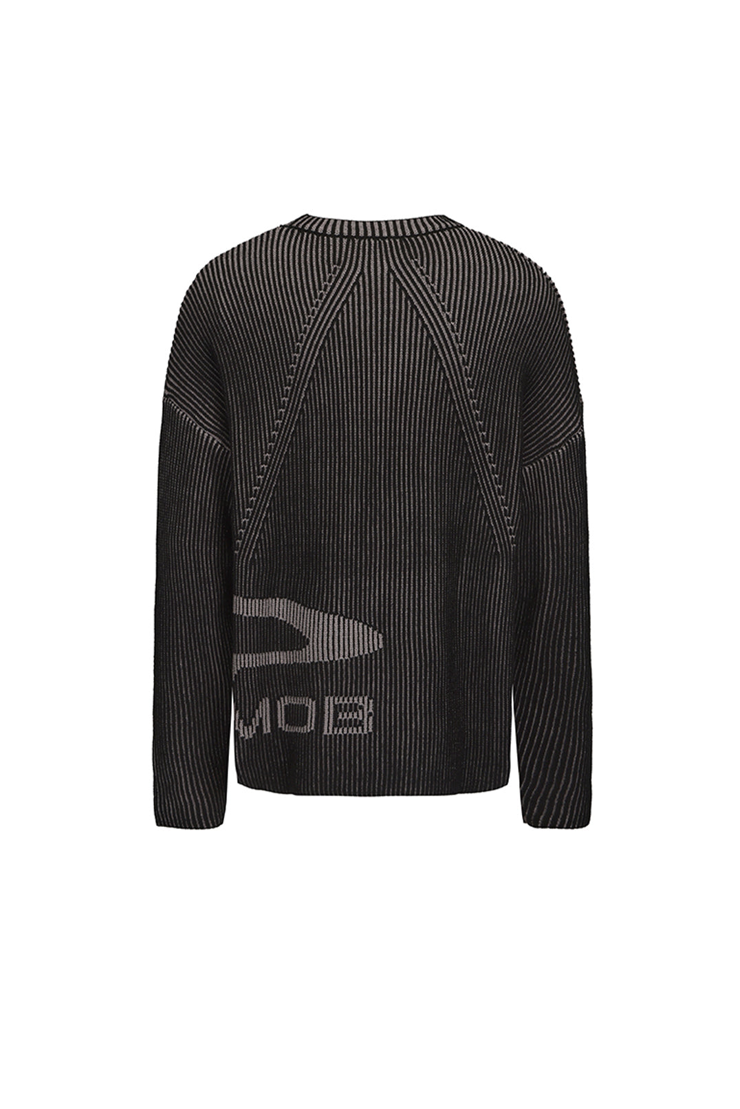 Built with dense vertical rib knitting, this sweater forms a clean, flowing texture from every angle. The dark gradient tones emphasize a calm, tactical mood, while the broken-edge logo at the hem sharpens the street attitude. Minimal but unmistakably bold.