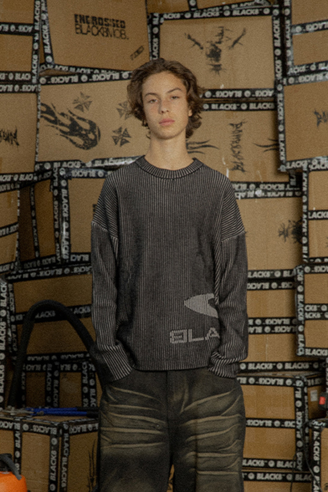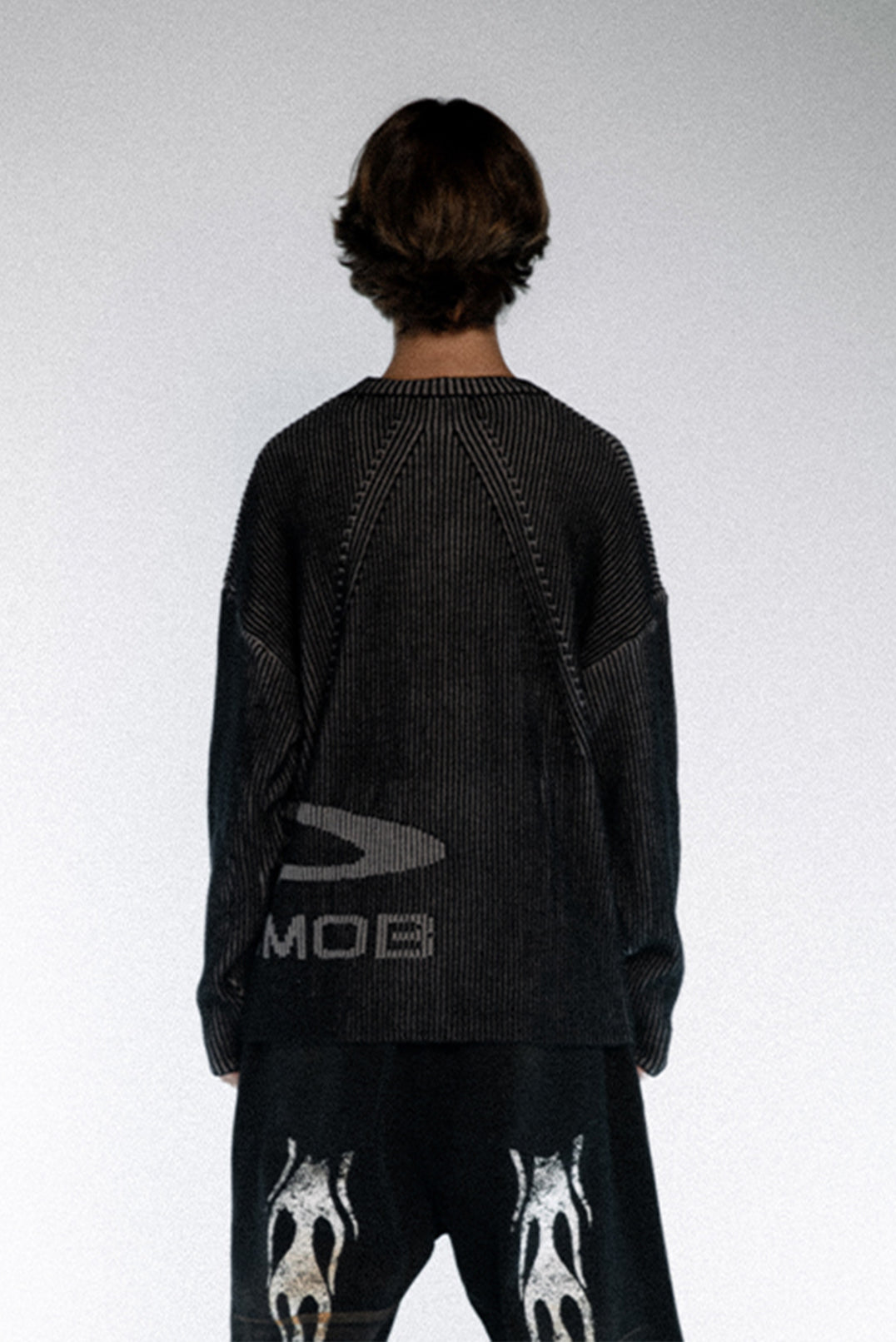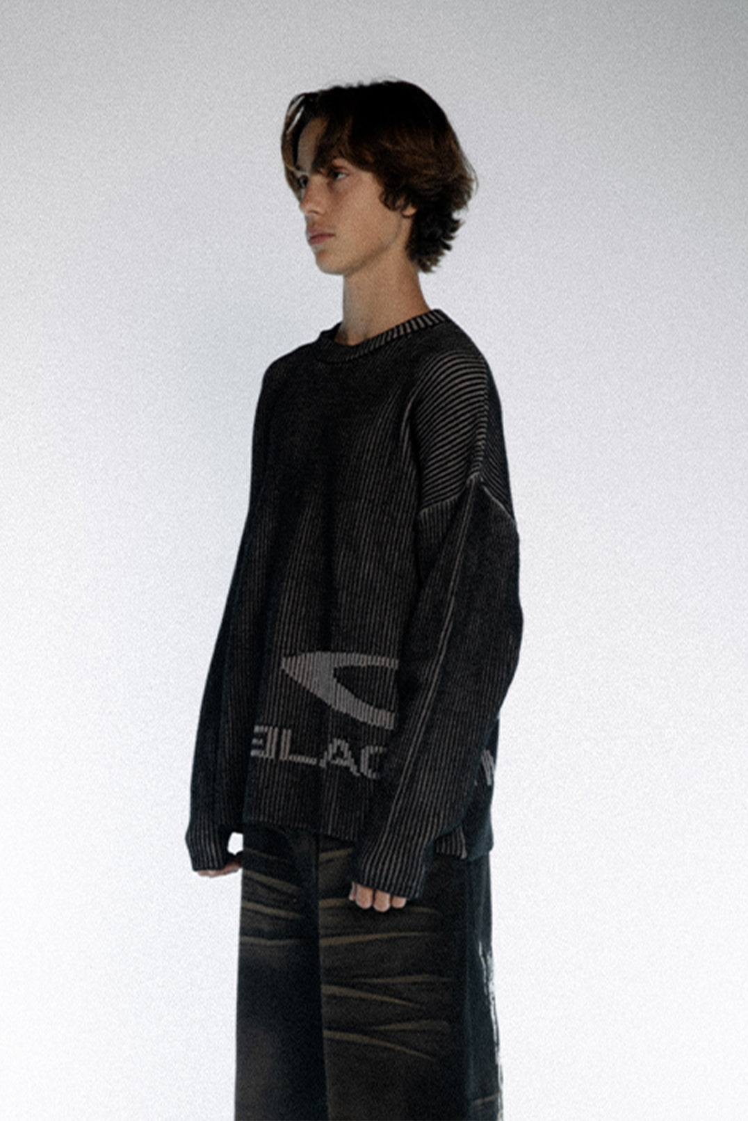 Built with dense vertical rib knitting, this sweater forms a clean, flowing texture from every angle. The dark gradient tones emphasize a calm, tactical mood, while the broken-edge logo at the hem sharpens the street attitude. Minimal but unmistakably bold.