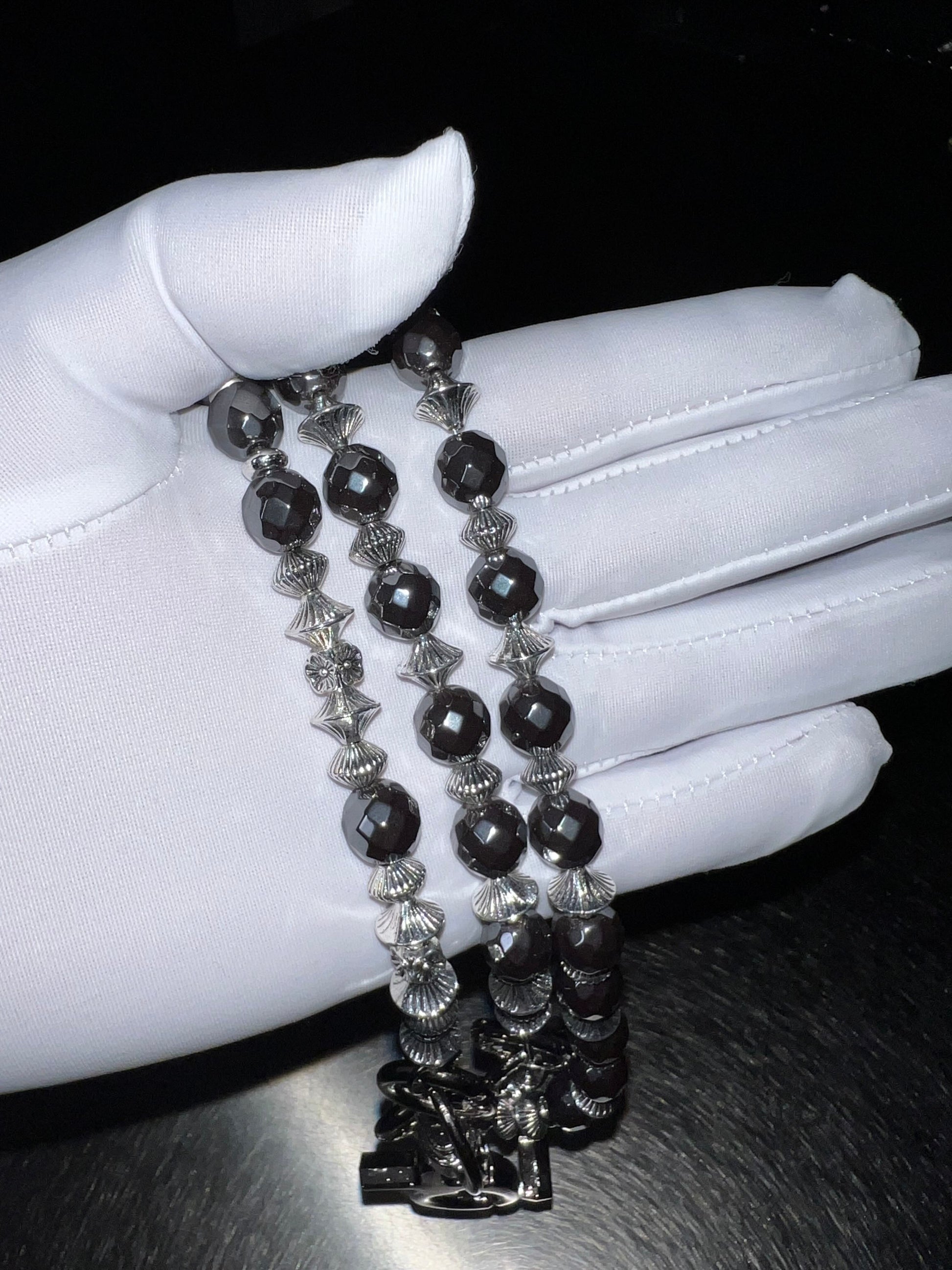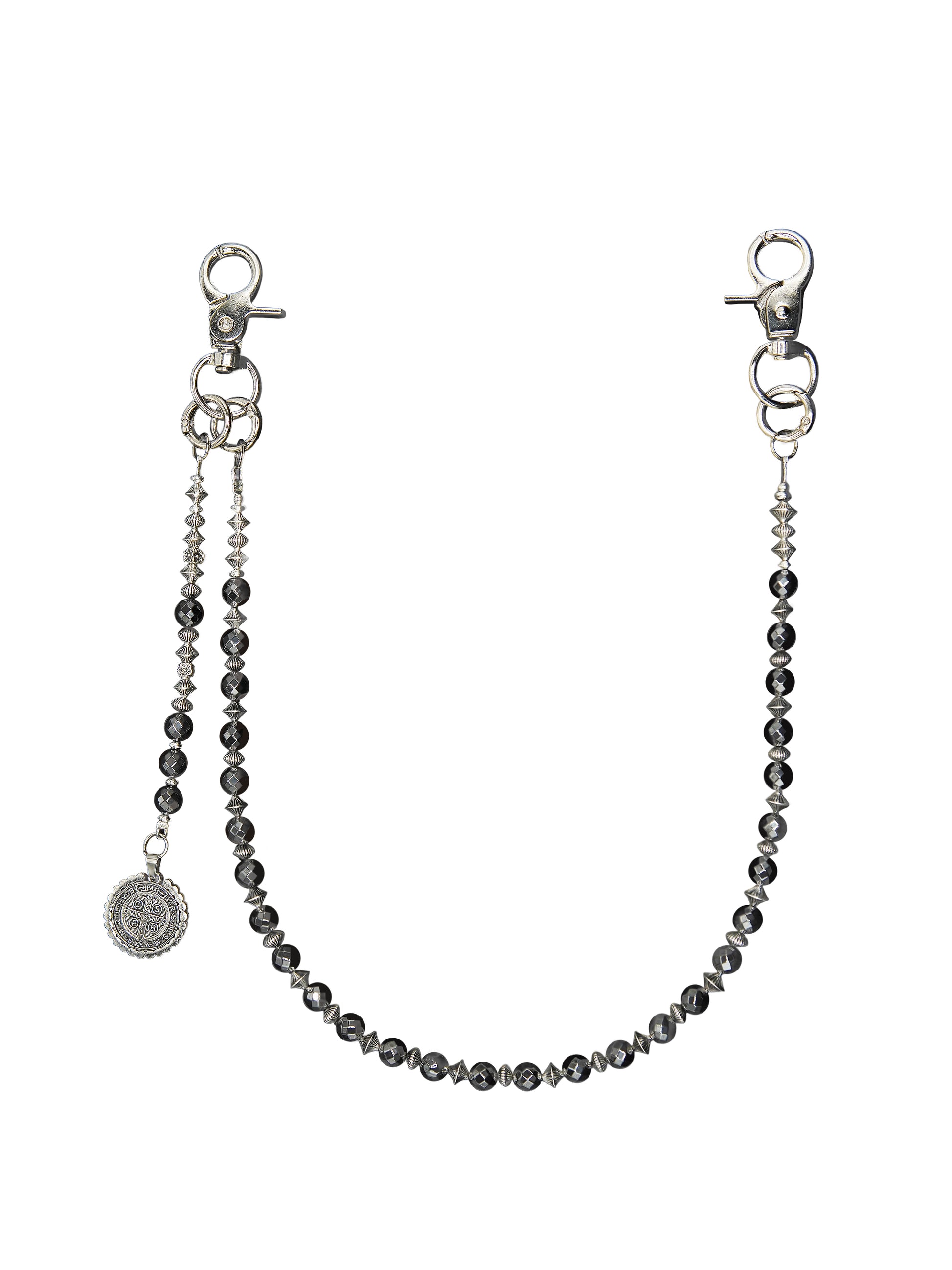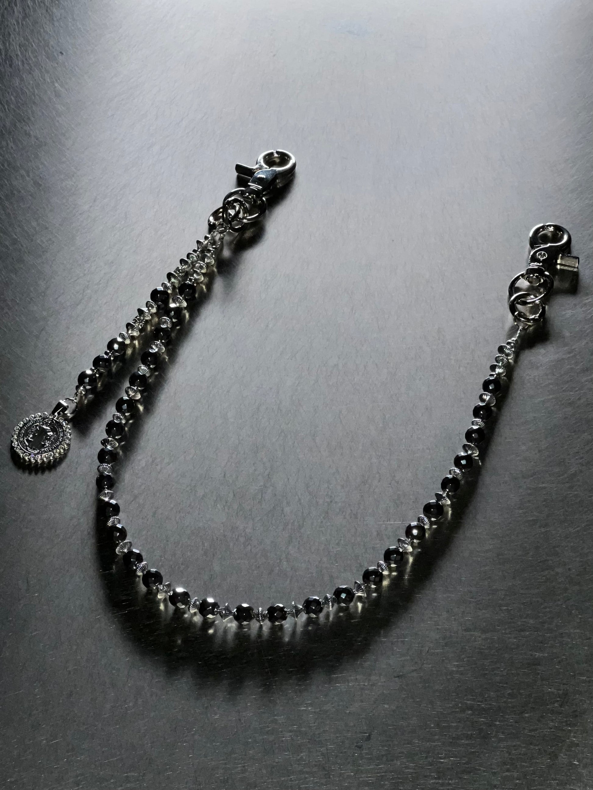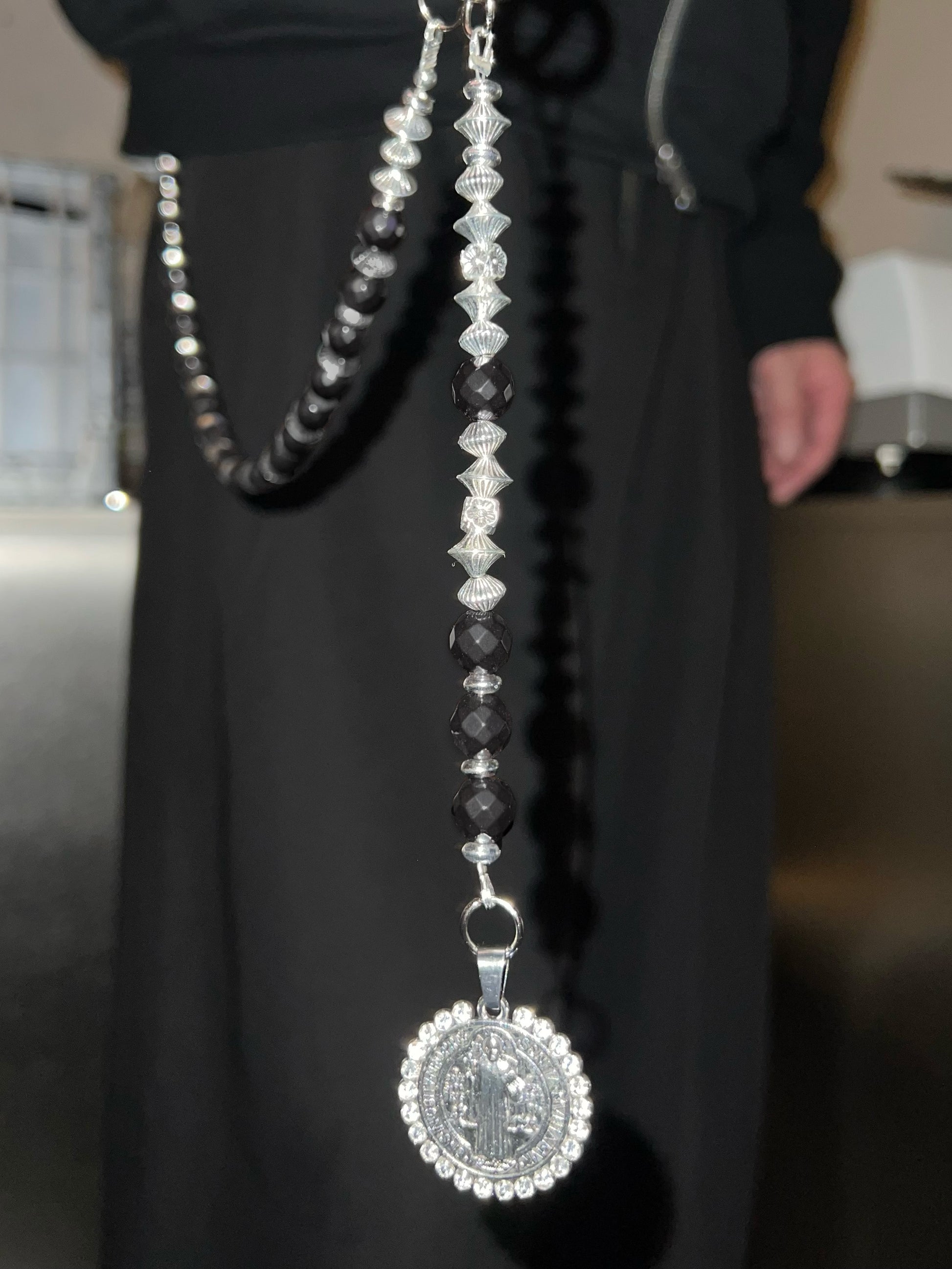 このチェーンアクセサリーは 職人の石とチタン鋼をブレンドし、強さと柔らかさのバランスを体現しています。黒灰色の石と幾何学的な金属要素が深みを生み出し、黒い石のビーズが付いたユニークなバッジペンダントが焦点を作ります。ダブルクラスプデザインにより、ウエストチェーン、バッグチェーン、またはペンダントとして多用途に使用できます。 このチェーンは光、影、反抗的なエネルギーを際立たせます。