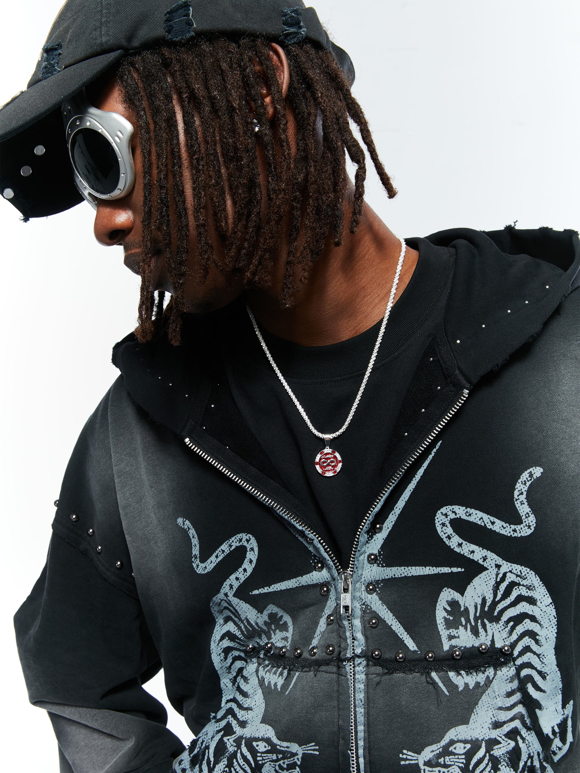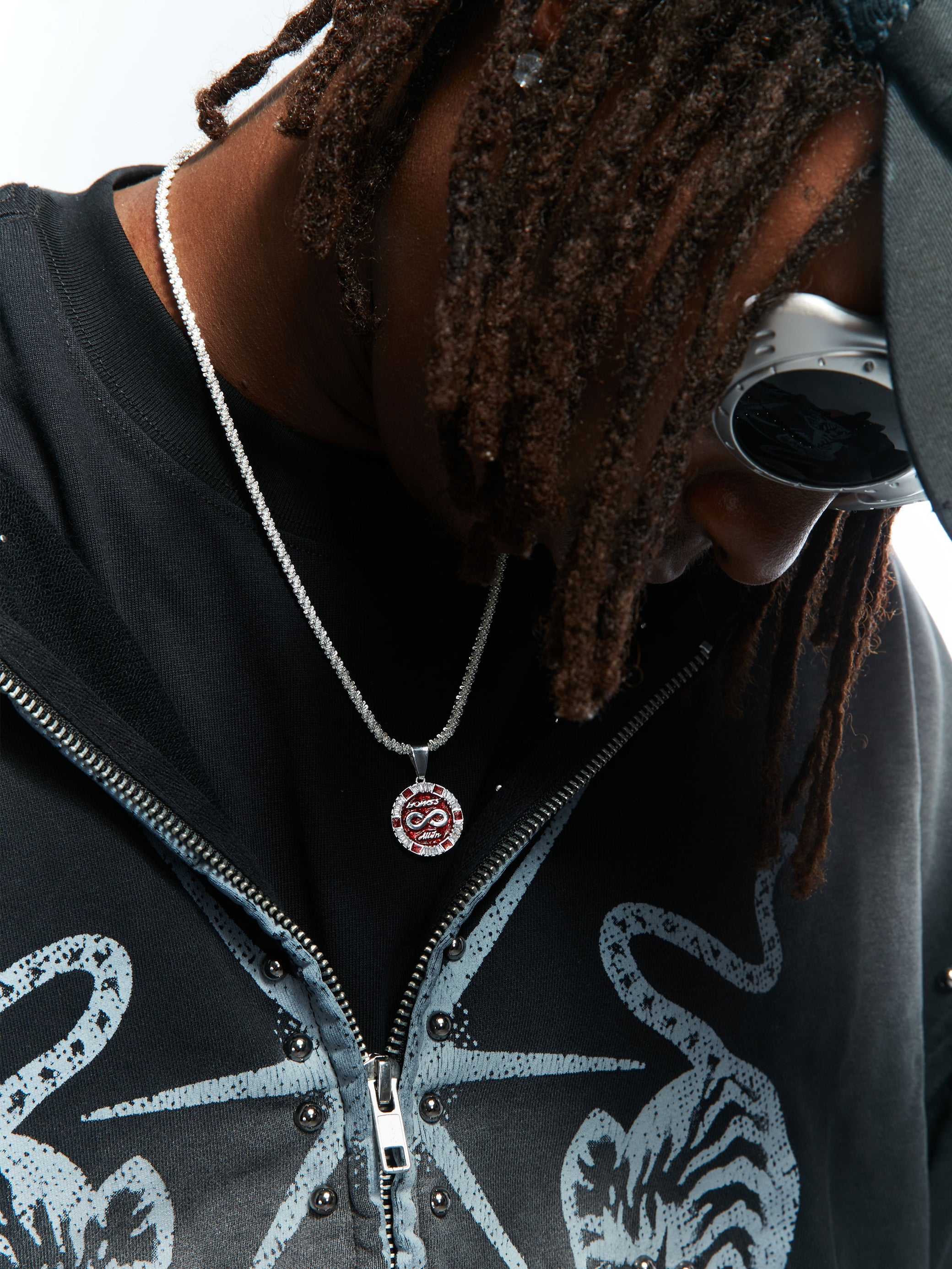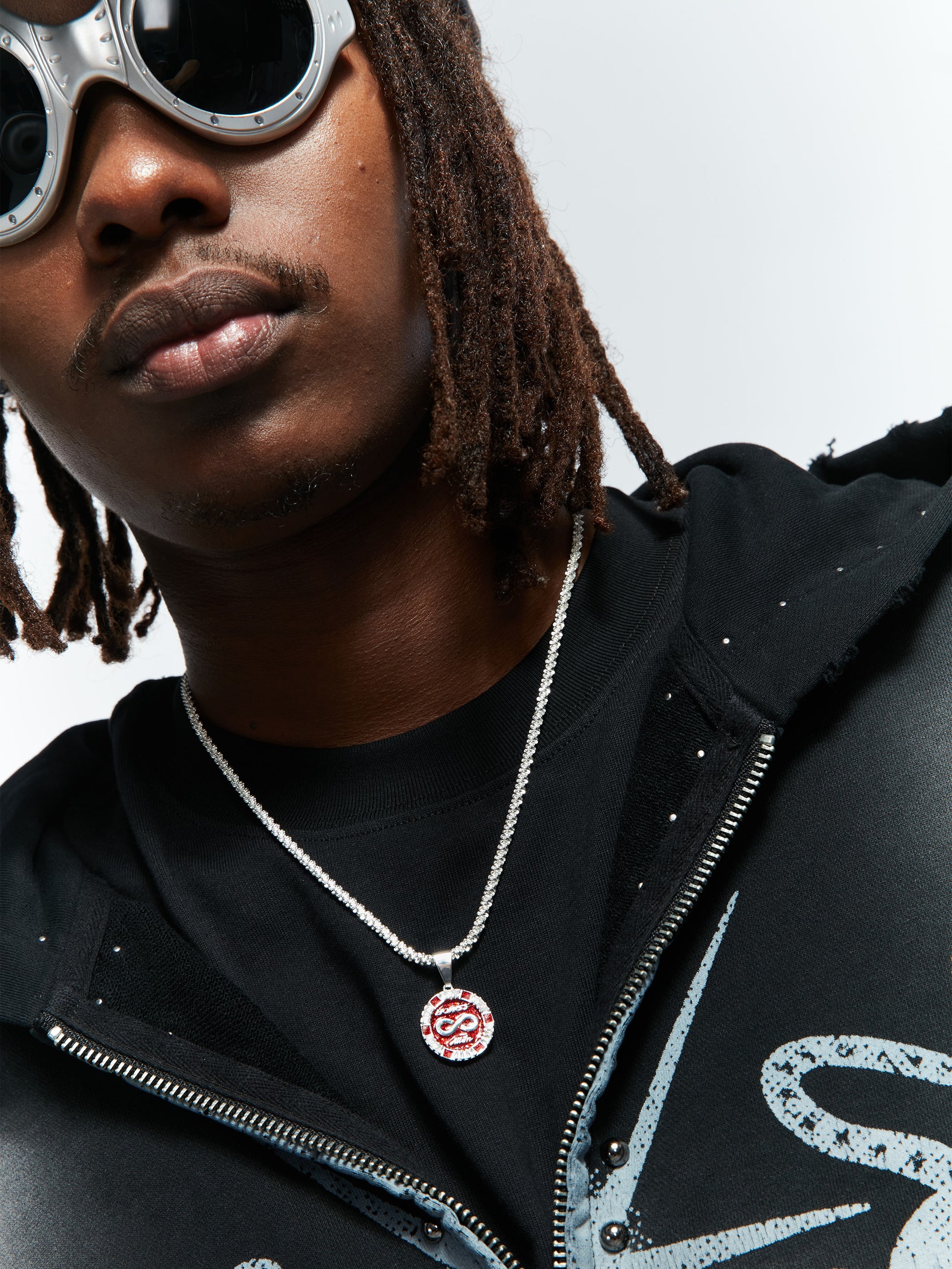 HOWSS만의 독점 디자인으로, 지하 카지노의 긴장감 넘치는 순간에서 영감을 받아 카지노 칩과 스트리트 심볼리즘을 결합한 작품입니다. 양면 펜던트는 행운의 부적으로 한 면에는 HOWSS의 무한대 심볼, 다른 한 면에는 트리플 세븐이 깊은 레드 에나멜 위에 새겨져 있습니다. 모든 각도에서 빛을 반사하는 핸드 세팅 지르콘 스톤으로 테두리를 장식했습니다. ‘올인, 한계 없음’이라는 메시지를 담은 스테이트먼트 피스입니다.