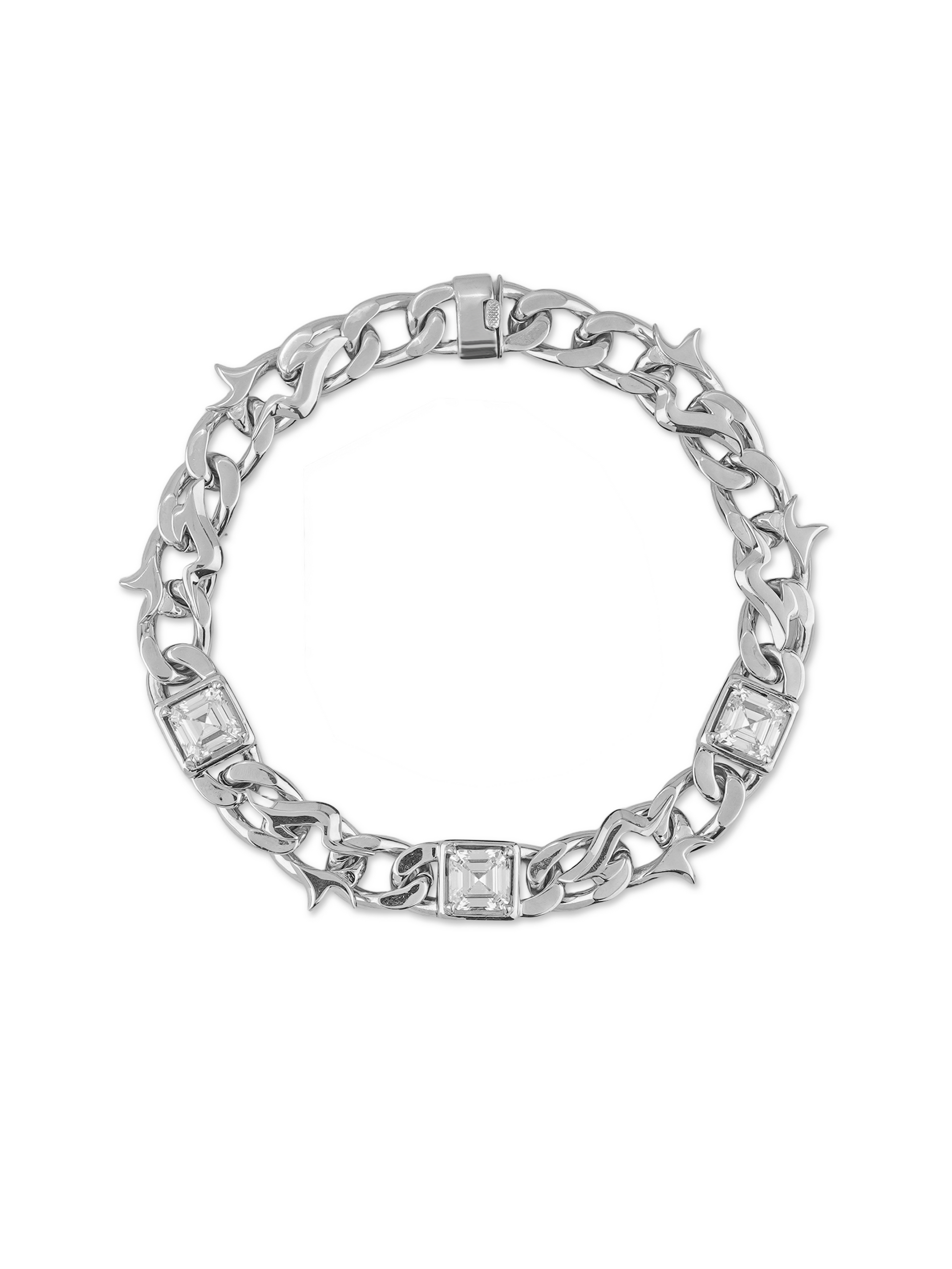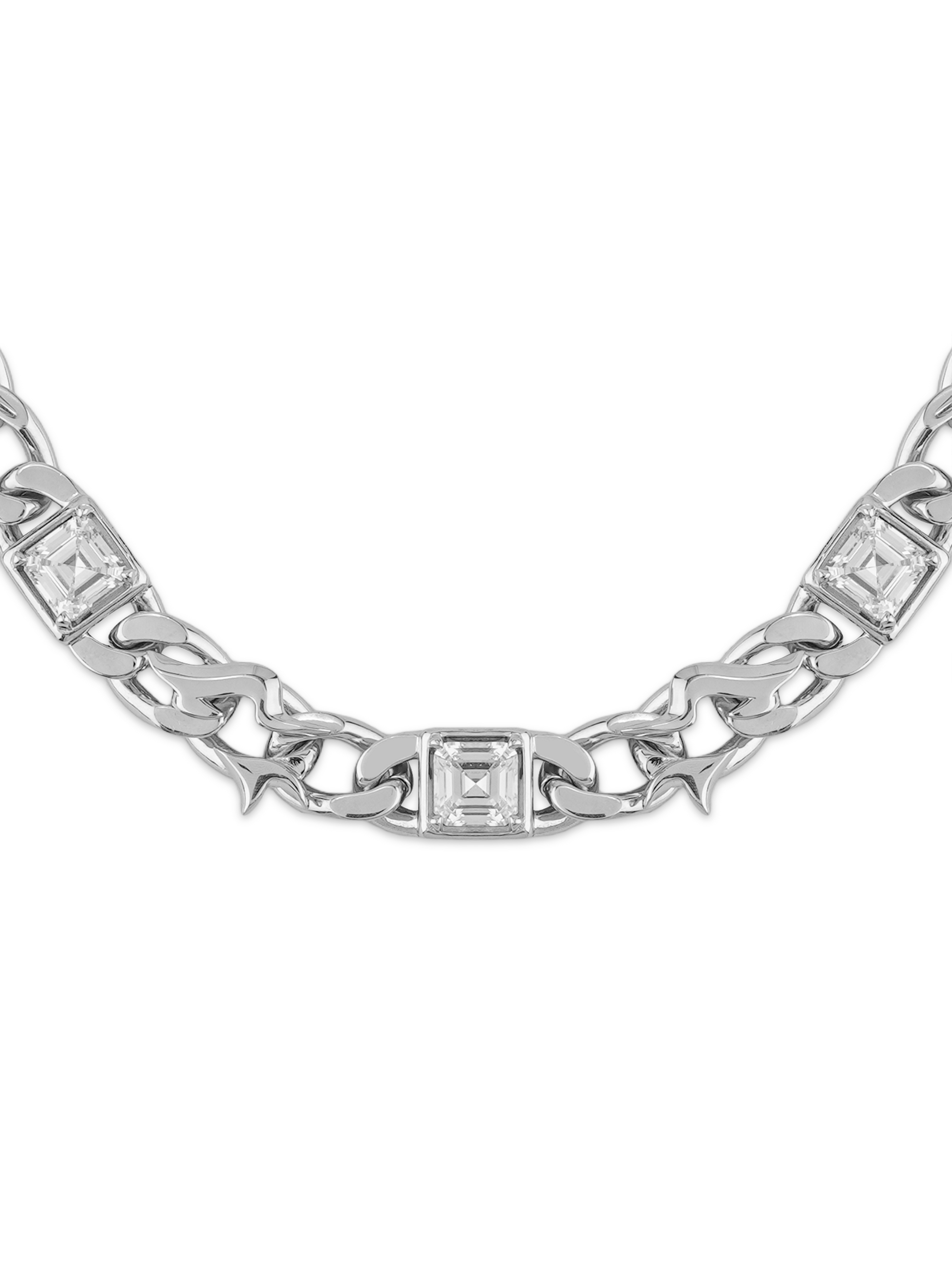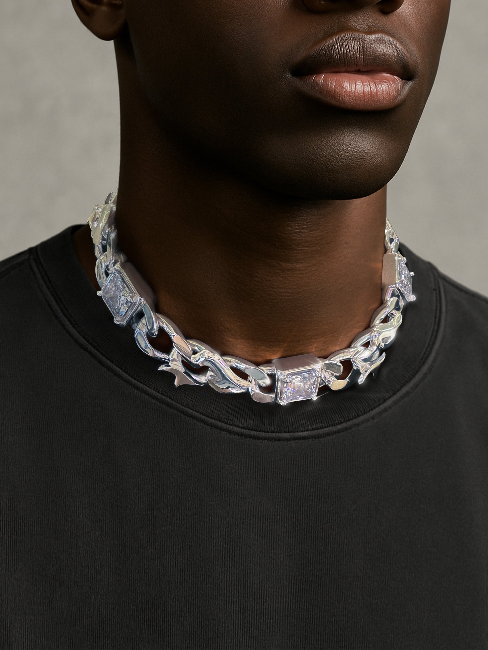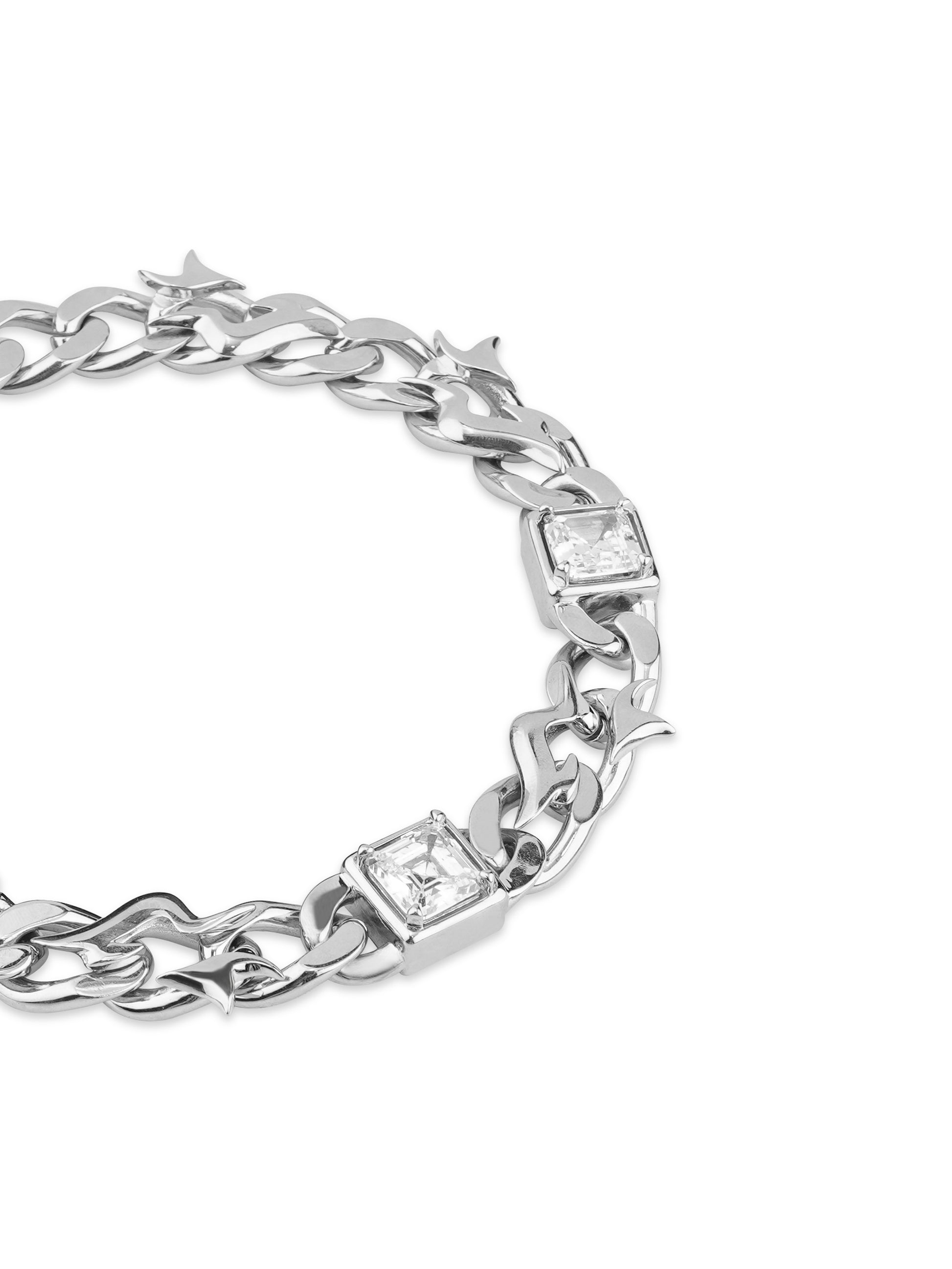 구리 소재에 실버 도금 마감으로 제작된 이 체인은 묵직한 존재감을 자랑합니다. 세 개의 애셔컷 사각 지르콘 스톤이 플레임 링크 바디에 정교하게 세팅되어 움직일 때마다 거울처럼 깊은 섬광을 뿜어냅니다. 사이드에 장착된 워해머 펜던트로 날카롭고 강렬한 인상을 완성했습니다.
