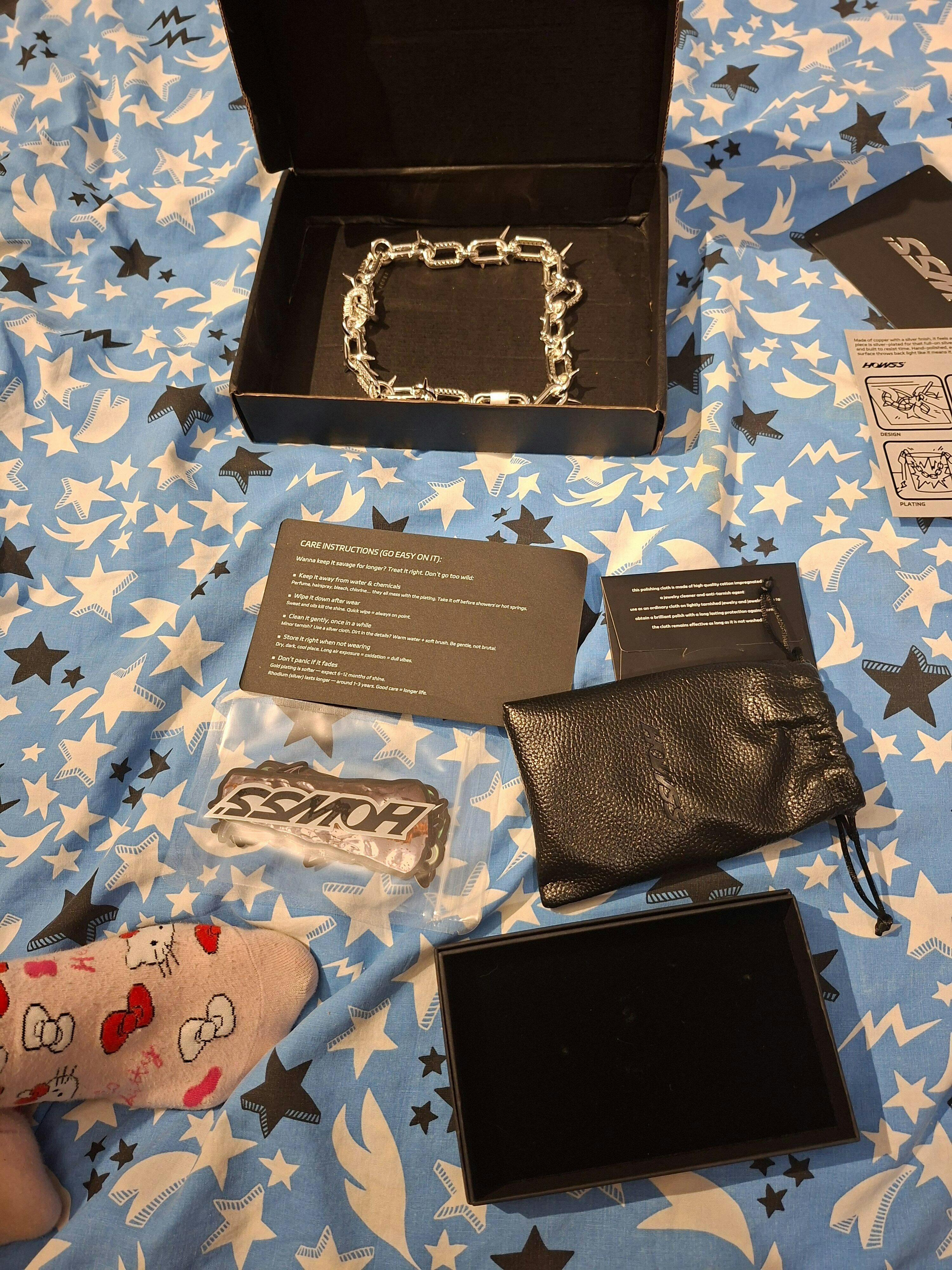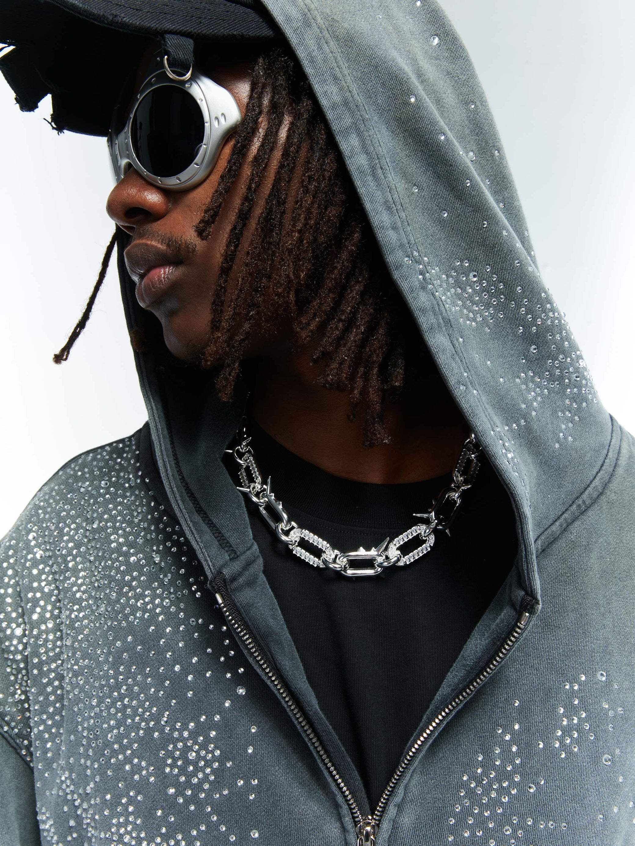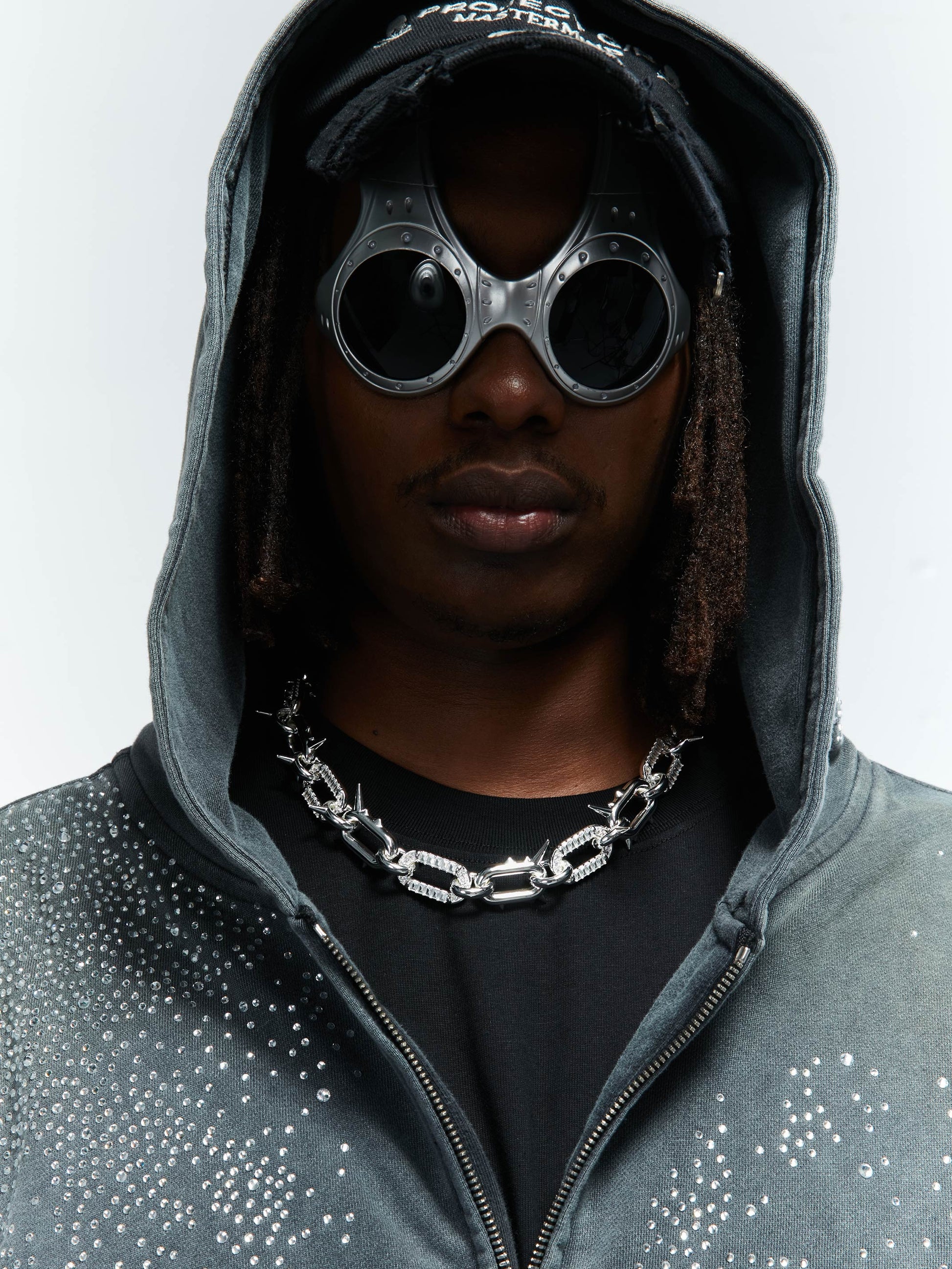Exclusively designed by HOWSS, AFTERBURN follows the blast of SUPERNOVA — a chain forged in the heat that lingers after impact. Angular spikes and gem-set links catch the light like scattered debris, locked into a silhouette that burns cool and cuts deep. It’s not just an accessory — it’s the aftershock.