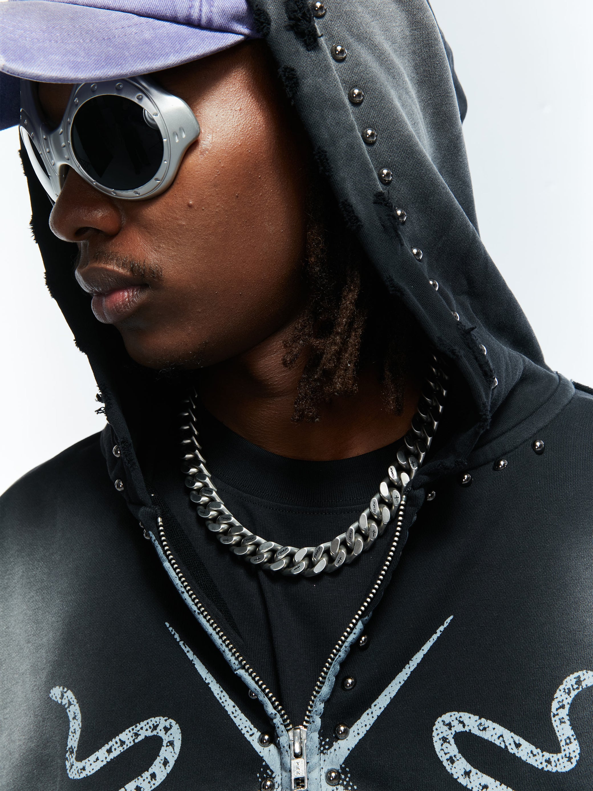 Crafted from solid titanium steel with a matte satin finish, built to endure both time and movement. Each link is precision-polished for a clean, structured look that resists rust, tarnish, and the wear of daily life. The engraved motifs add a subtle layer of rebellion — bold enough to stand alone, sharp enough to stack.