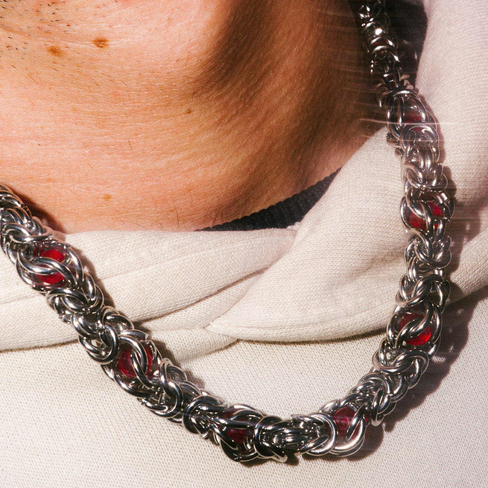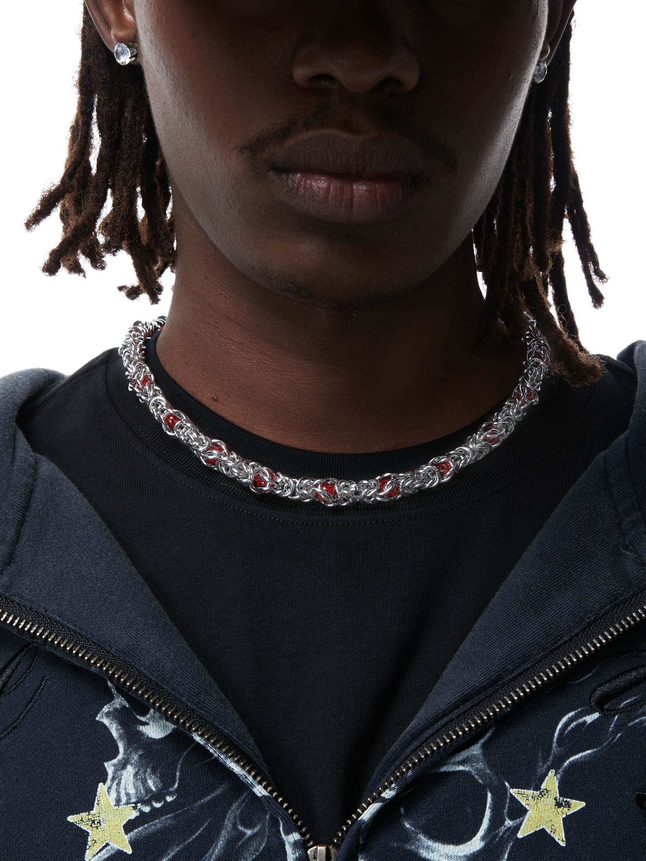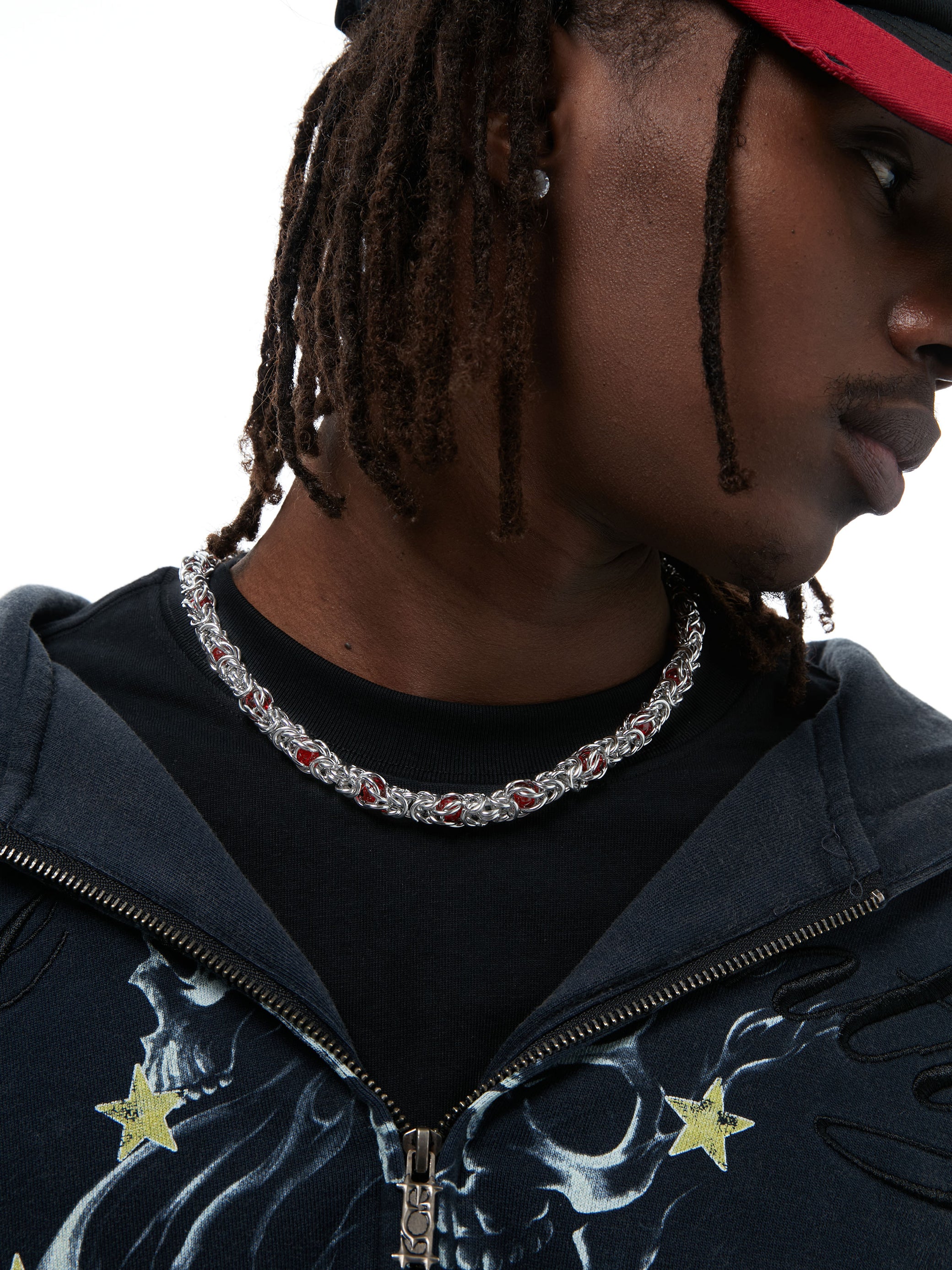 This necklace interweaves polished titanium steel with deep red handmade stone beads, weaving it into an armor-like structure. The smooth metal ring contrasts with the vibrant stone core, creating a restrained tension and clear texture. Equipped with an adjustable extension chain, it is easy to adjust the wearing comfort while maintaining its bold sculptural feel.