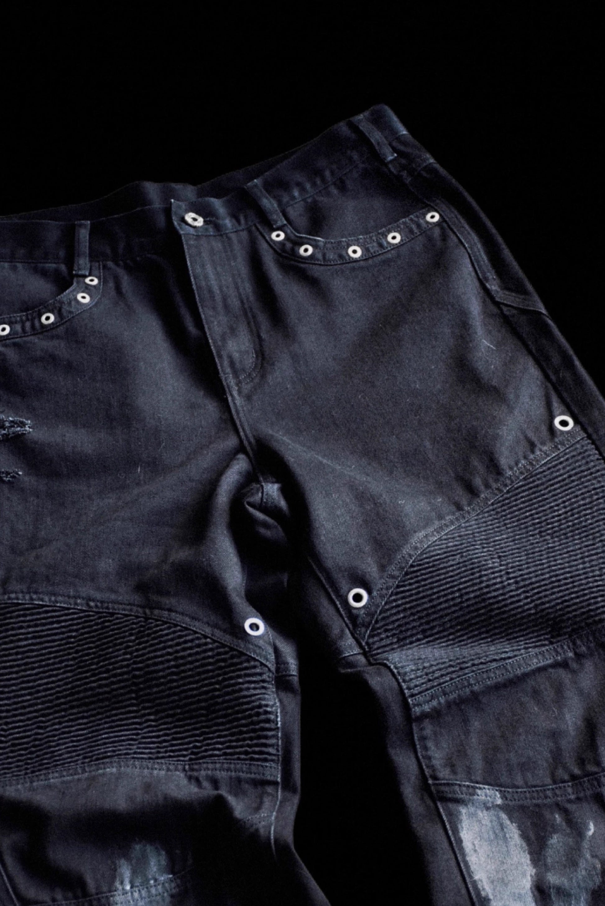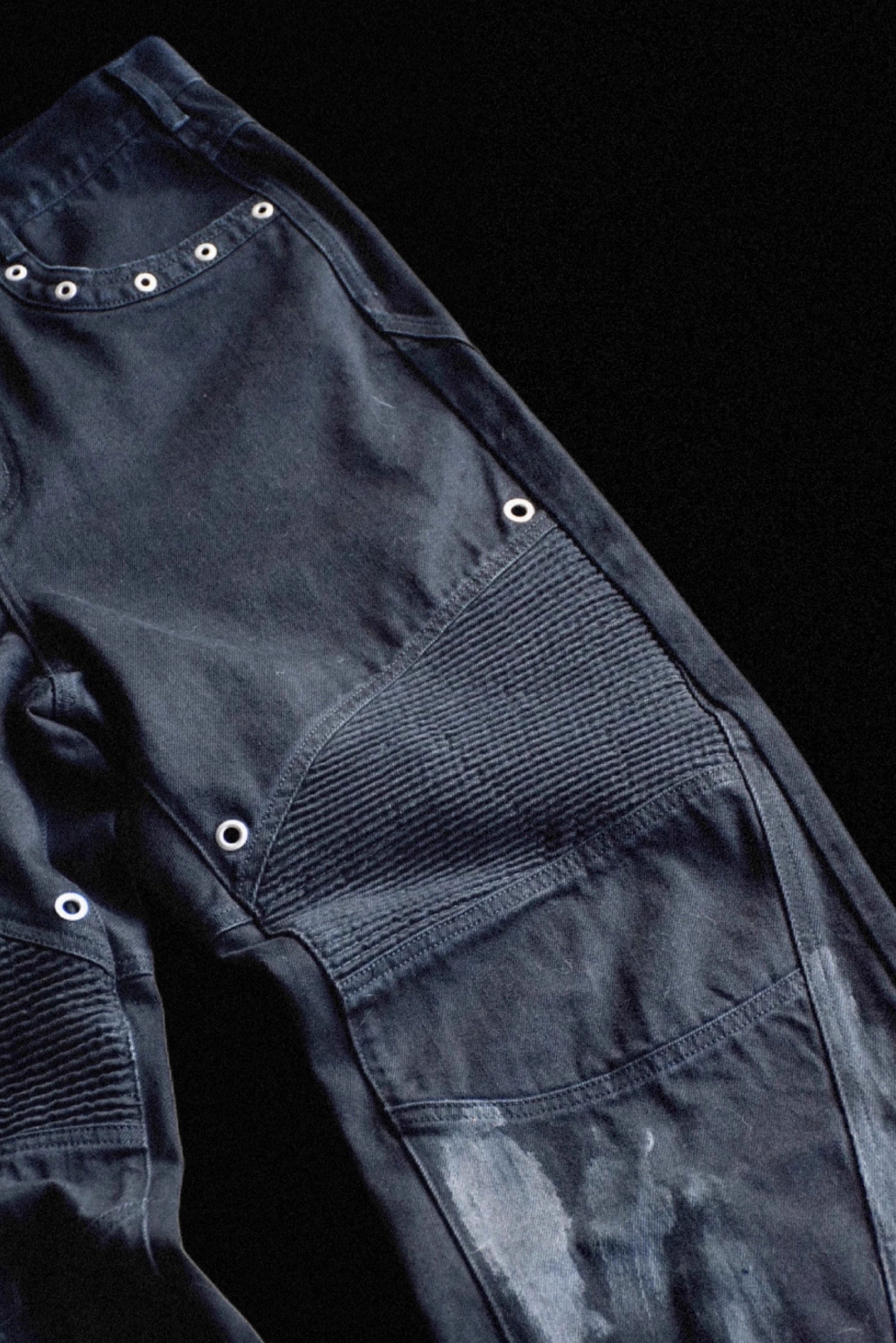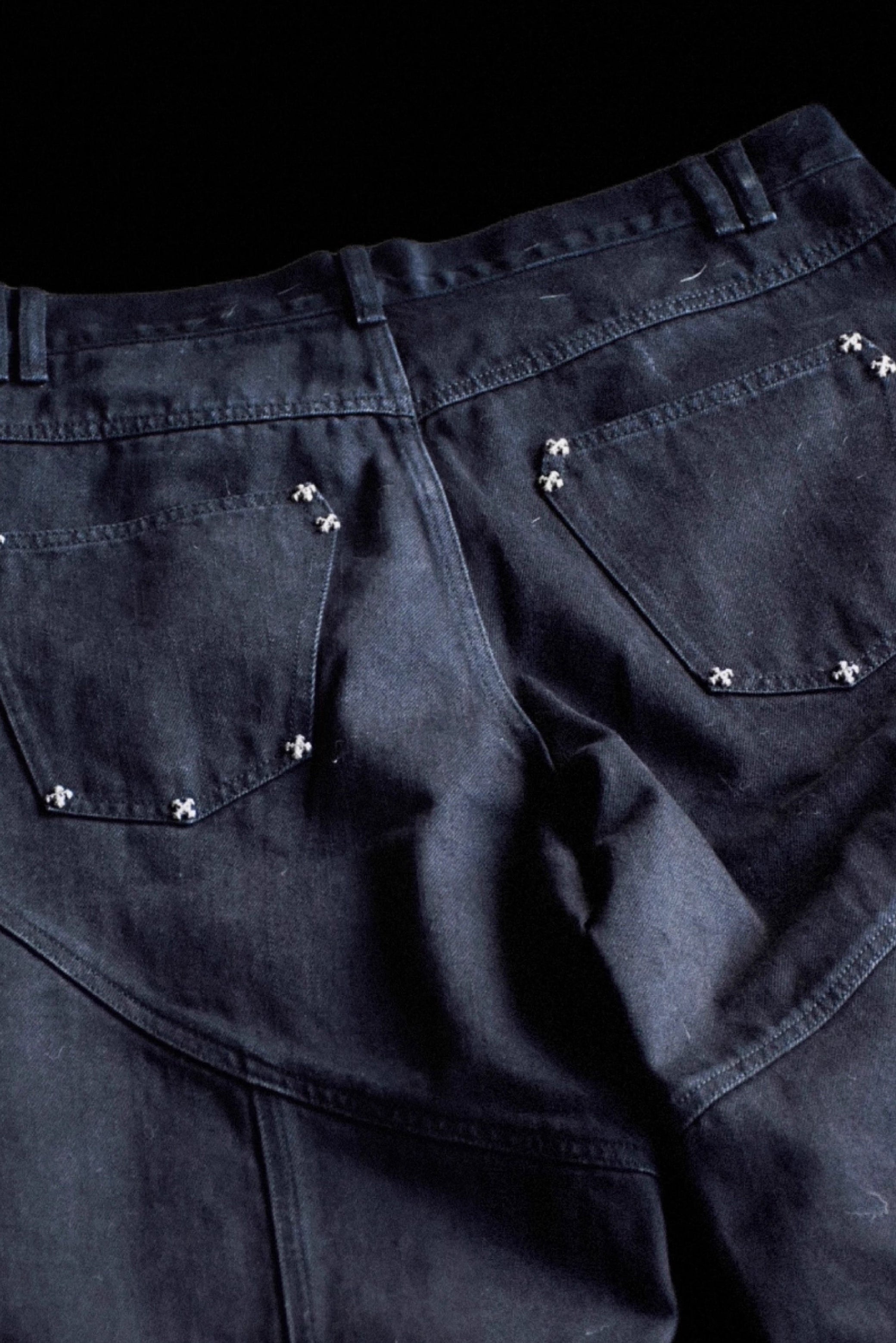 Crafted from heavyweight 14oz black denim, the fabric is dense, structured, and self-supporting.