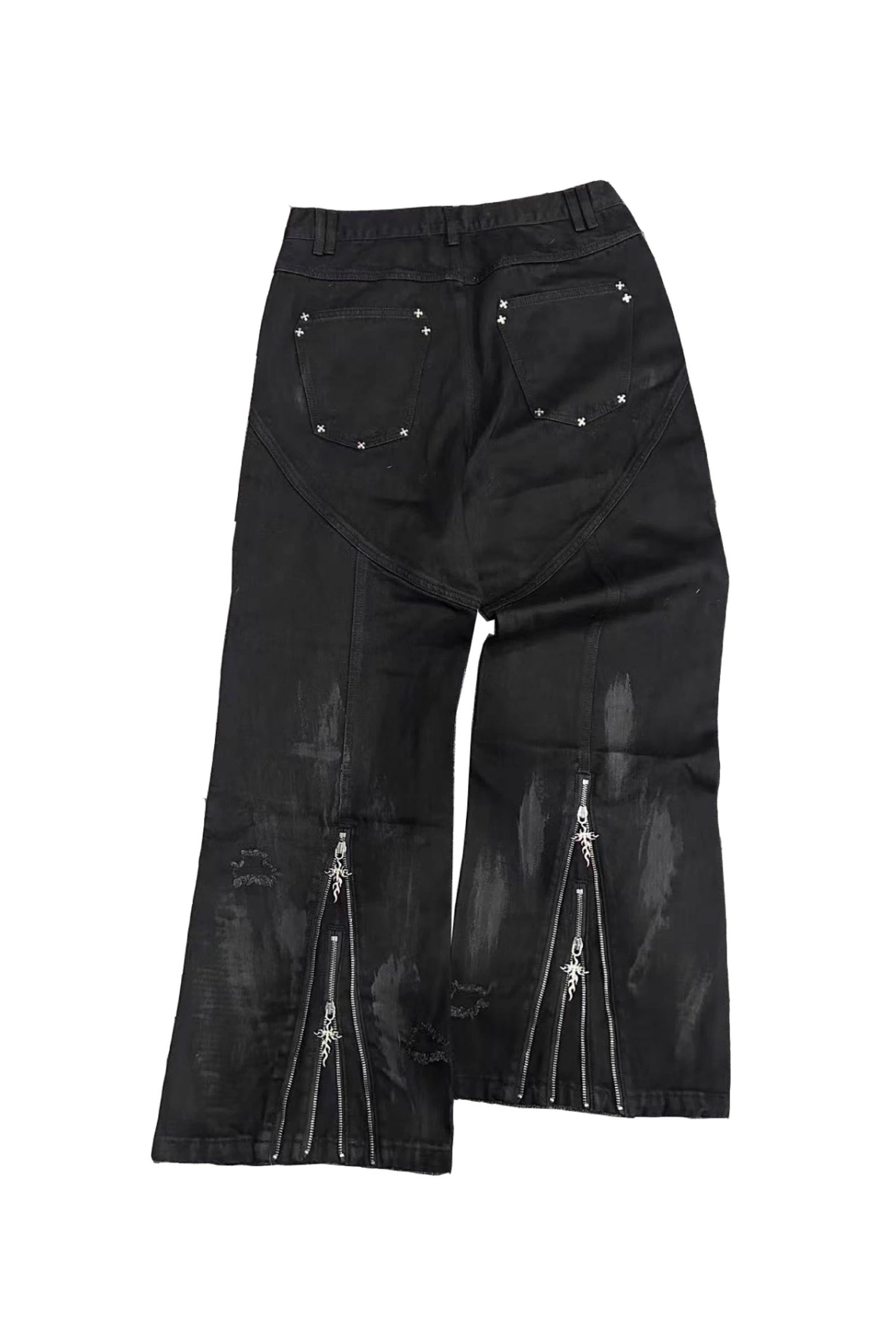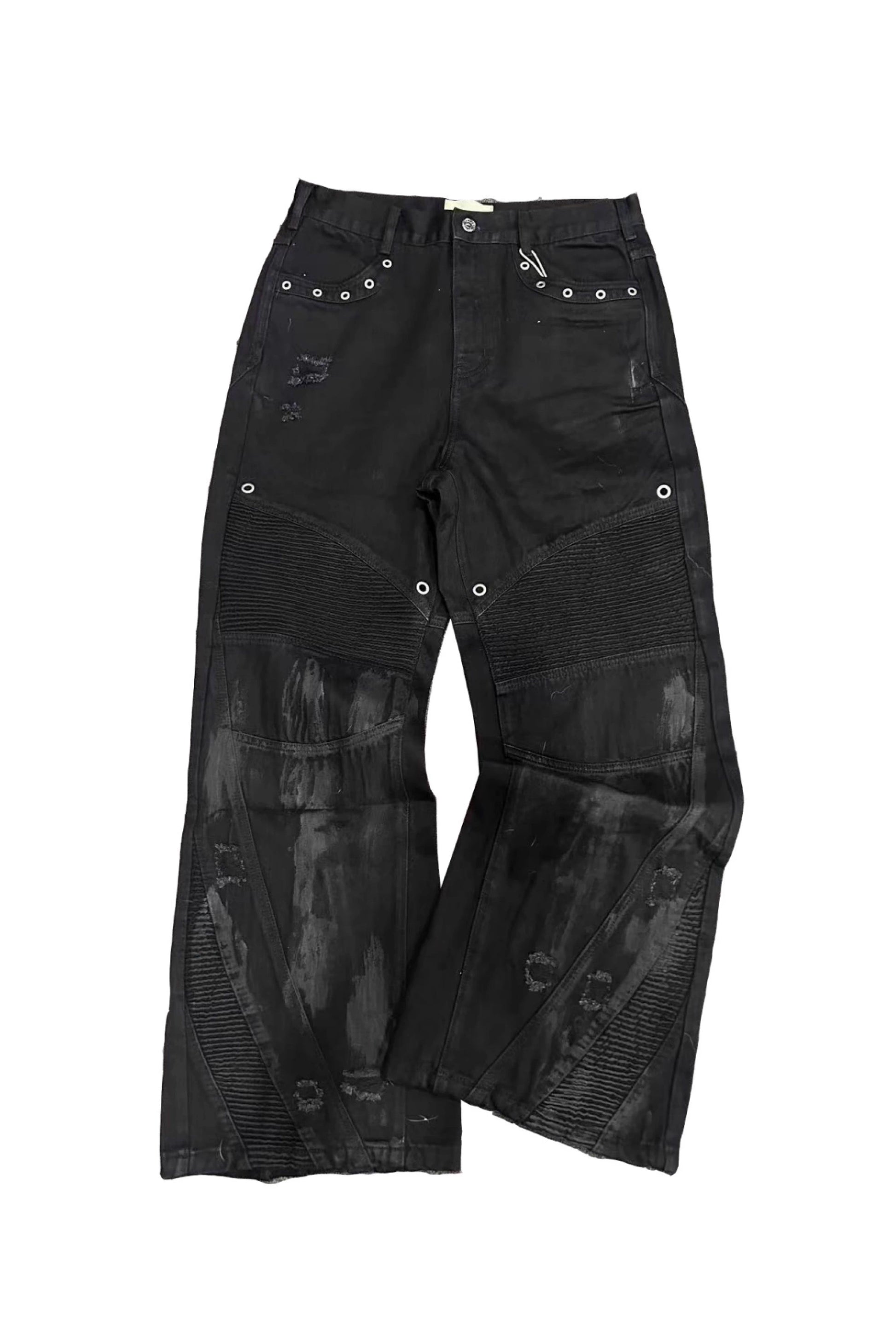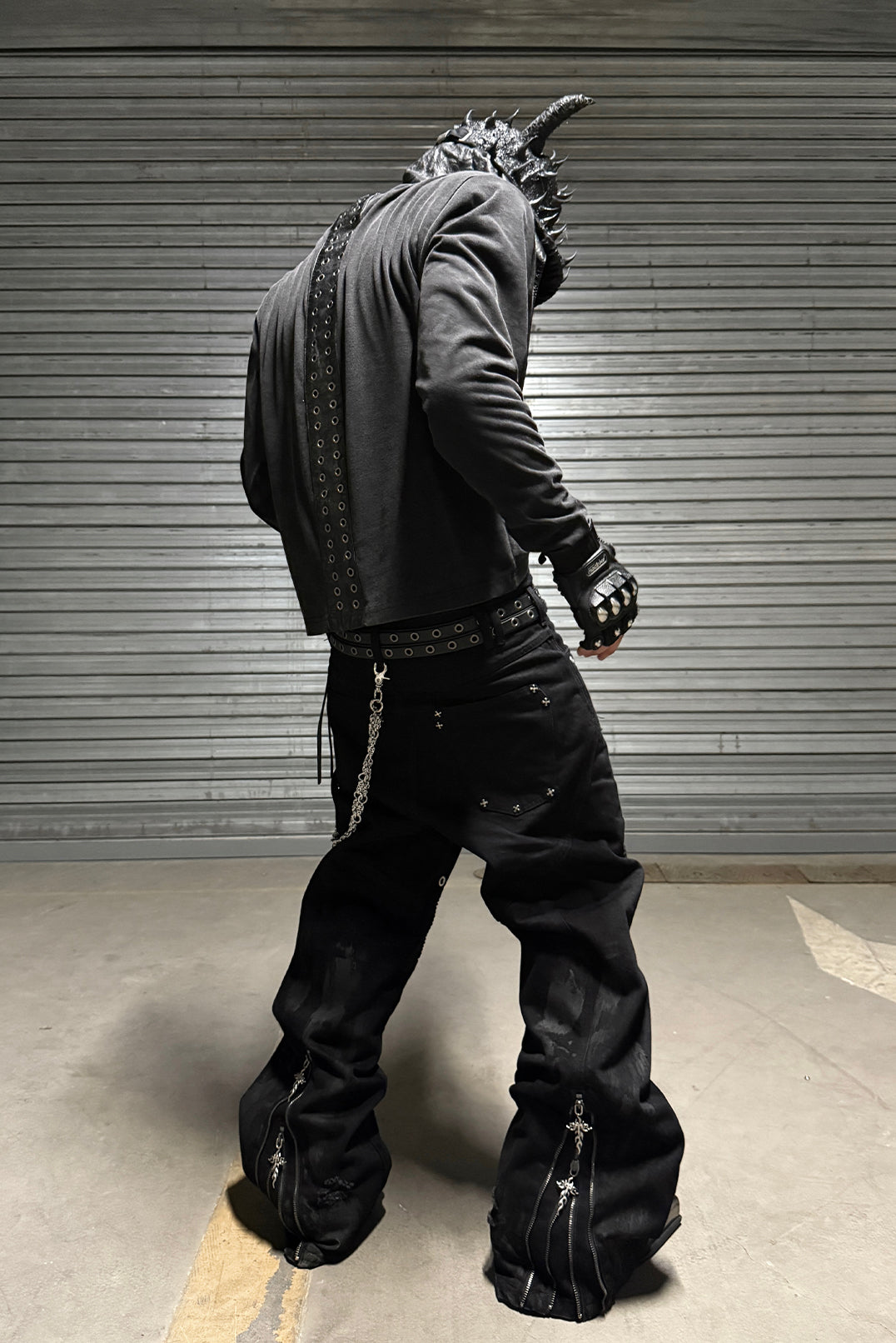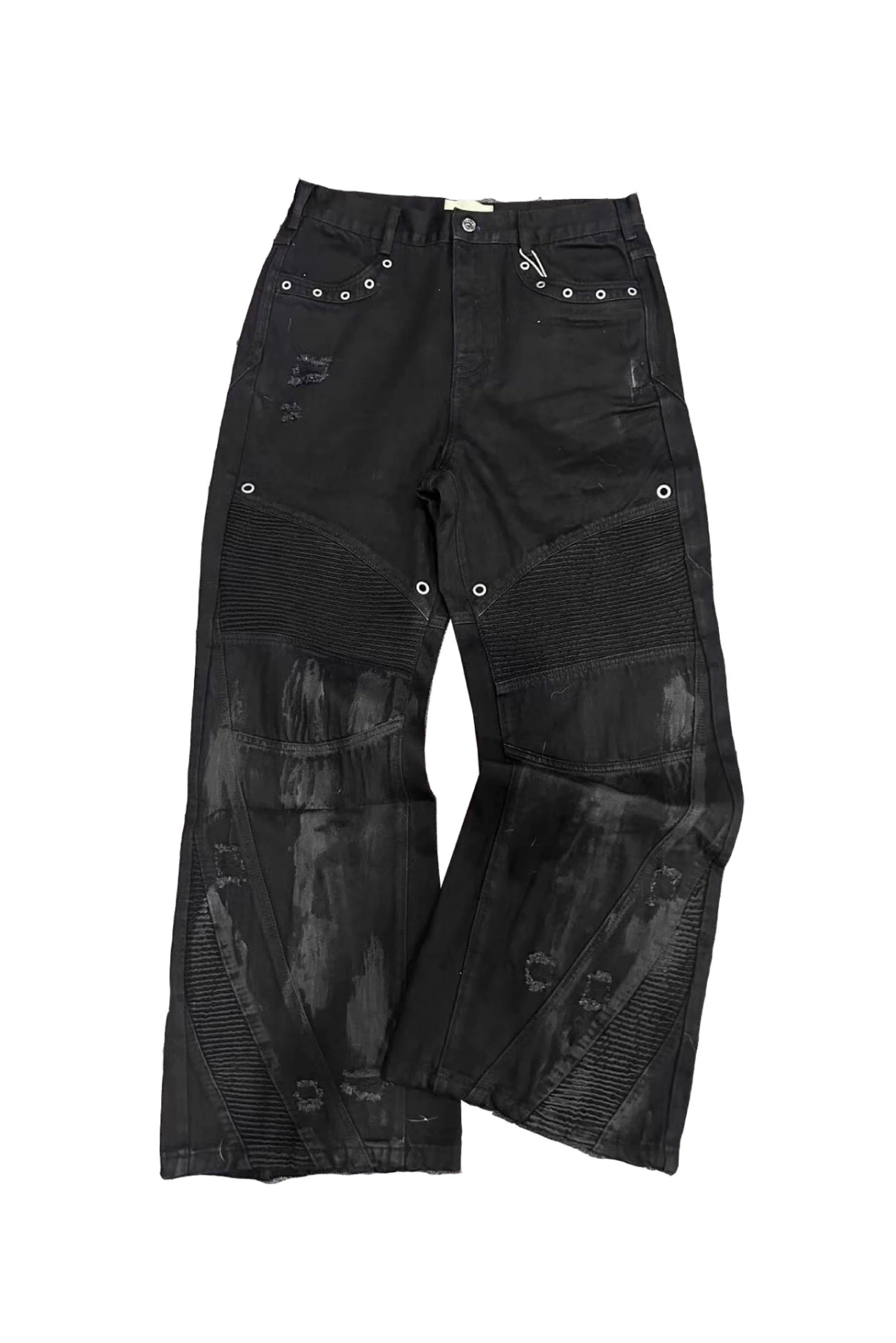 Crafted from heavyweight 14oz black denim, the fabric is dense, structured, and self-supporting.