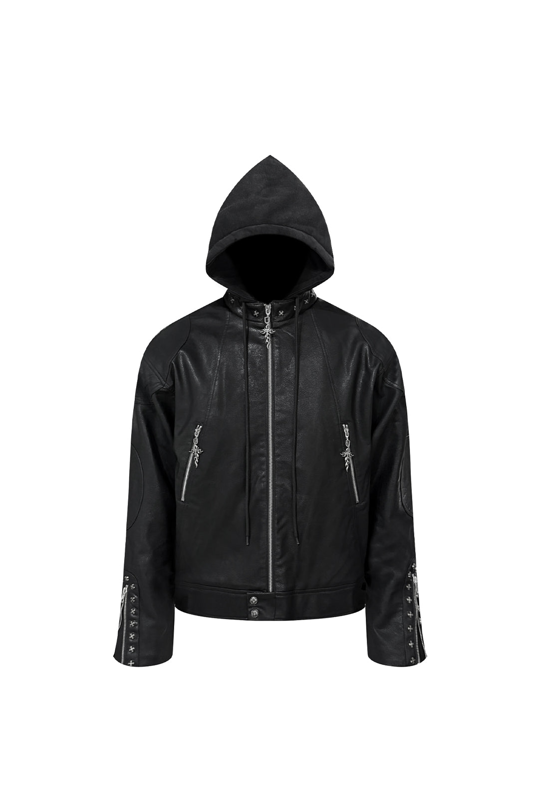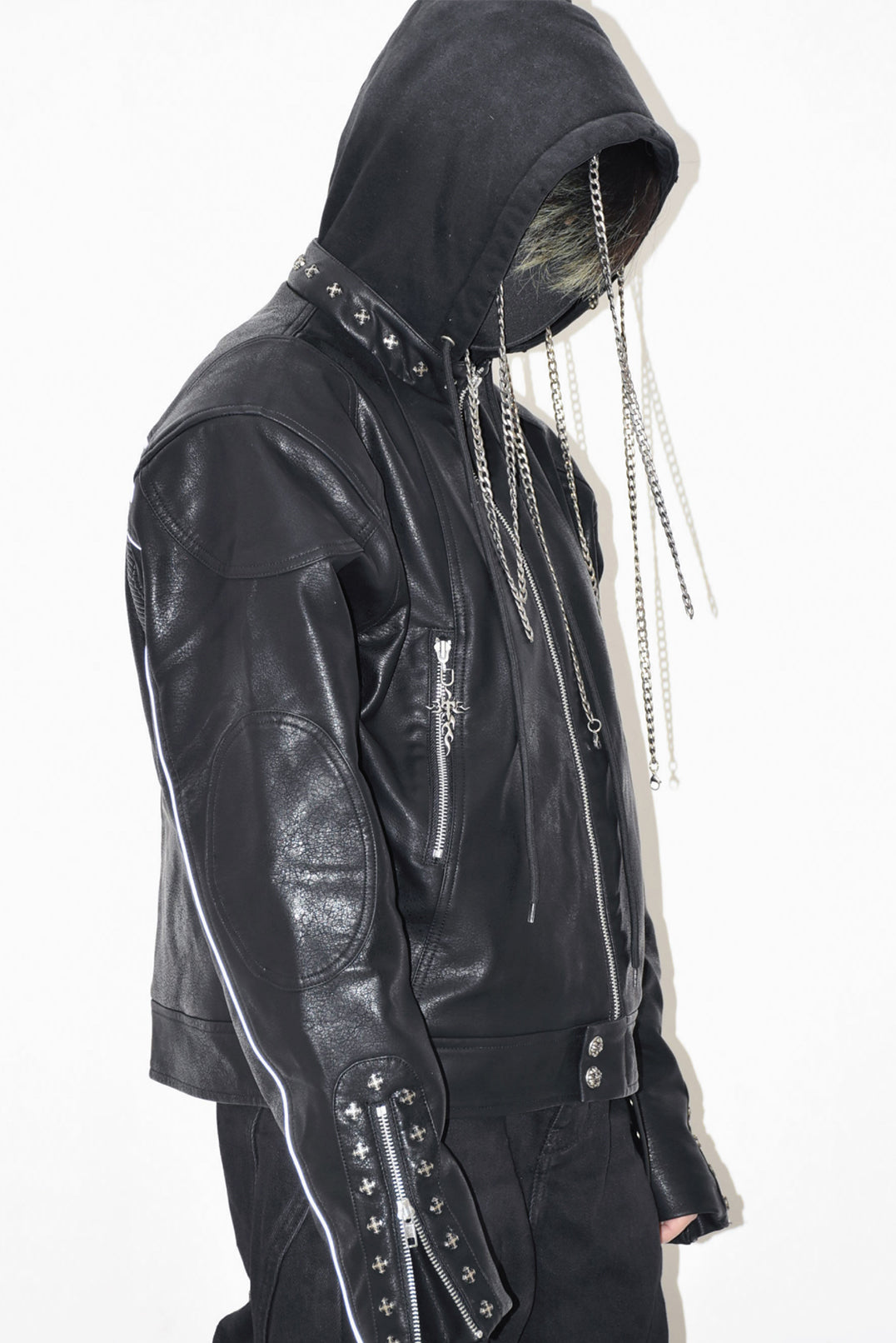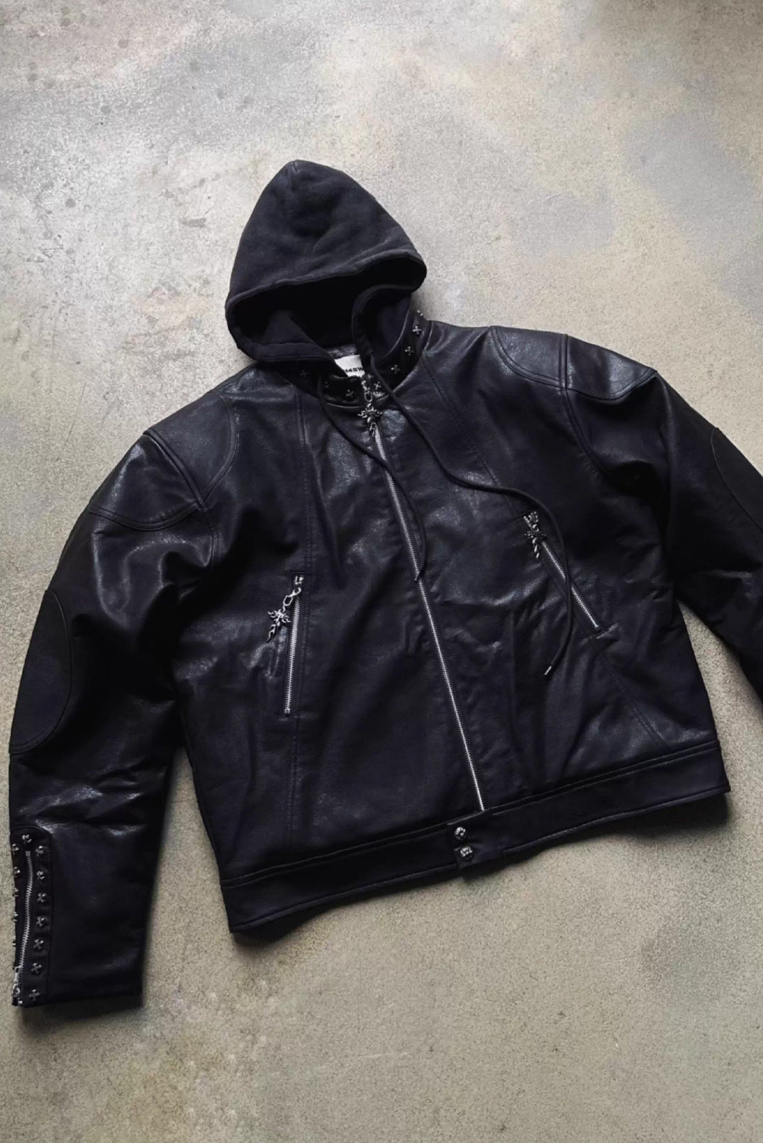 Built from composite leather with matte finish, this hooded jacket fuses gothic restraint with mechanical structure.