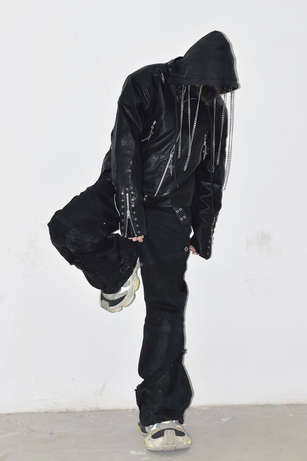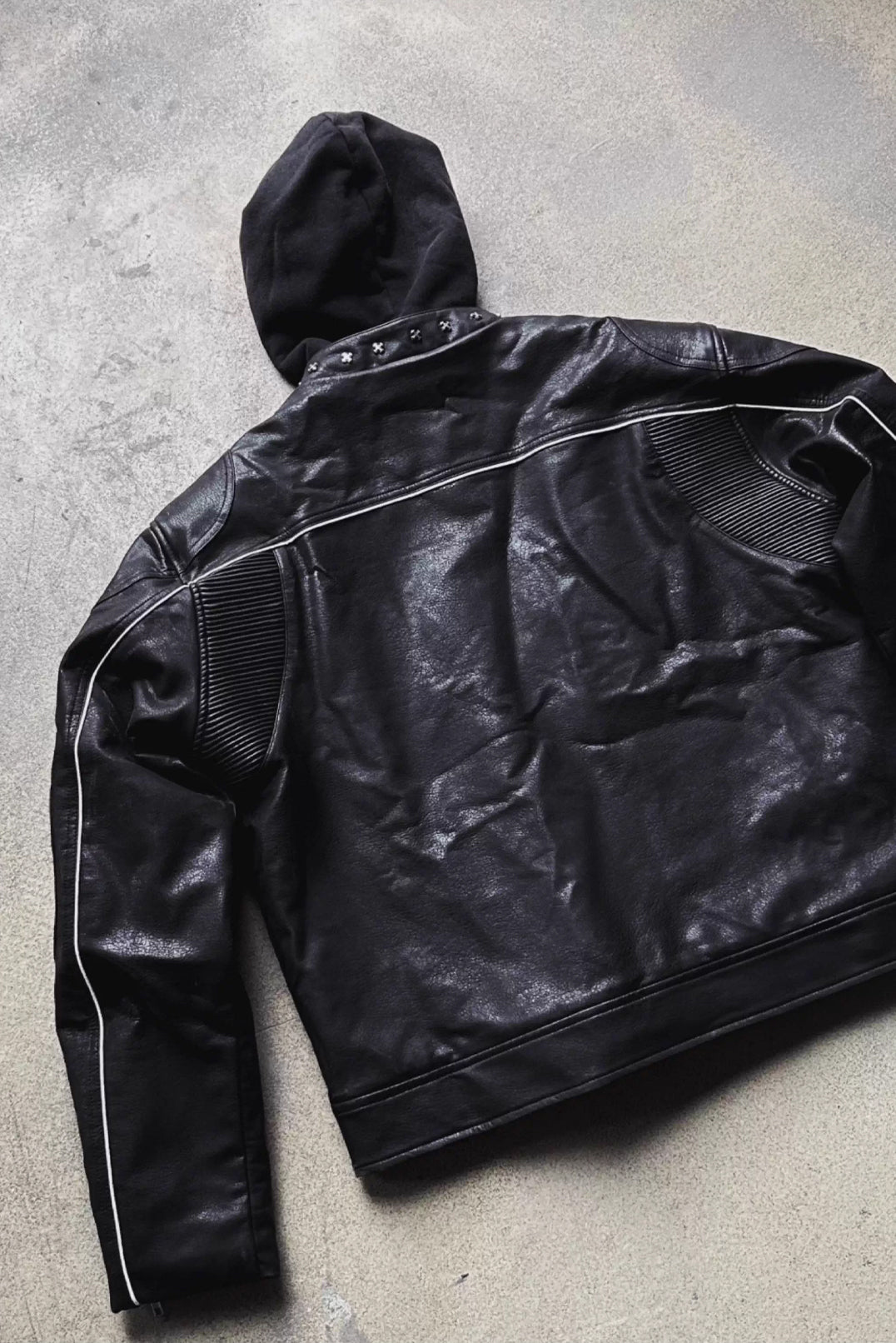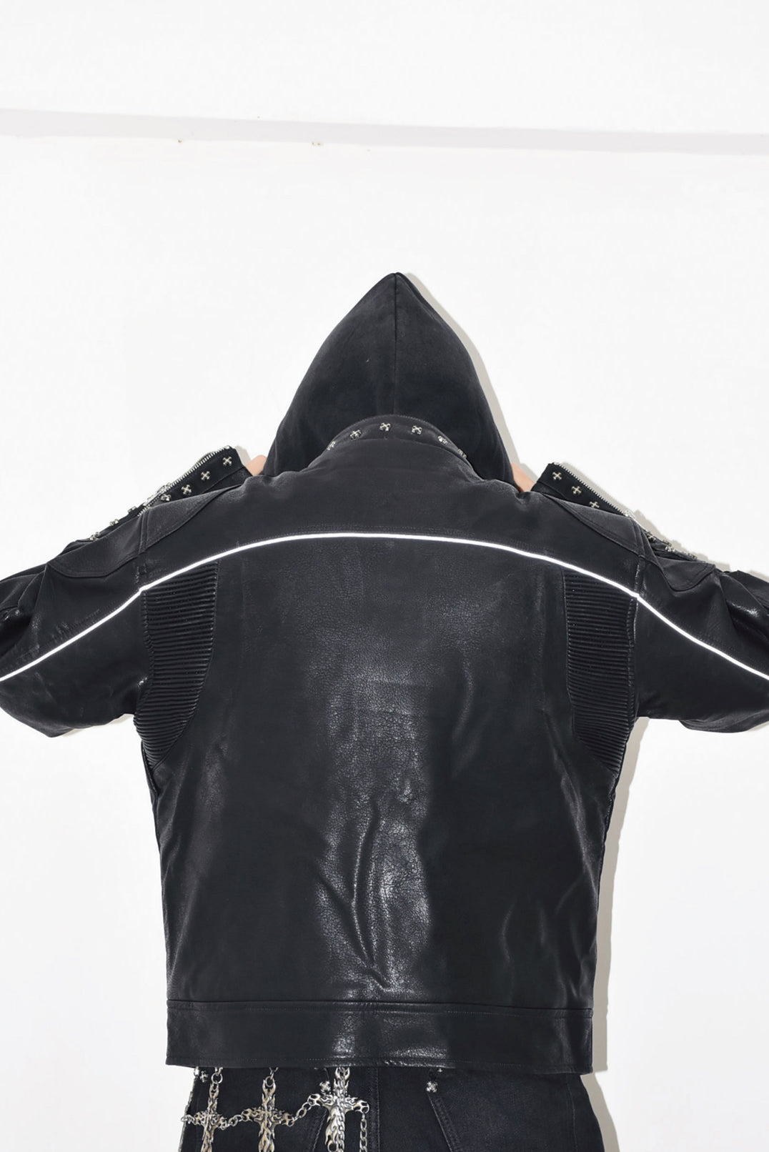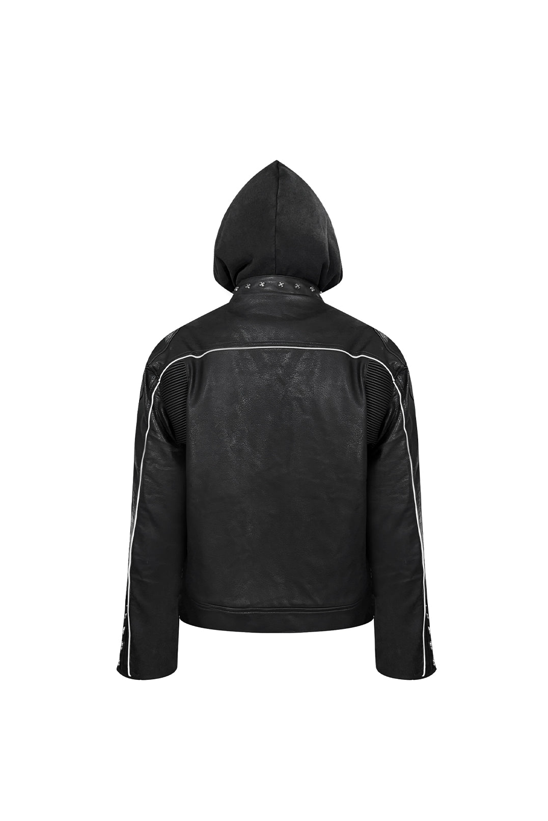 Built from composite leather with matte finish, this hooded jacket fuses gothic restraint with mechanical structure.