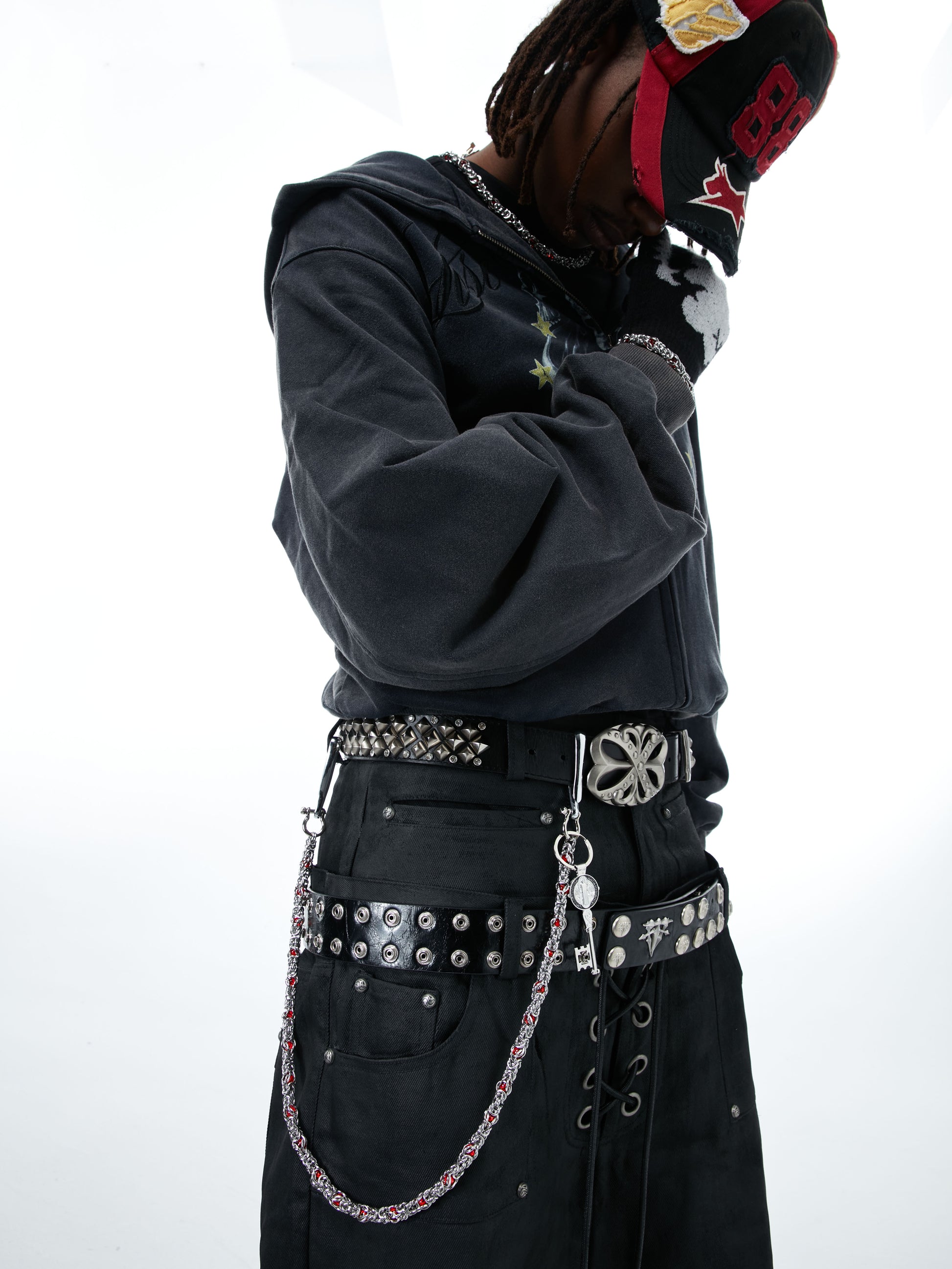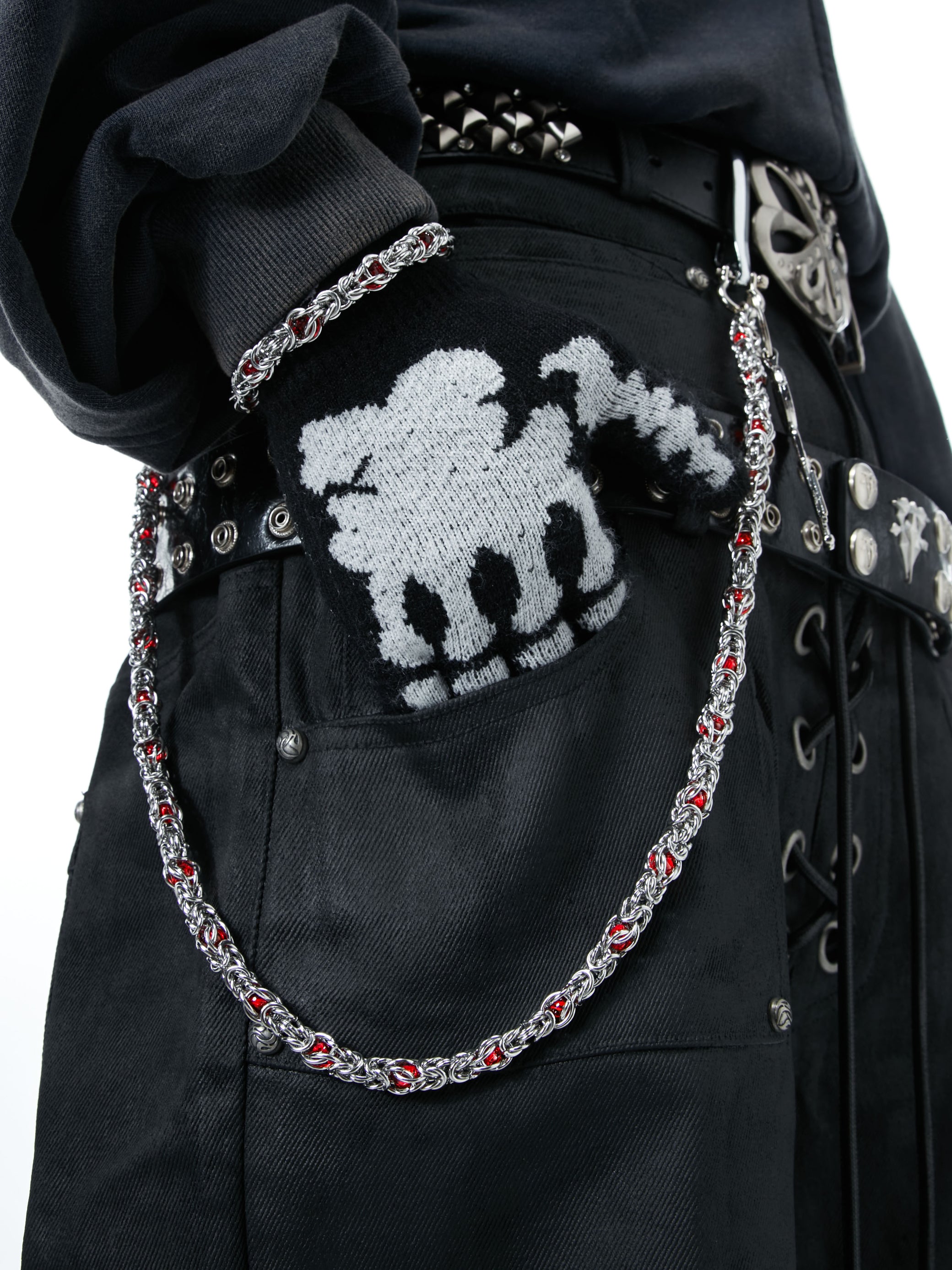 Handcrafted from premium titanium steel and designed exclusively by HOWSS, the Bloodline pant chain is a bold statement piece built to resist rust, oxidation, and wear—no maintenance needed. Multiple small red artisanal stones are embedded along the chain, catching the light to create a striking crimson gleam.