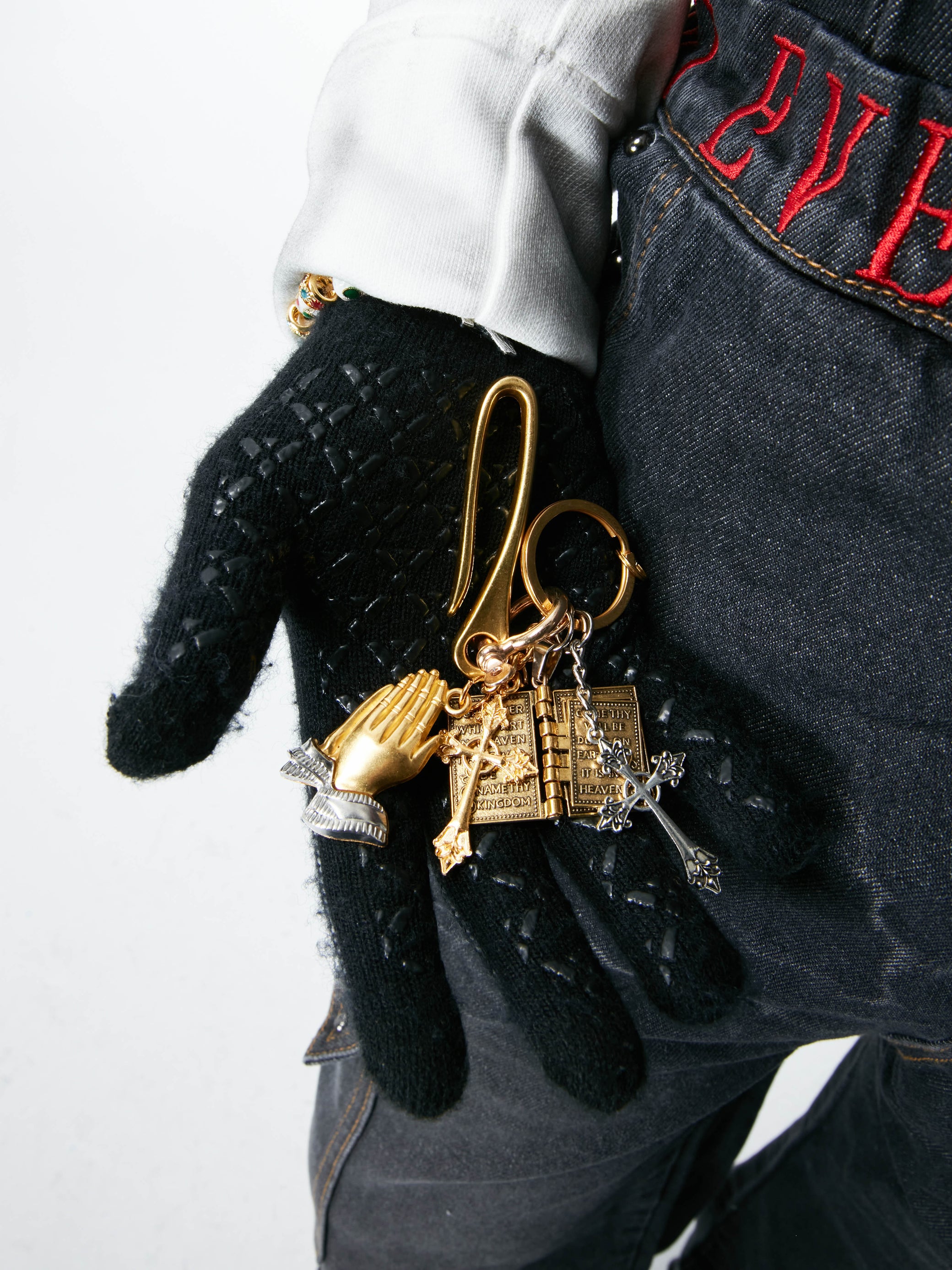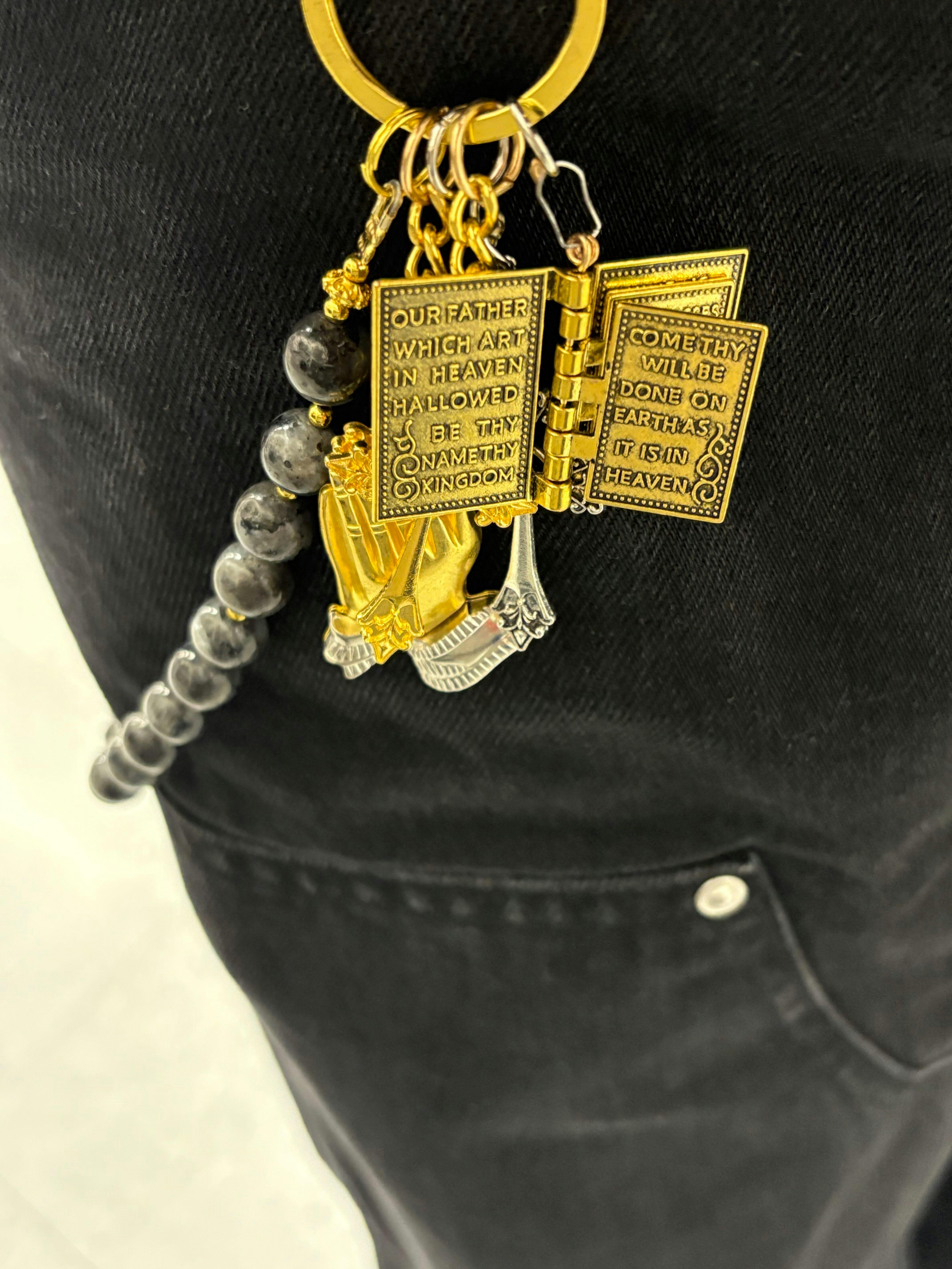• Titanium steel accents featuring a gold-tone Bible and cross