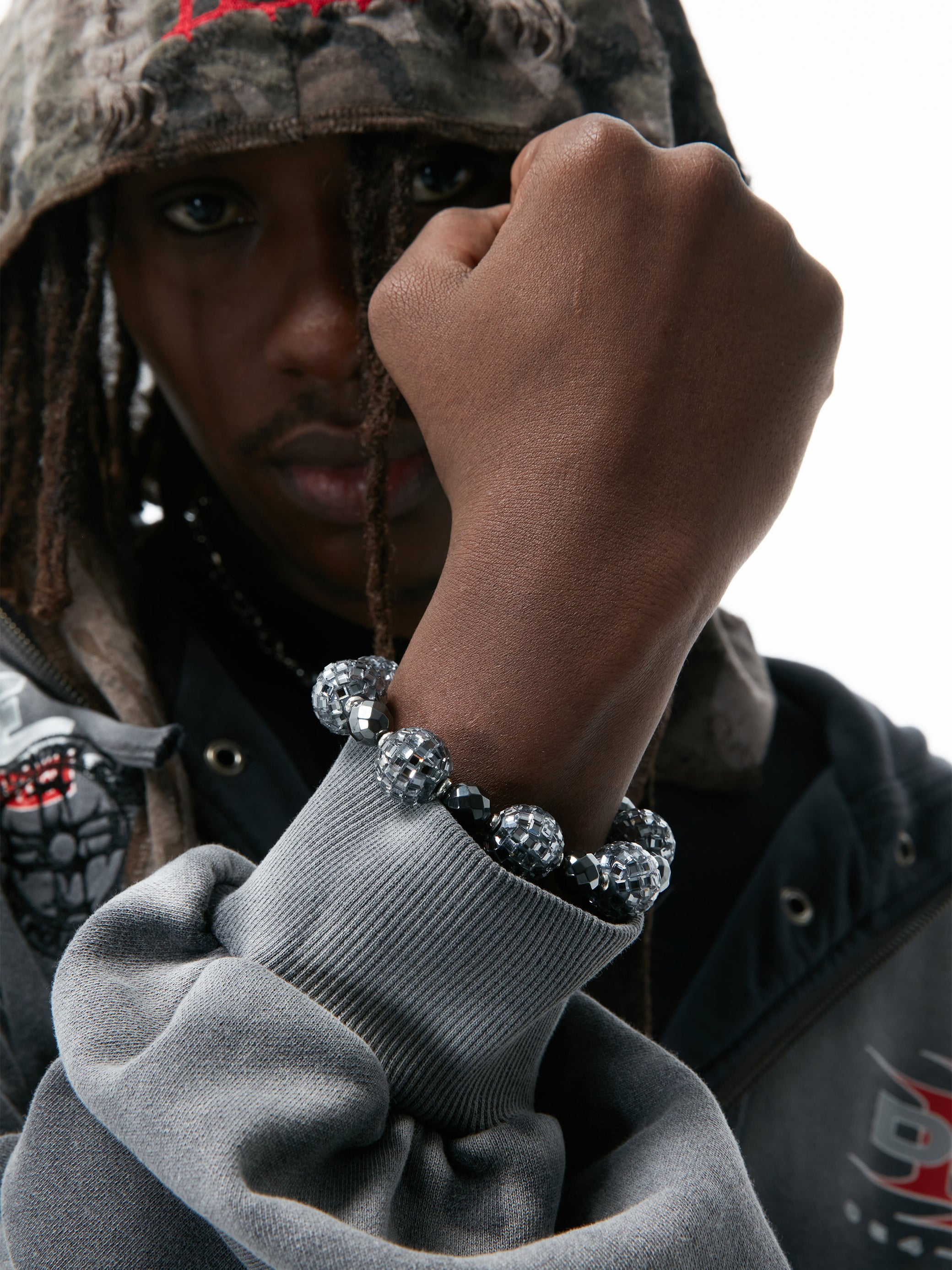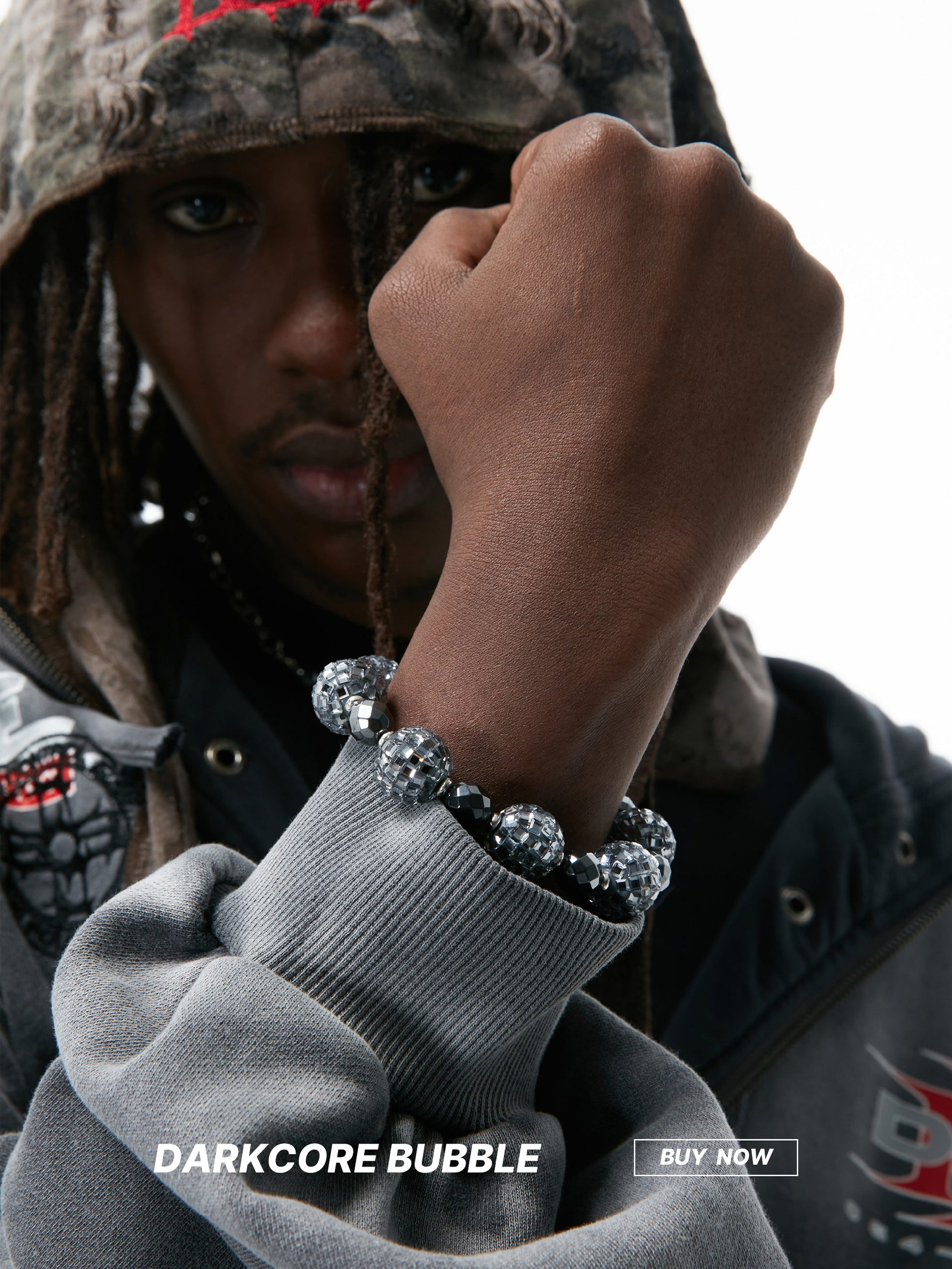 Exclusively designed by HOWSS, DARKCORE BUBBLE draws from the fractured glare of disco balls spinning in the dark — light breaking through shadow, chaos colliding with silence.