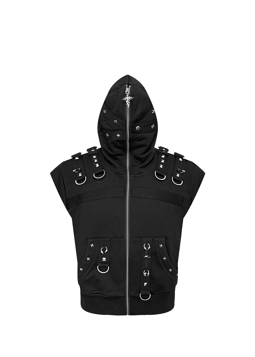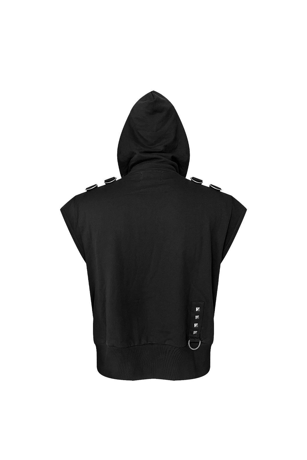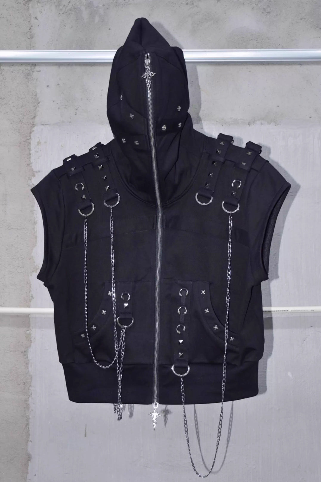 Built for the streets, this sleeveless hoodie fuses utilitarian hardware with gothic attitude.