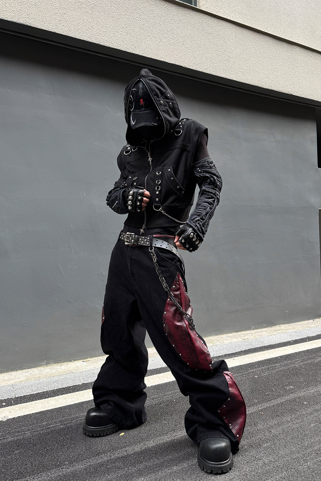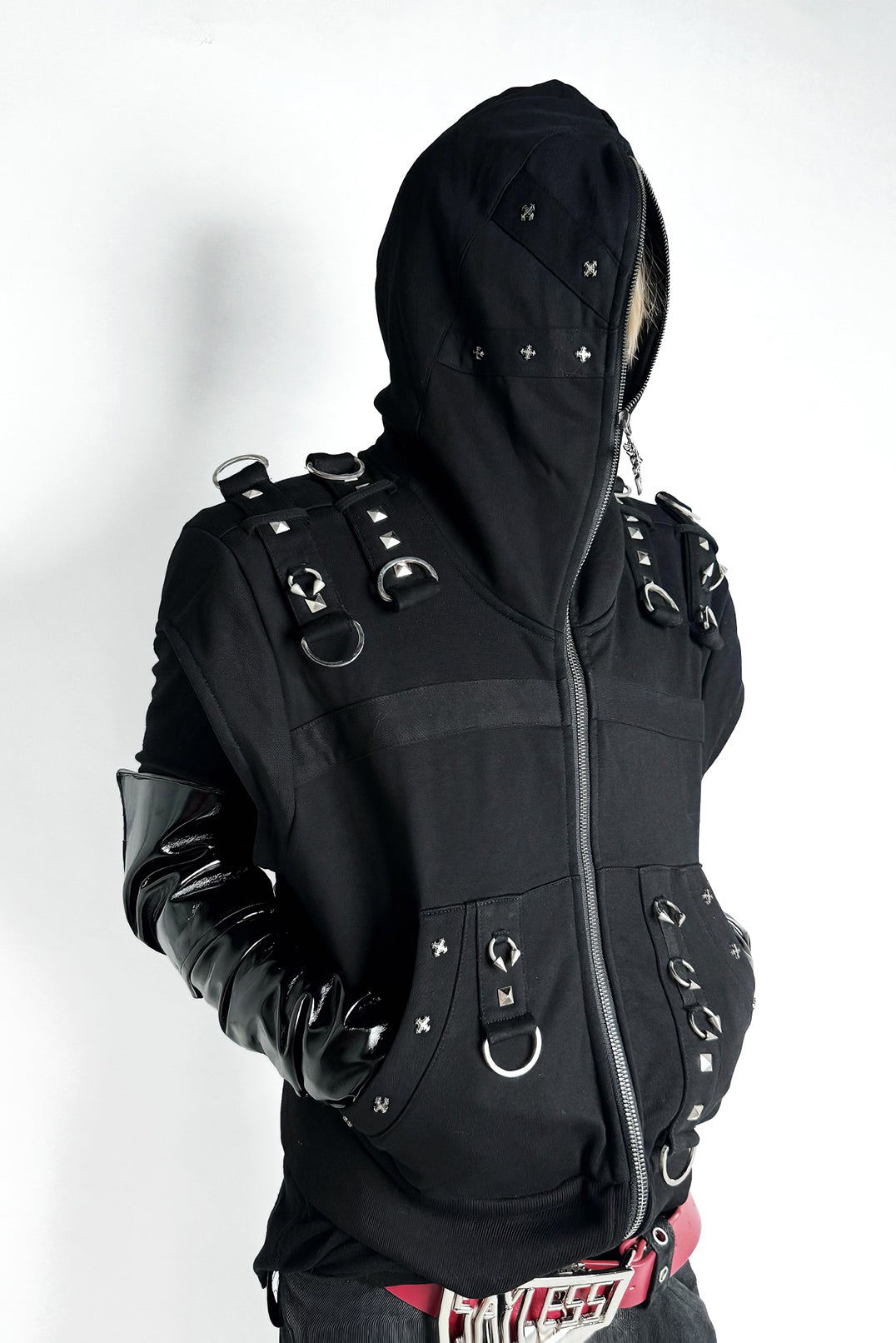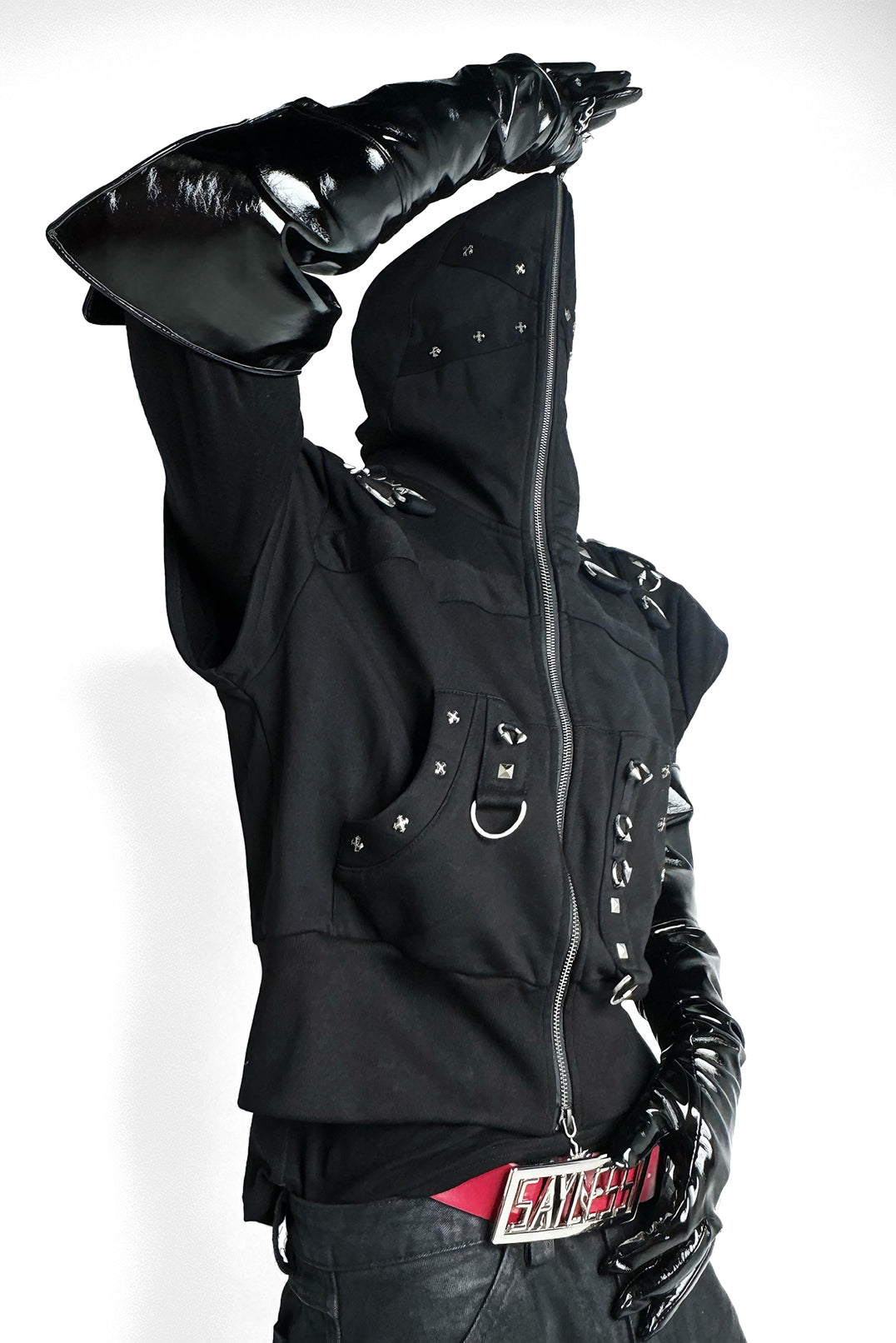 Built for the streets, this sleeveless hoodie fuses utilitarian hardware with gothic attitude.