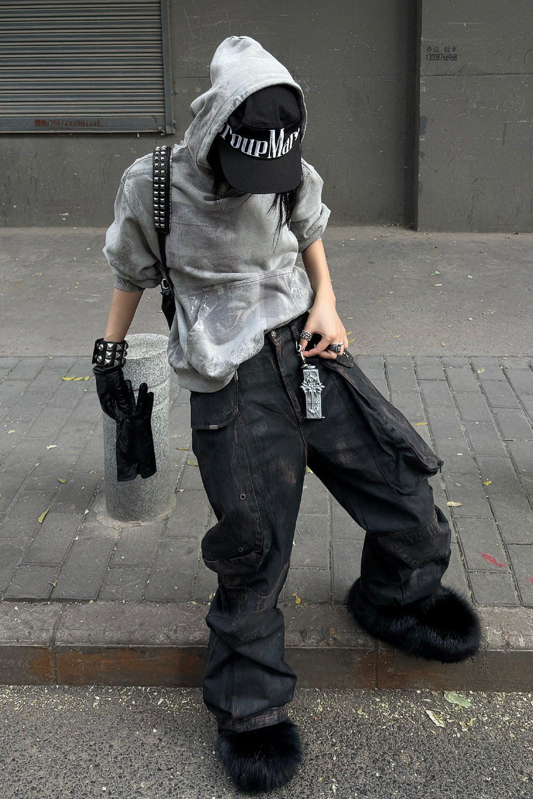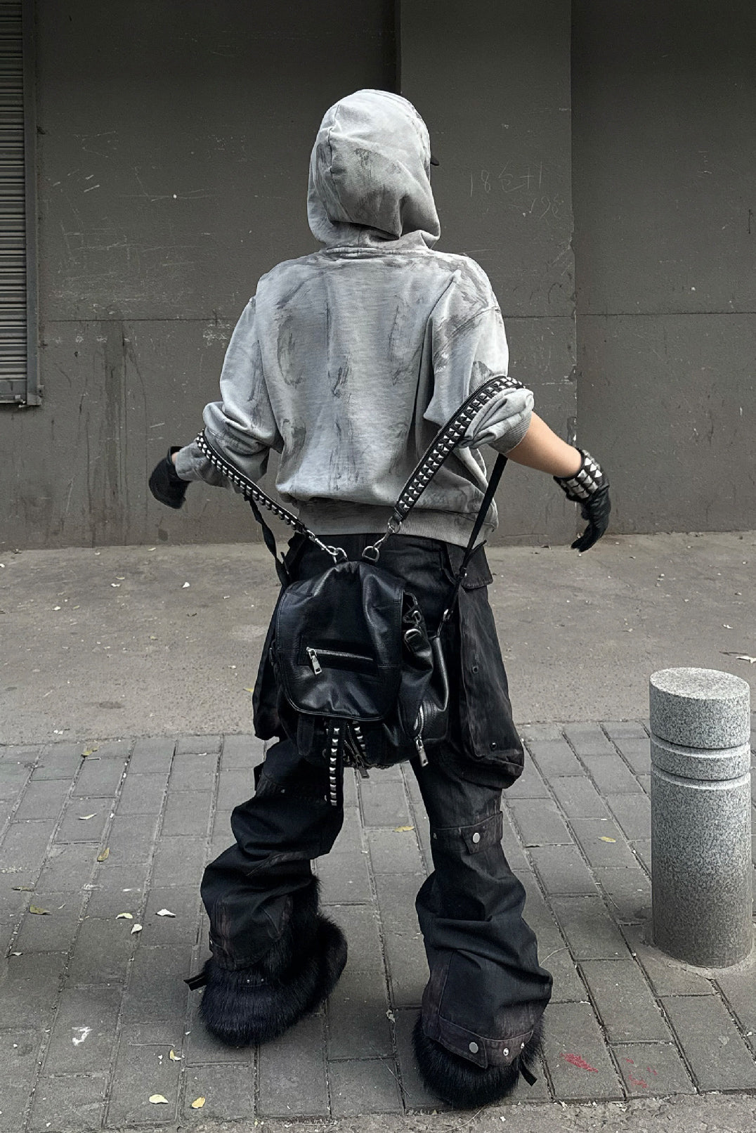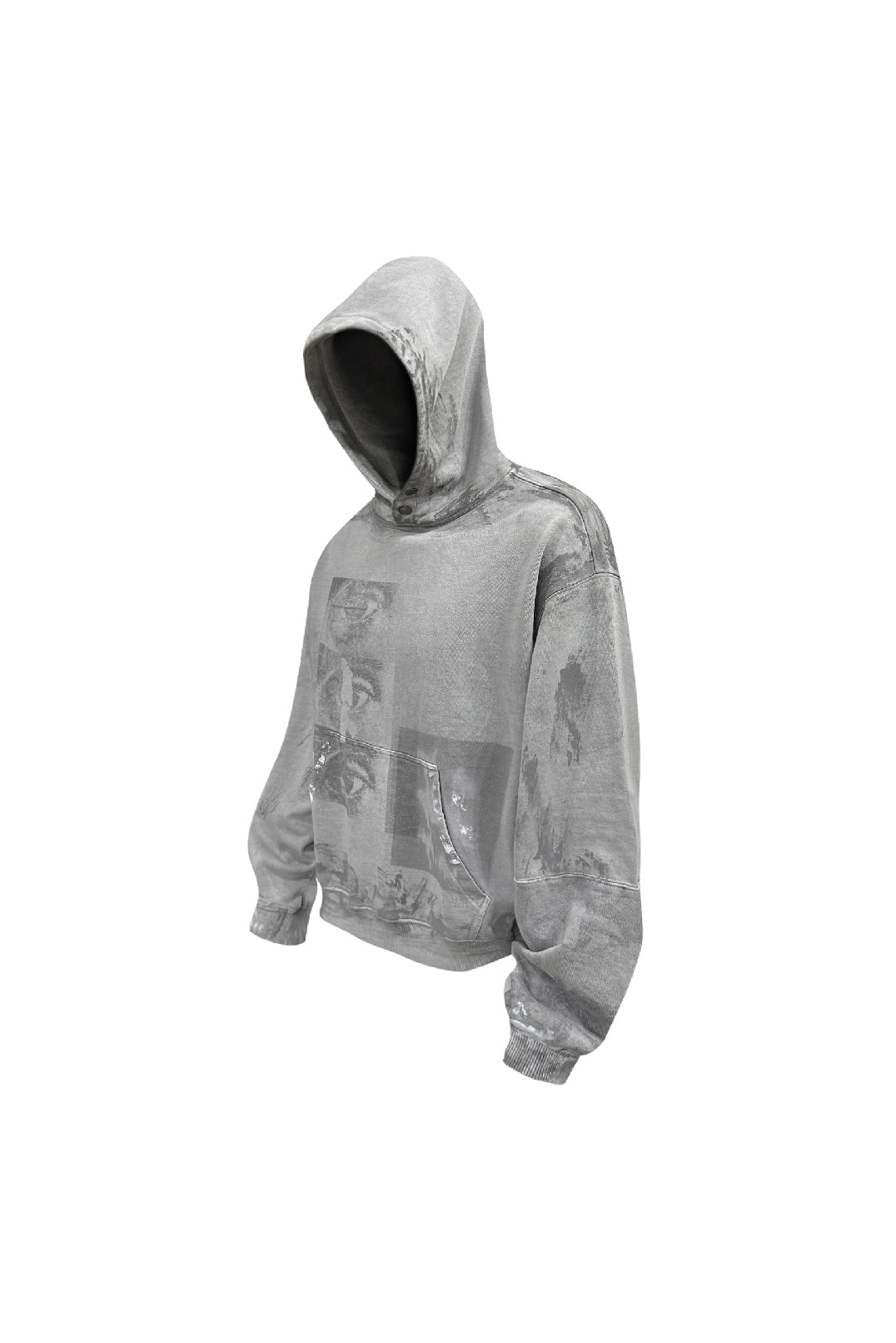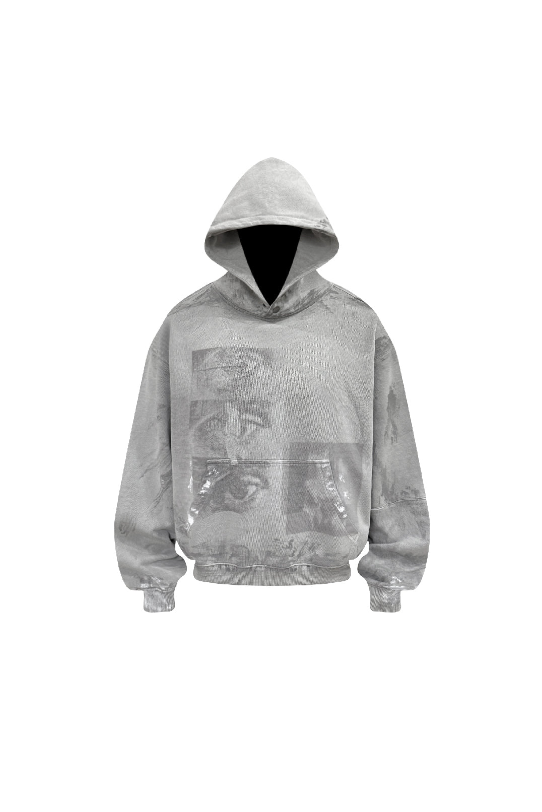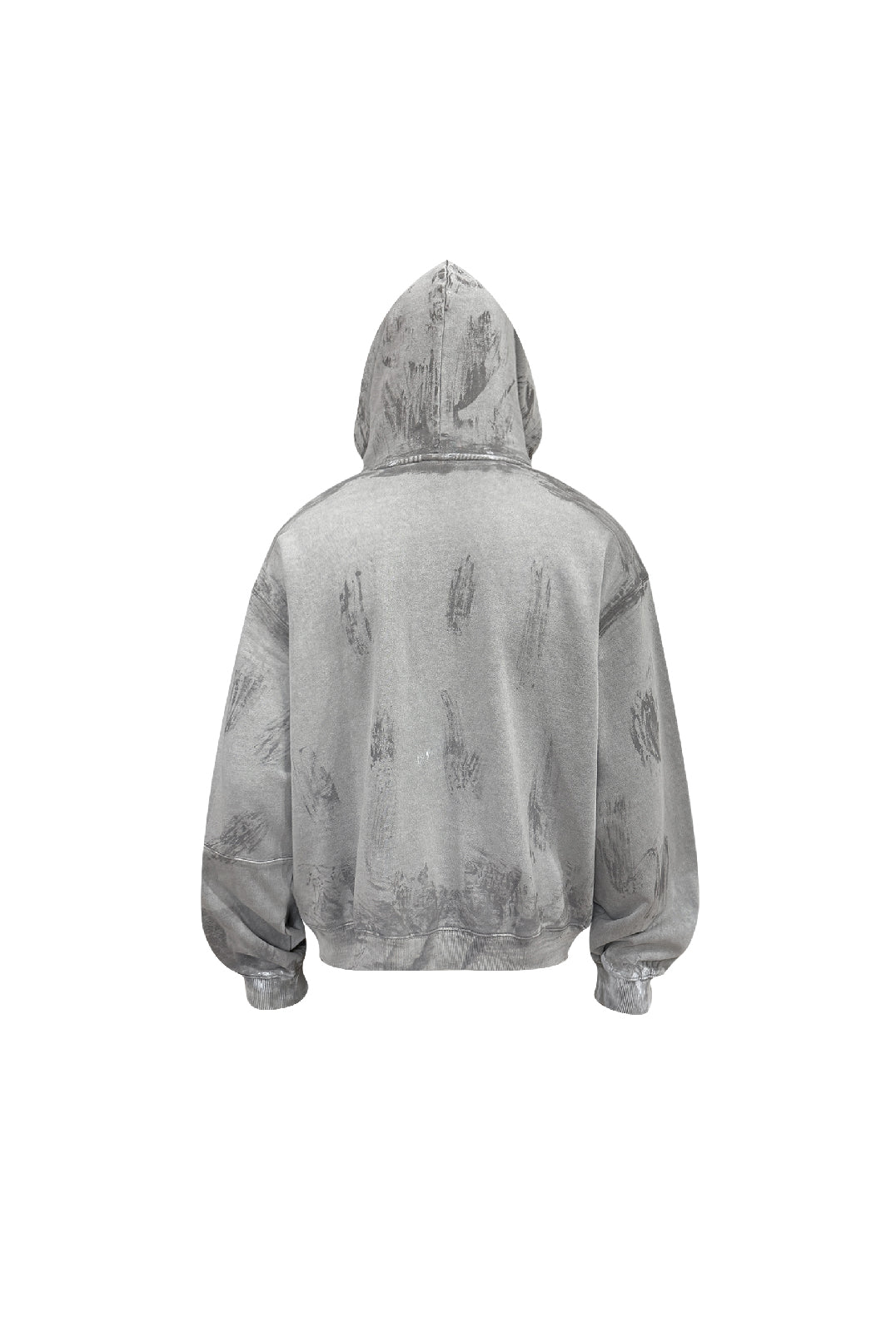 Made from heavyweight 450g pure cotton fleece, the fabric feels soft on skin while maintaining structure. The front features a white-ink print with a breathable, no-plastic hand feel. Finished through garment over-dyeing, color frying, hand-applied wax brushing, and subtle paint splatter effects, each piece carries layered textures and complex surface character.