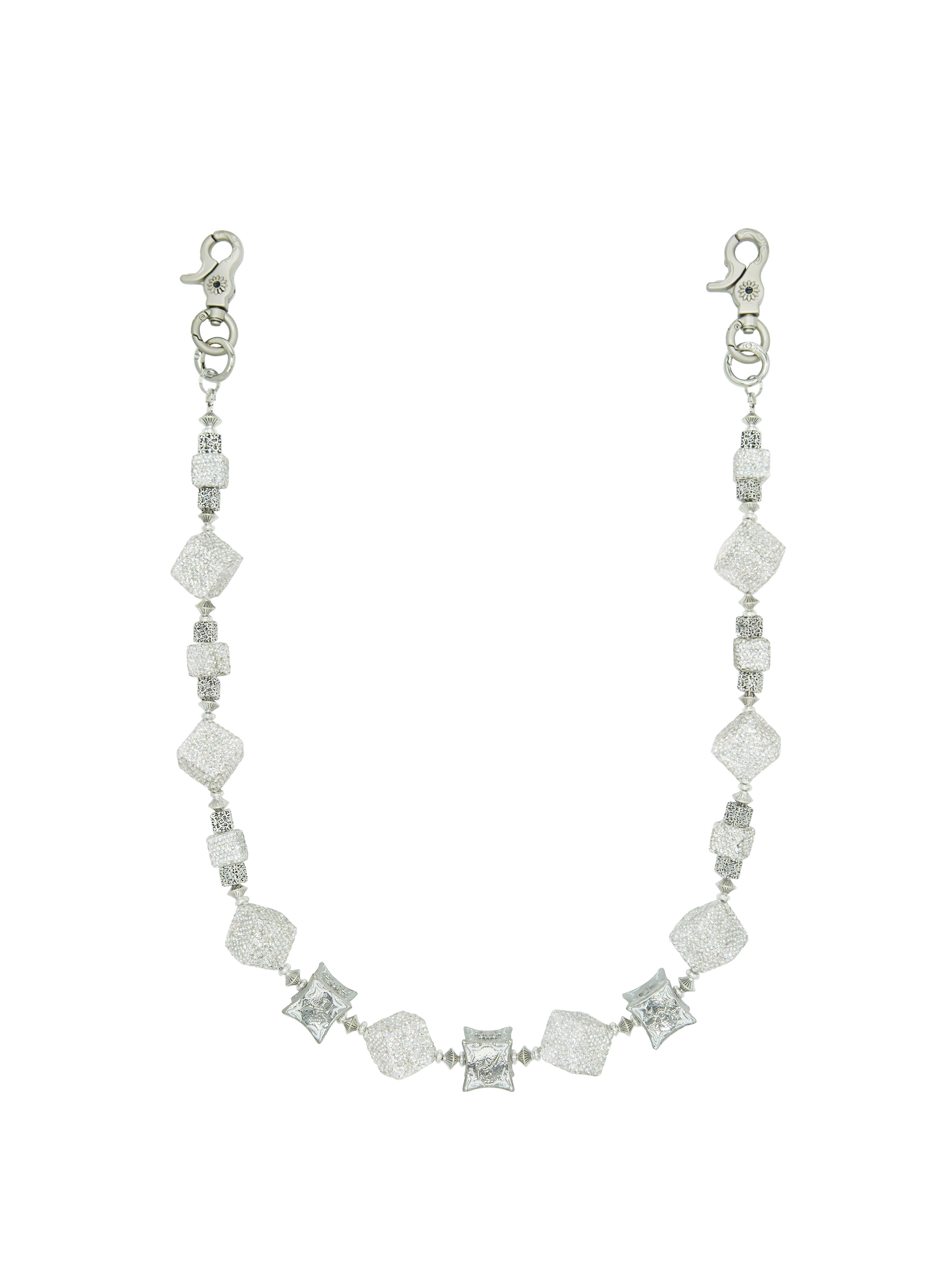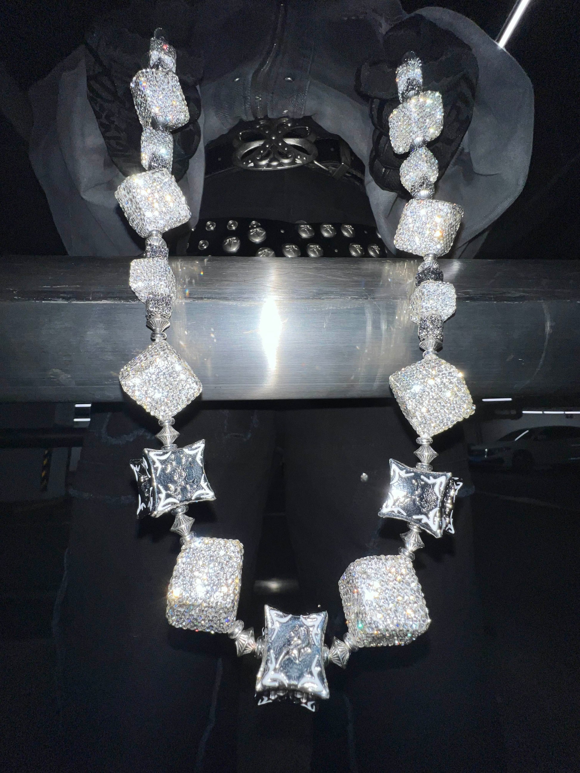 Built with optical-grade resin links and reinforced metal joints. Three square segments are crafted from high-grade alloy with a white gold–plated finish, adding contrast and weight to the shine.