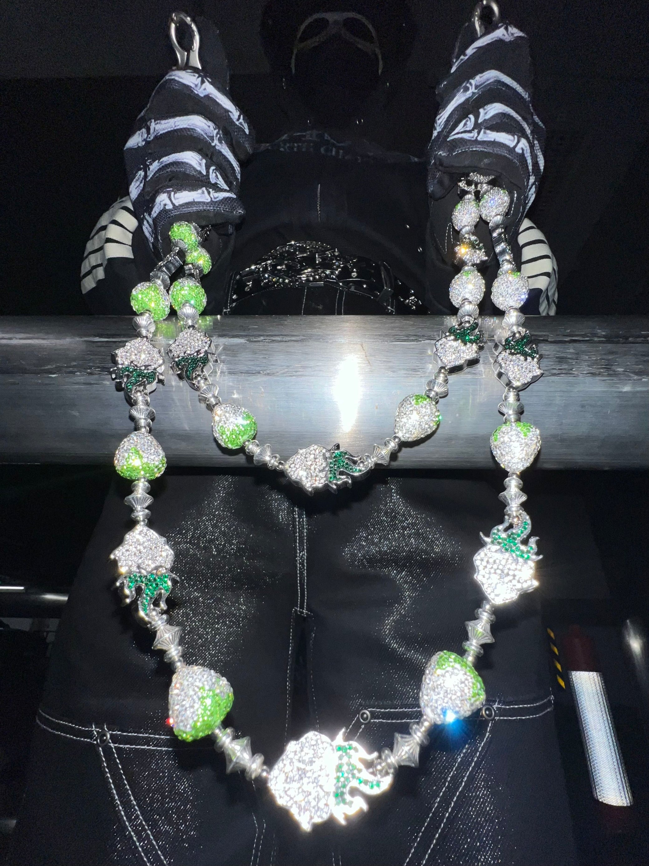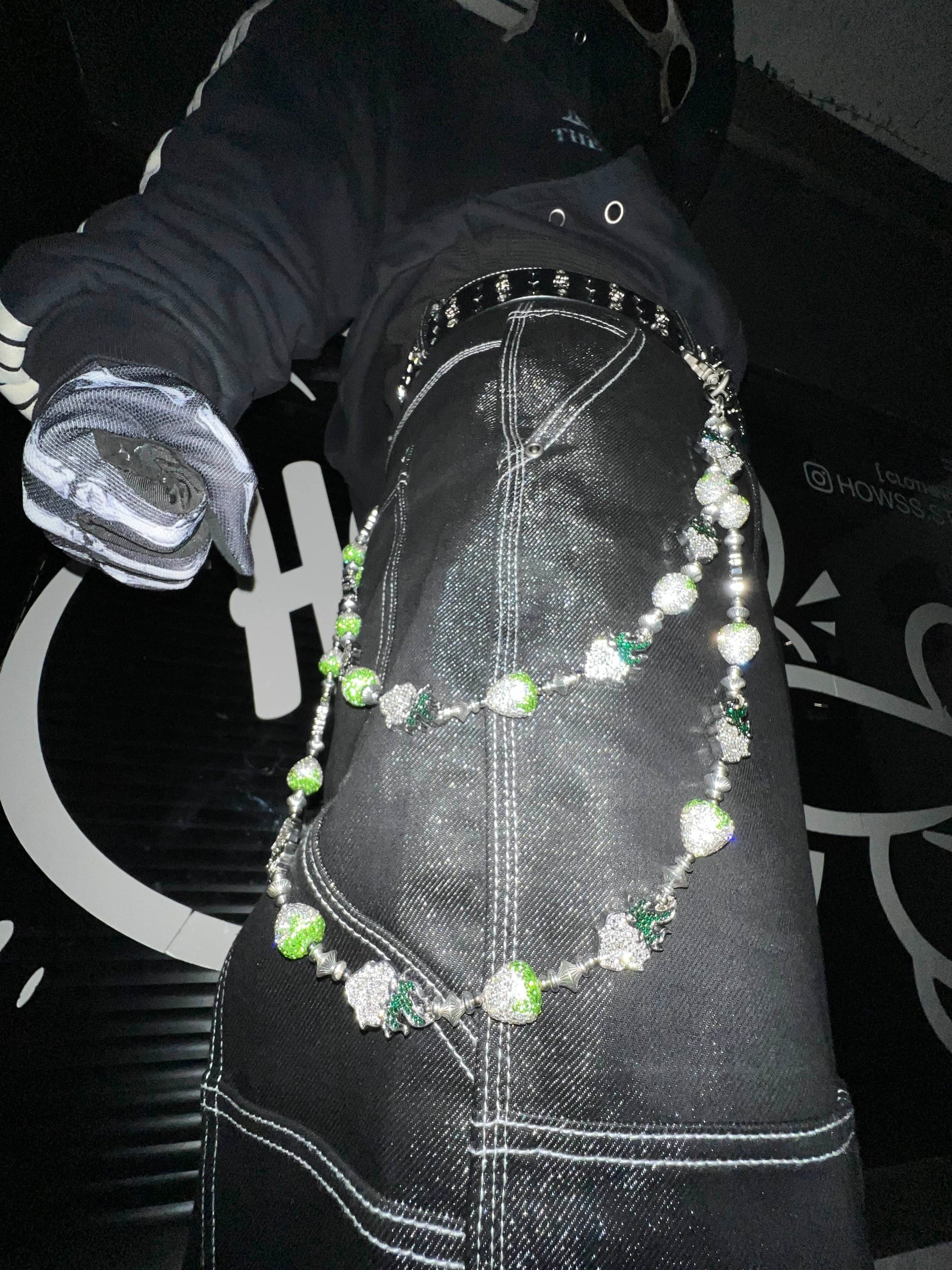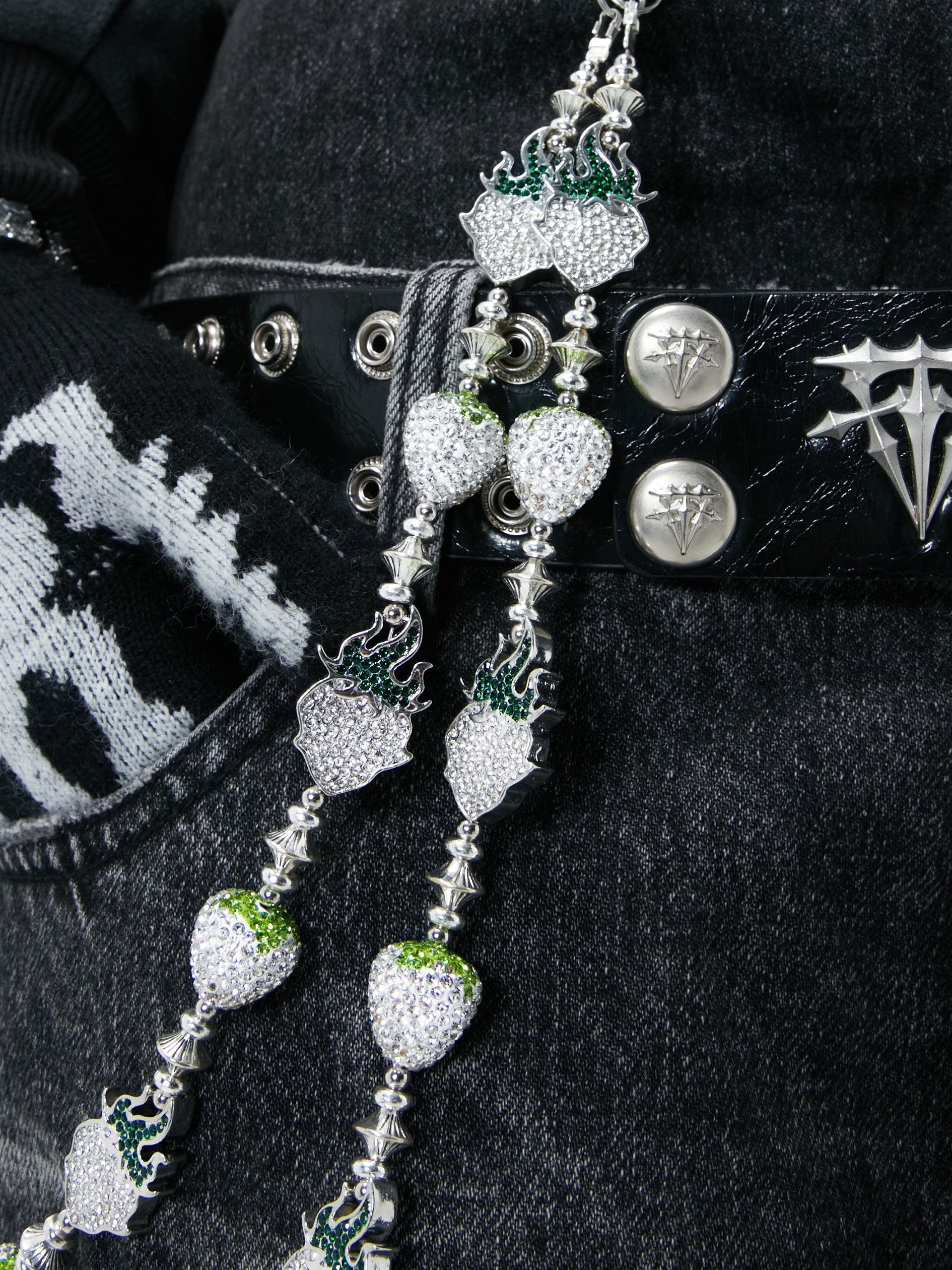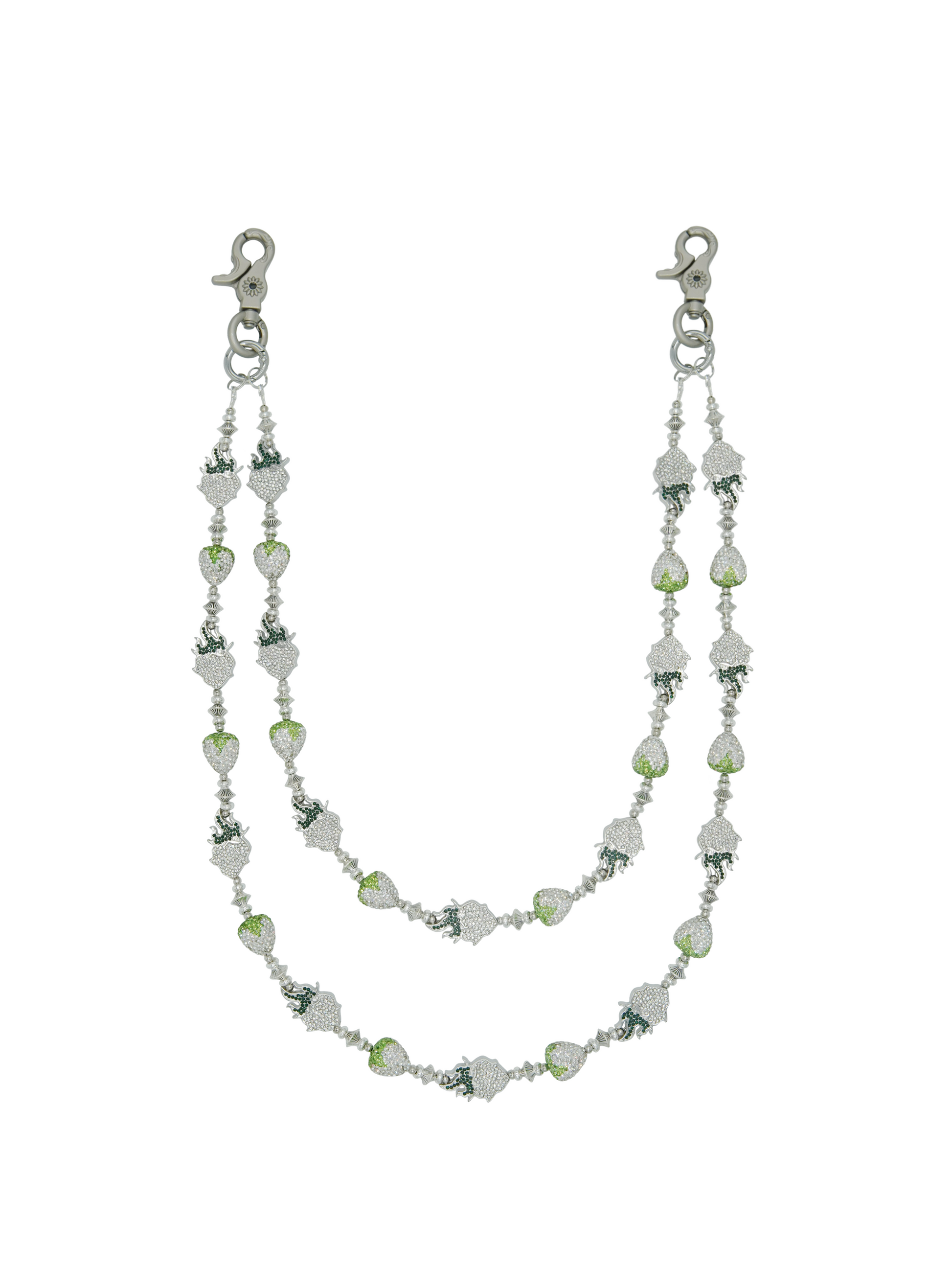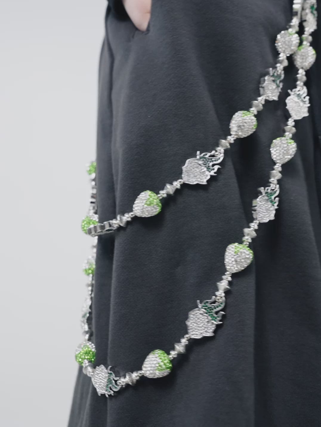 Built with a dual-layer alloy chain, engineered for weight and durability. The flat strawberry pendant is alloy-cast and stone-set for a sharp reflective finish. The rounded strawberry form is crafted from soft ceramic clay with hand-inlaid rhinestones, adding organic contrast to the metal structure.