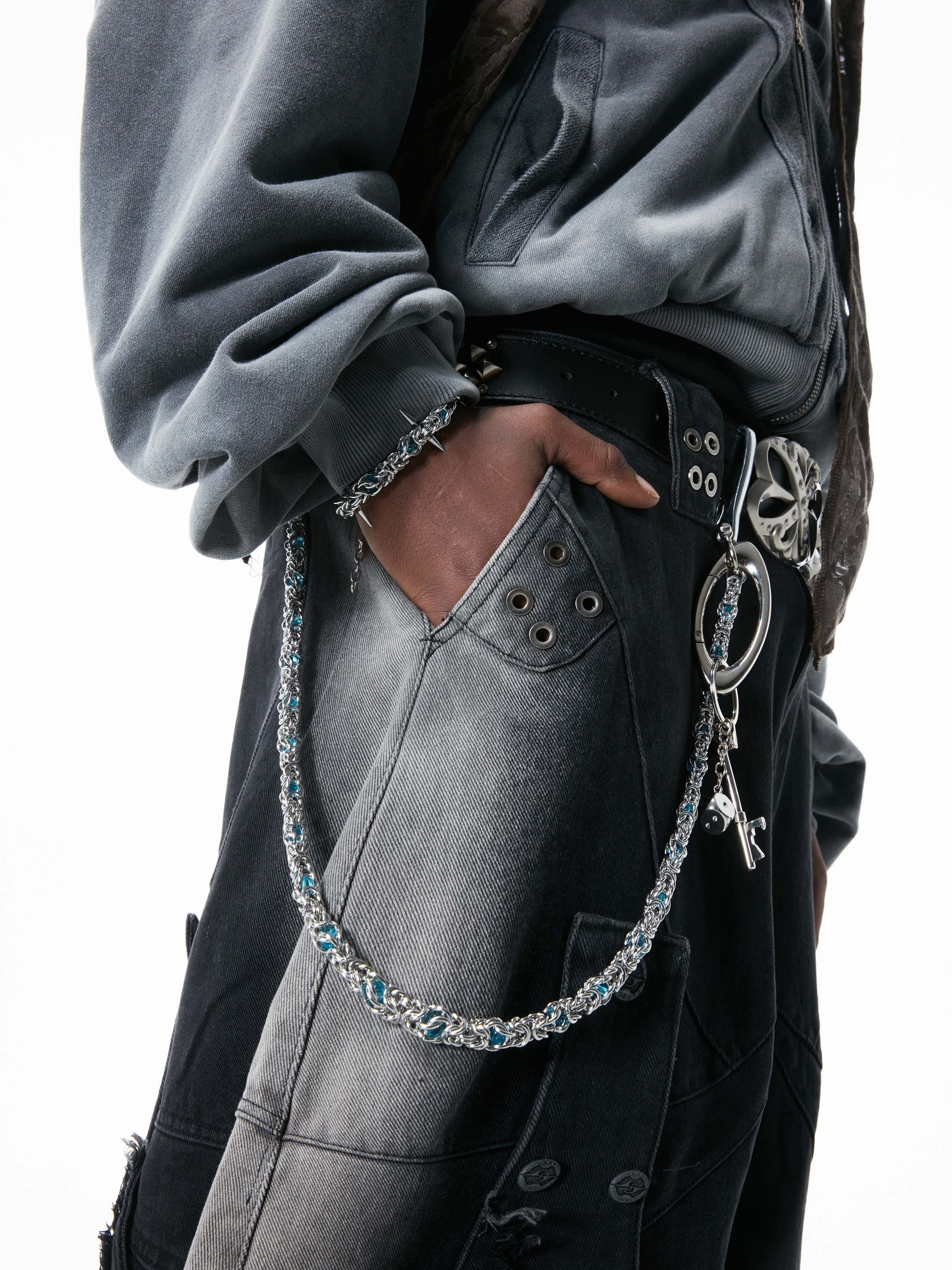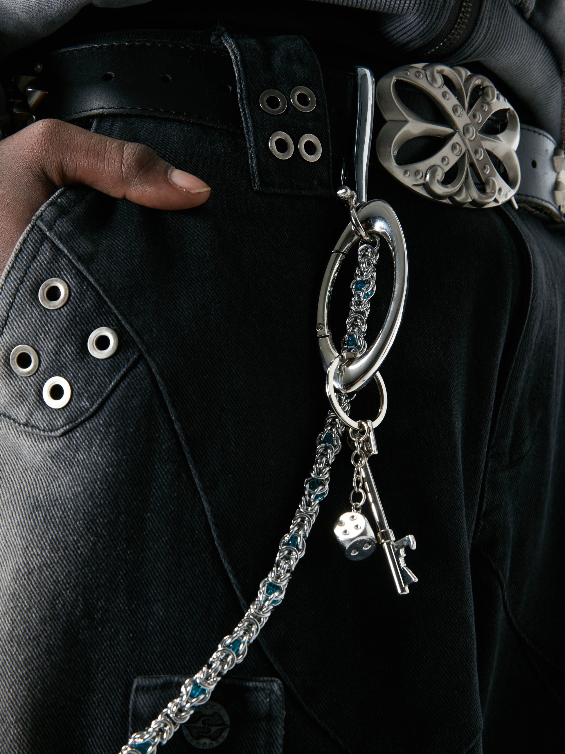 Handcrafted from premium titanium steel and designed exclusively by HOWSS, the frostline pant chain is a bold statement piece built to resist rust, oxidation, and wear—no maintenance needed. Multiple small blue artisanal stones are embedded along the chain, catching the light to create a striking blue-purple gleam. The chain is decorated with a key and a dice, adding a rebellious touch to the street-inspired design.