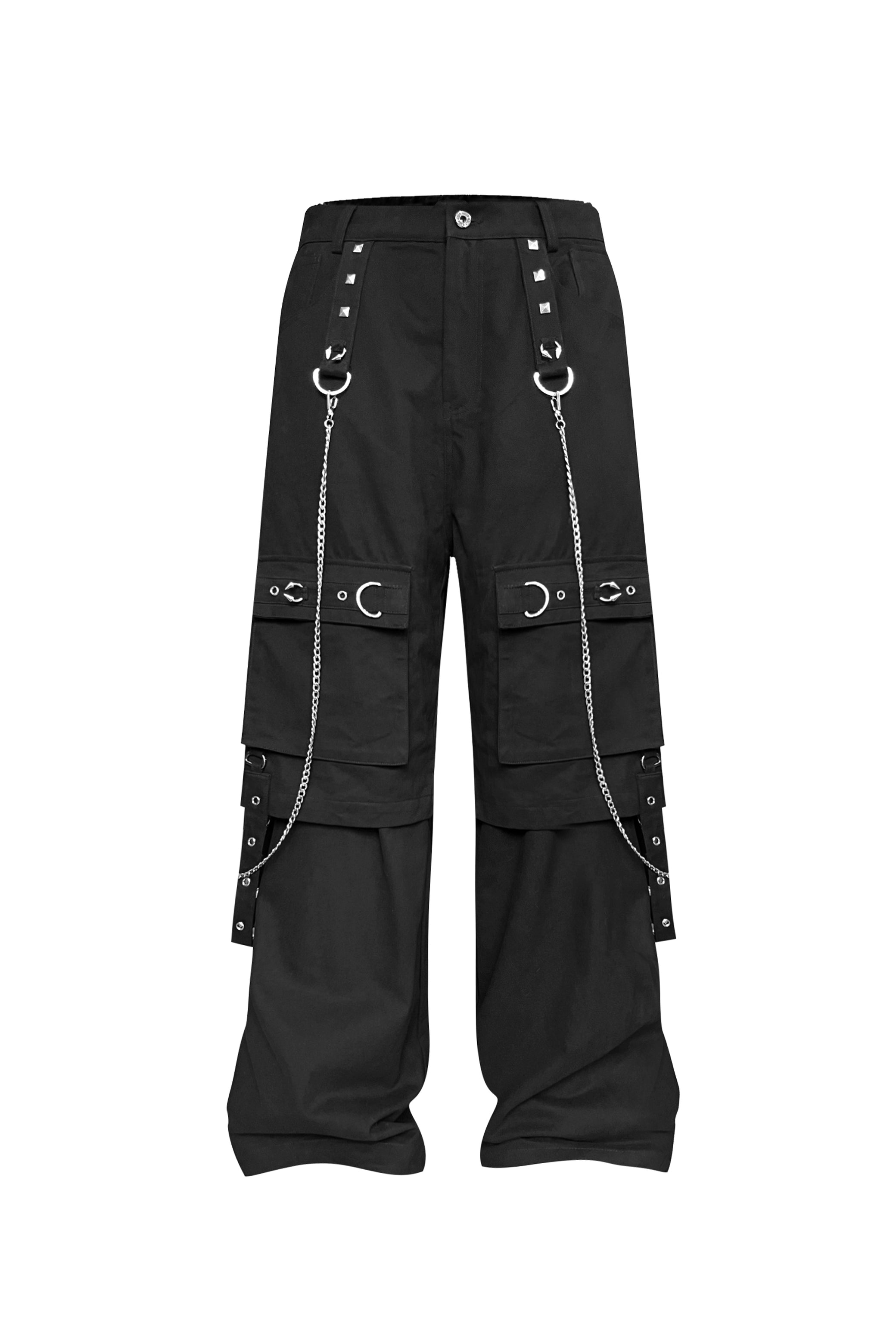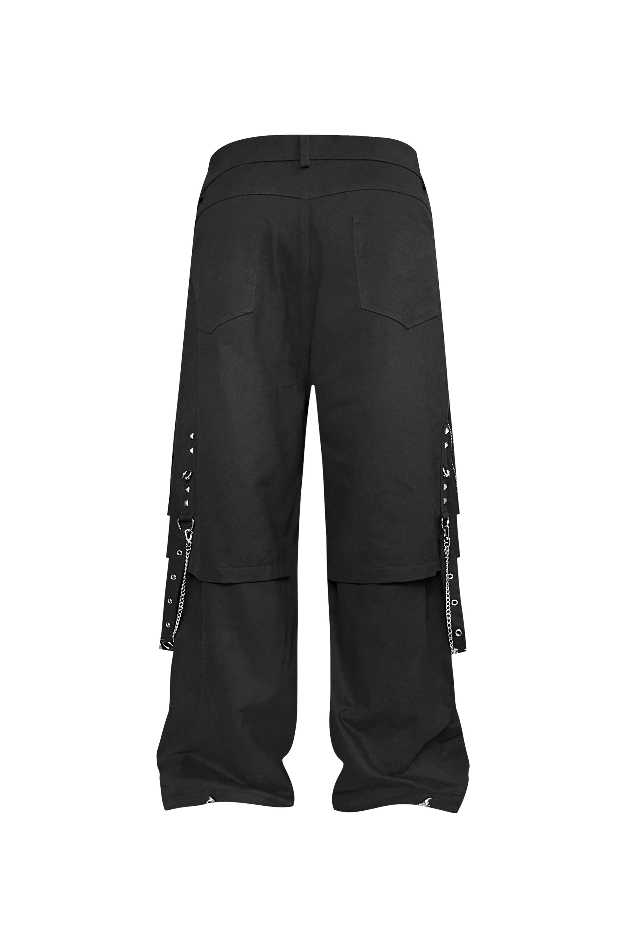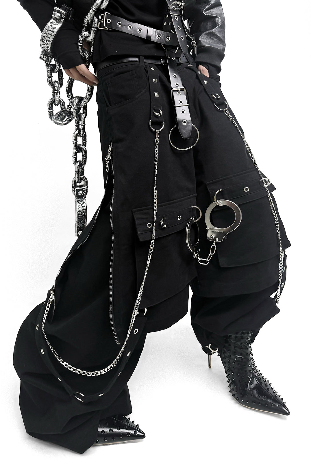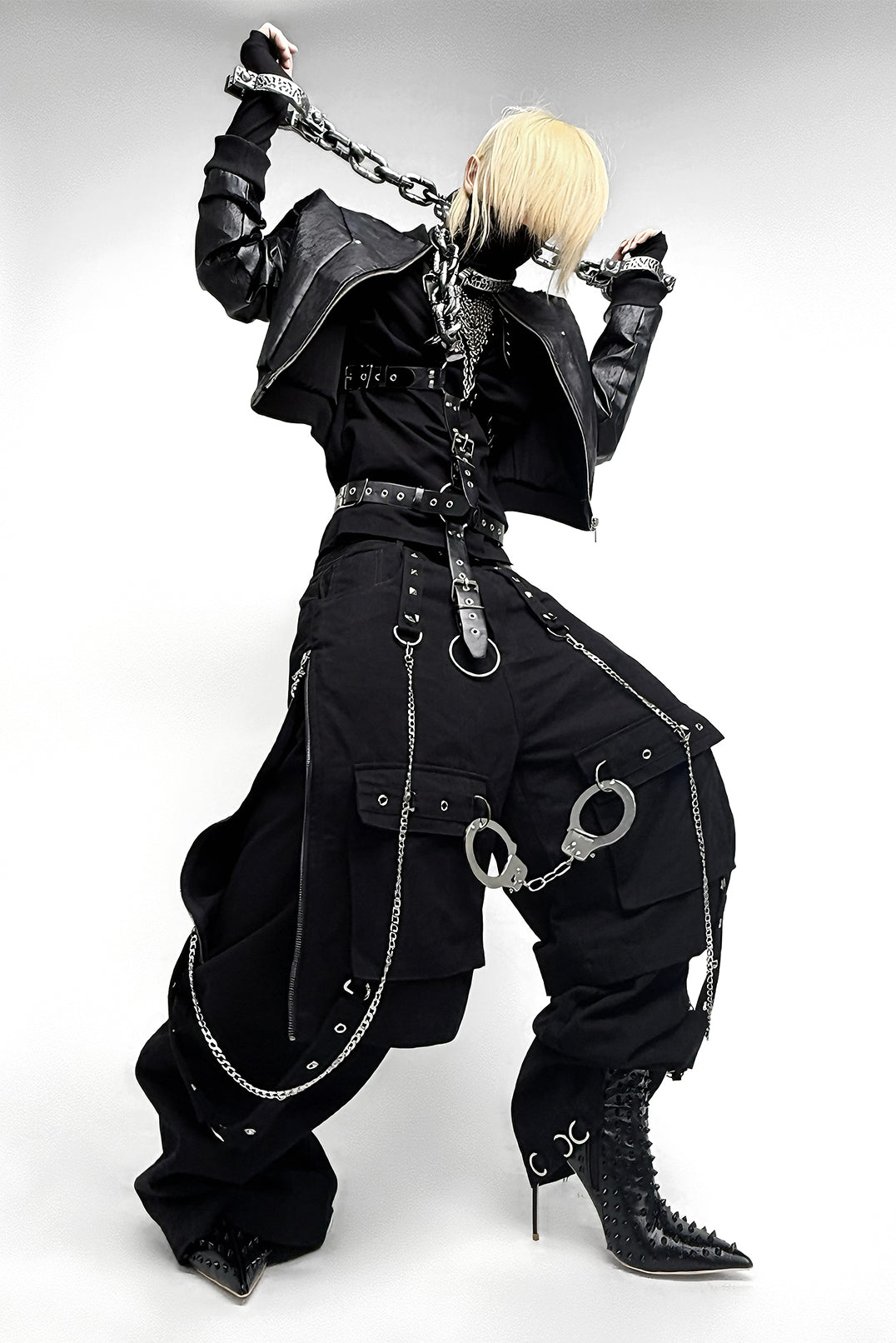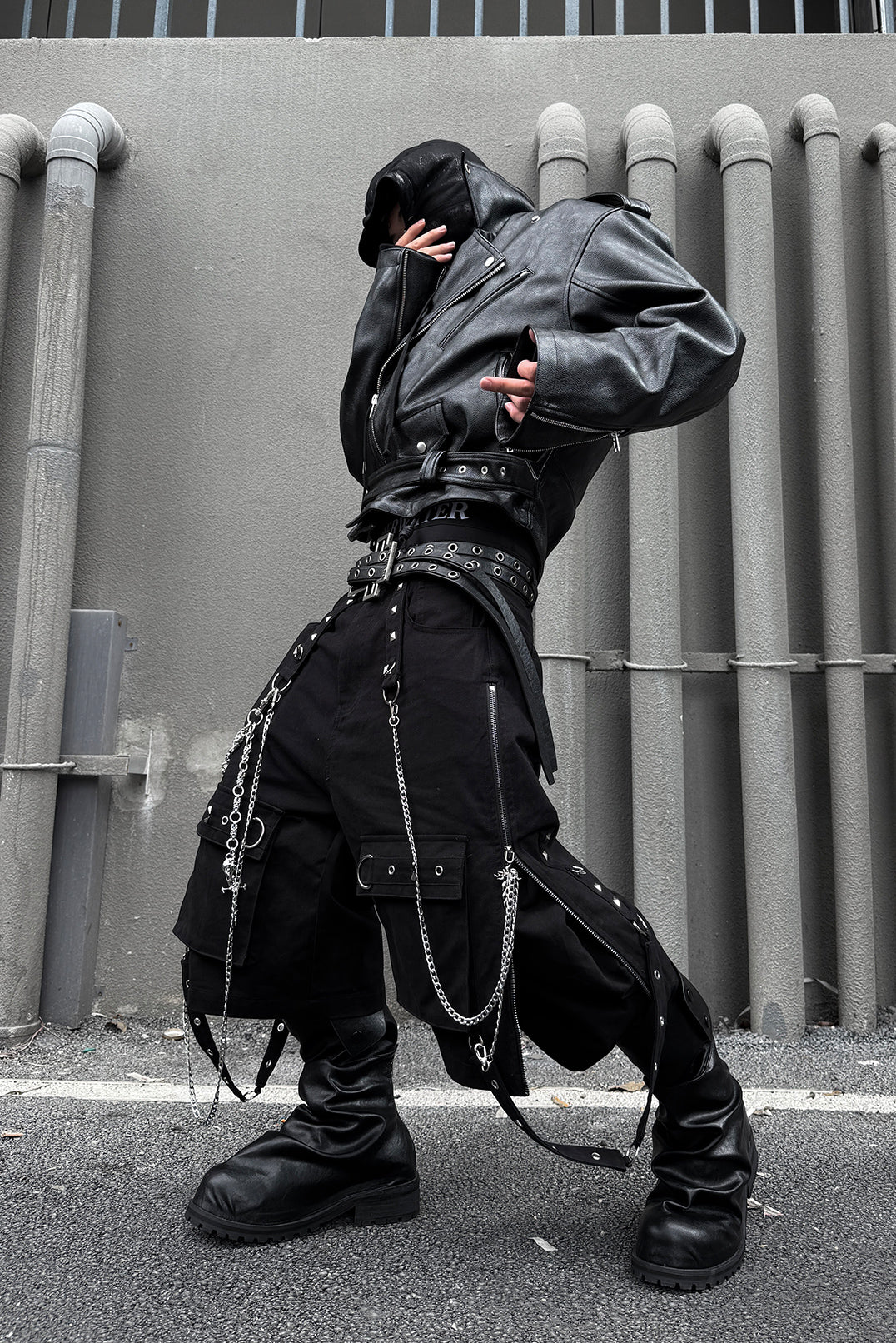 Heavy metal hardware adds a punk-driven edge and sculptural presence.