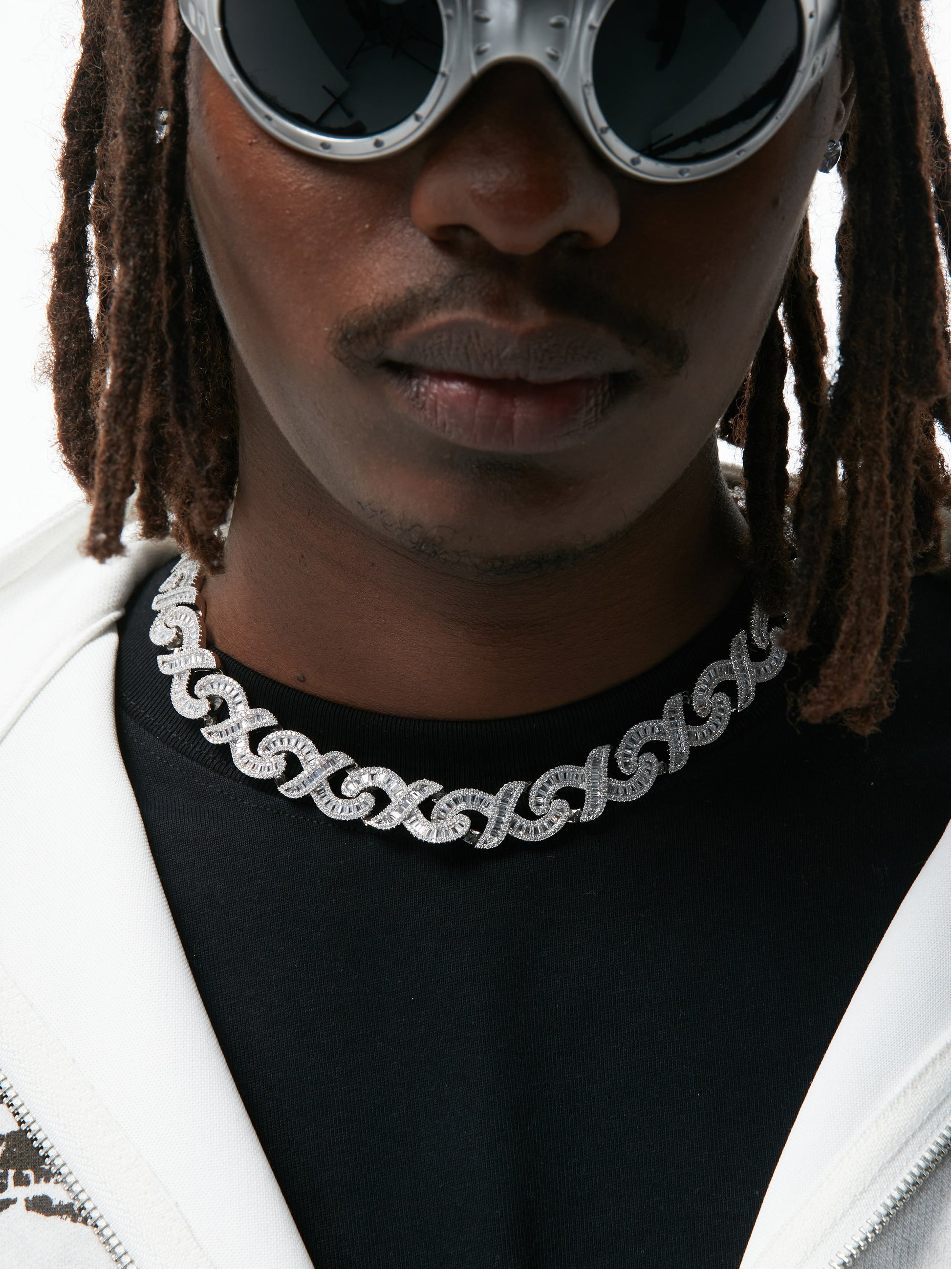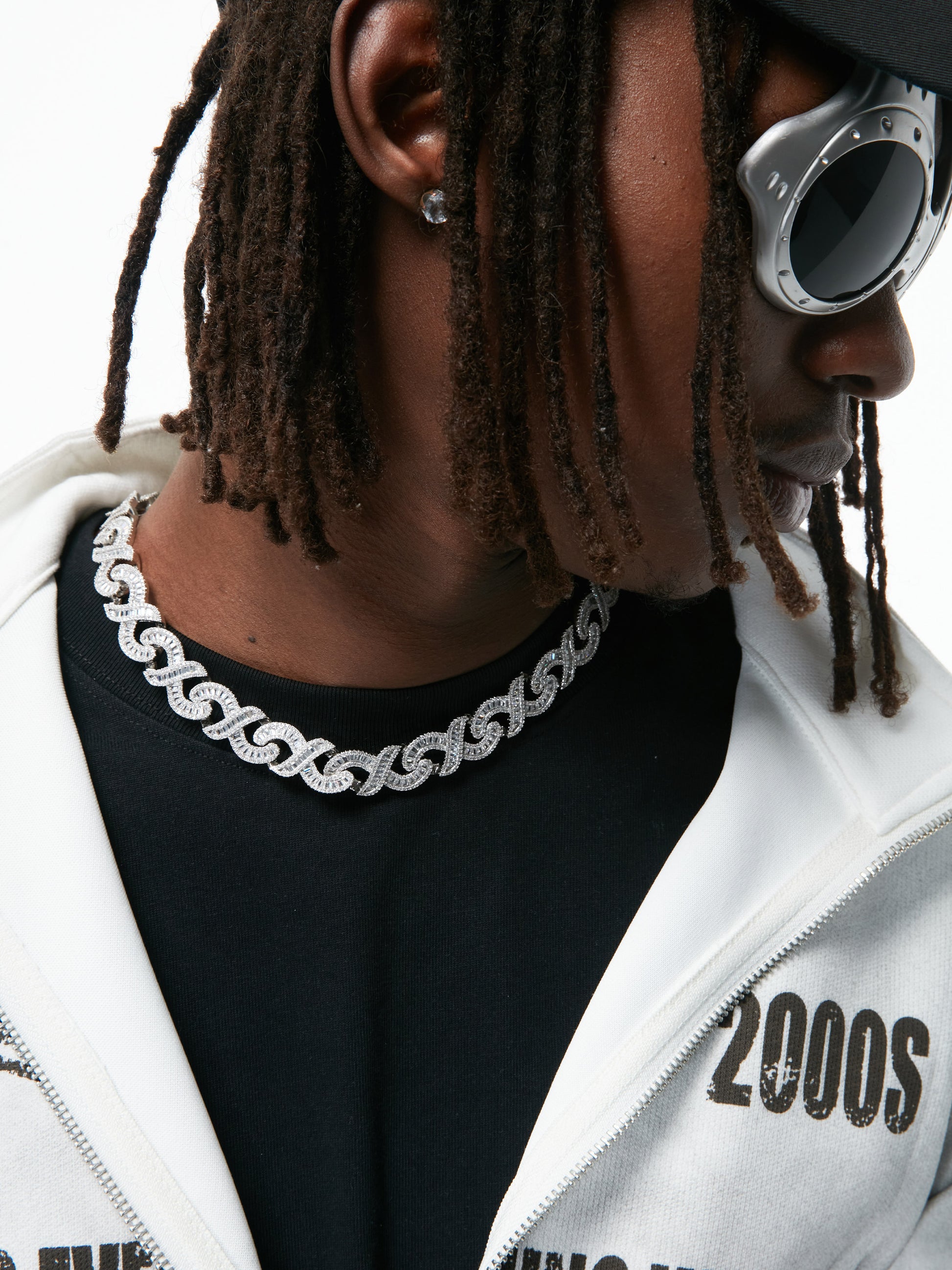 Crafted from copper with a premium silver-plated finish, each link is micro-set with precision-cut zircon stones. The subtle baguette and round cut pairing enhances texture and light play, creating a glistening surface that shifts as you move — luxe in look, resilient in build.