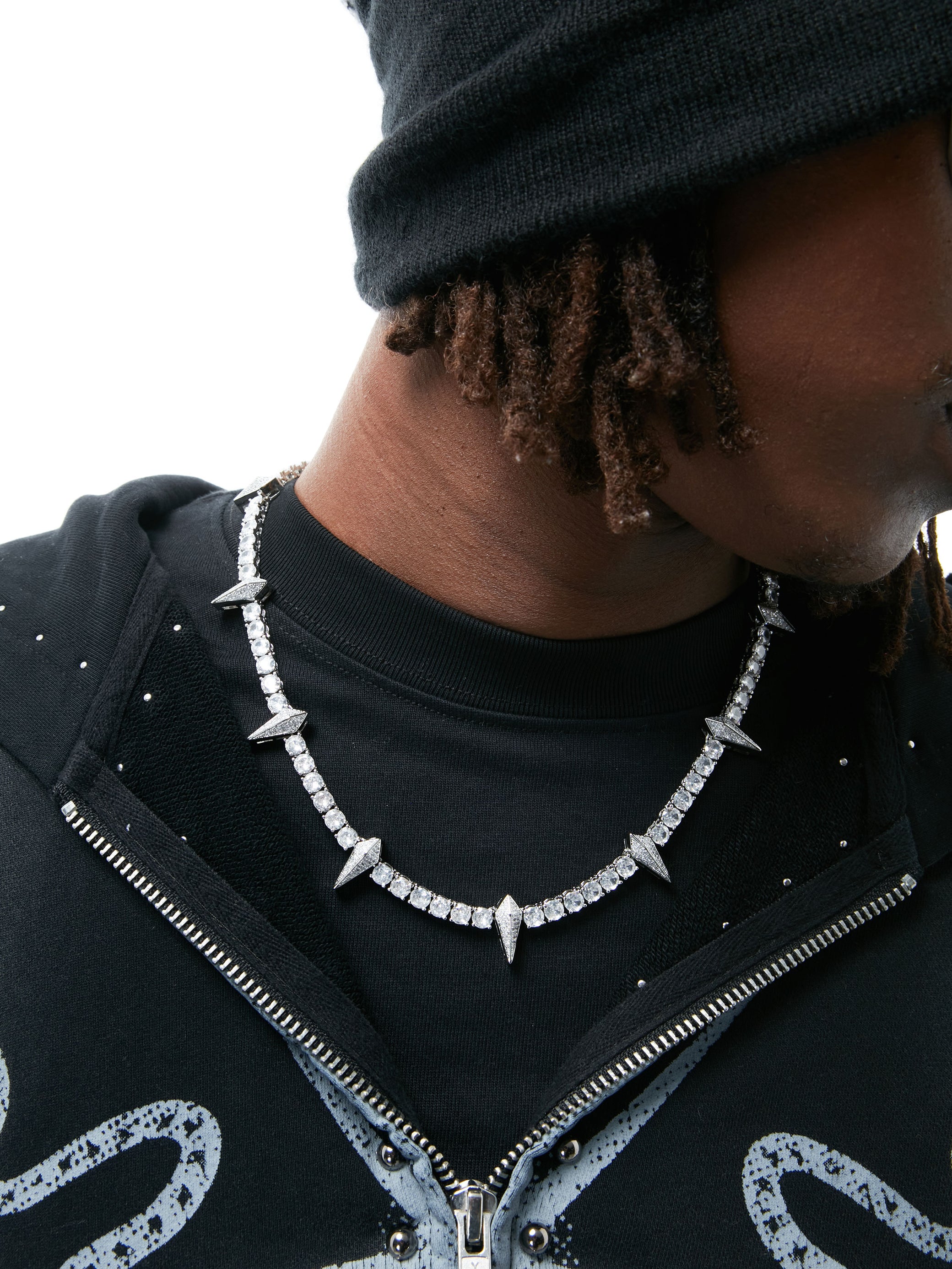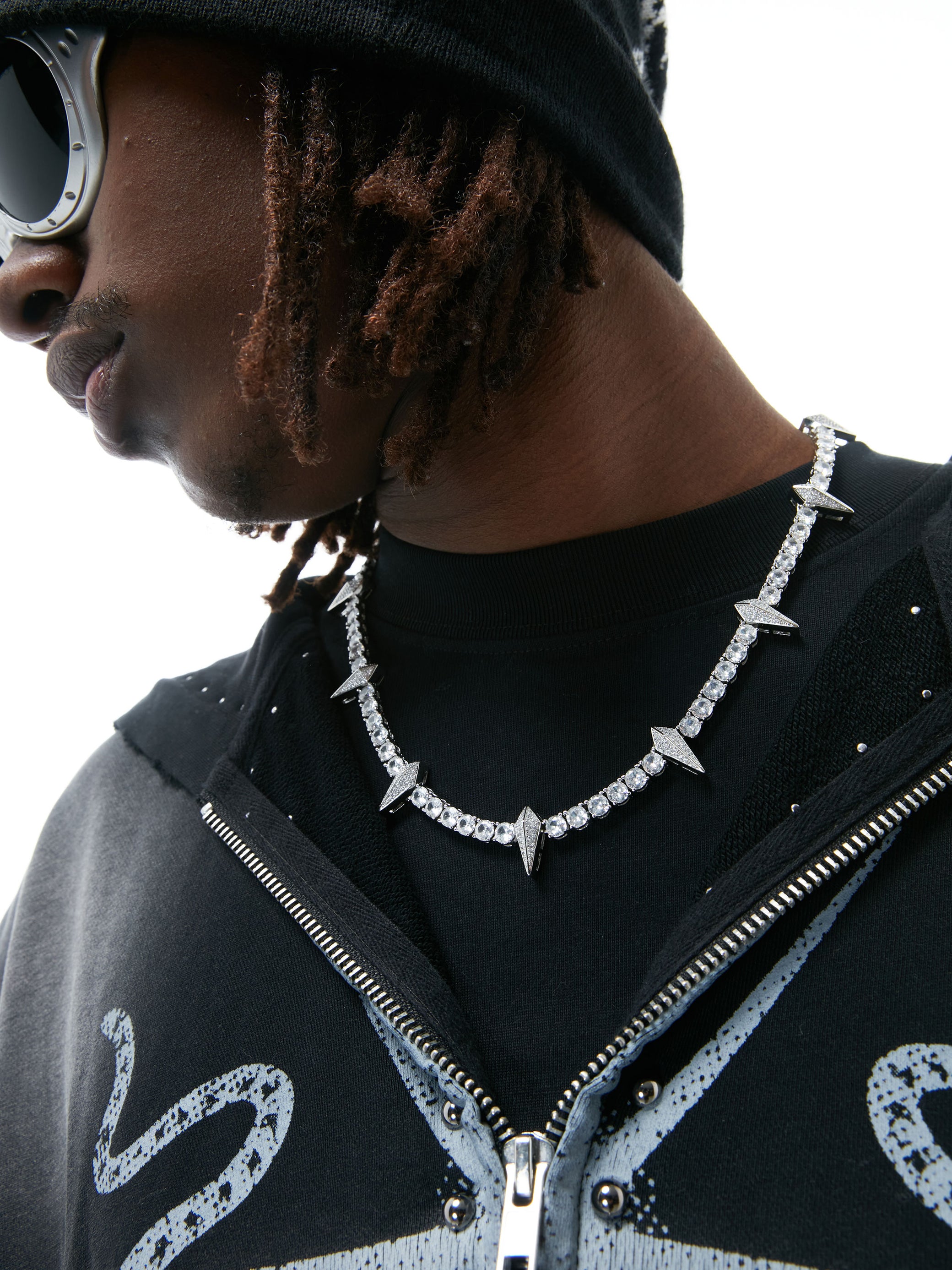 The GLINTFANG necklace fuses sharp geometry with refined brilliance. The full-length chain is set with high-grade zirconia stones that catch the light from every angle, while evenly spaced spike accents evoke a sense of controlled danger—like a modern relic forged in chrome. Available in two lengths, it delivers sleek aggression with sculptural elegance. Built to resist rust, oxidation, and wear, this piece requires no maintenance and never fades.