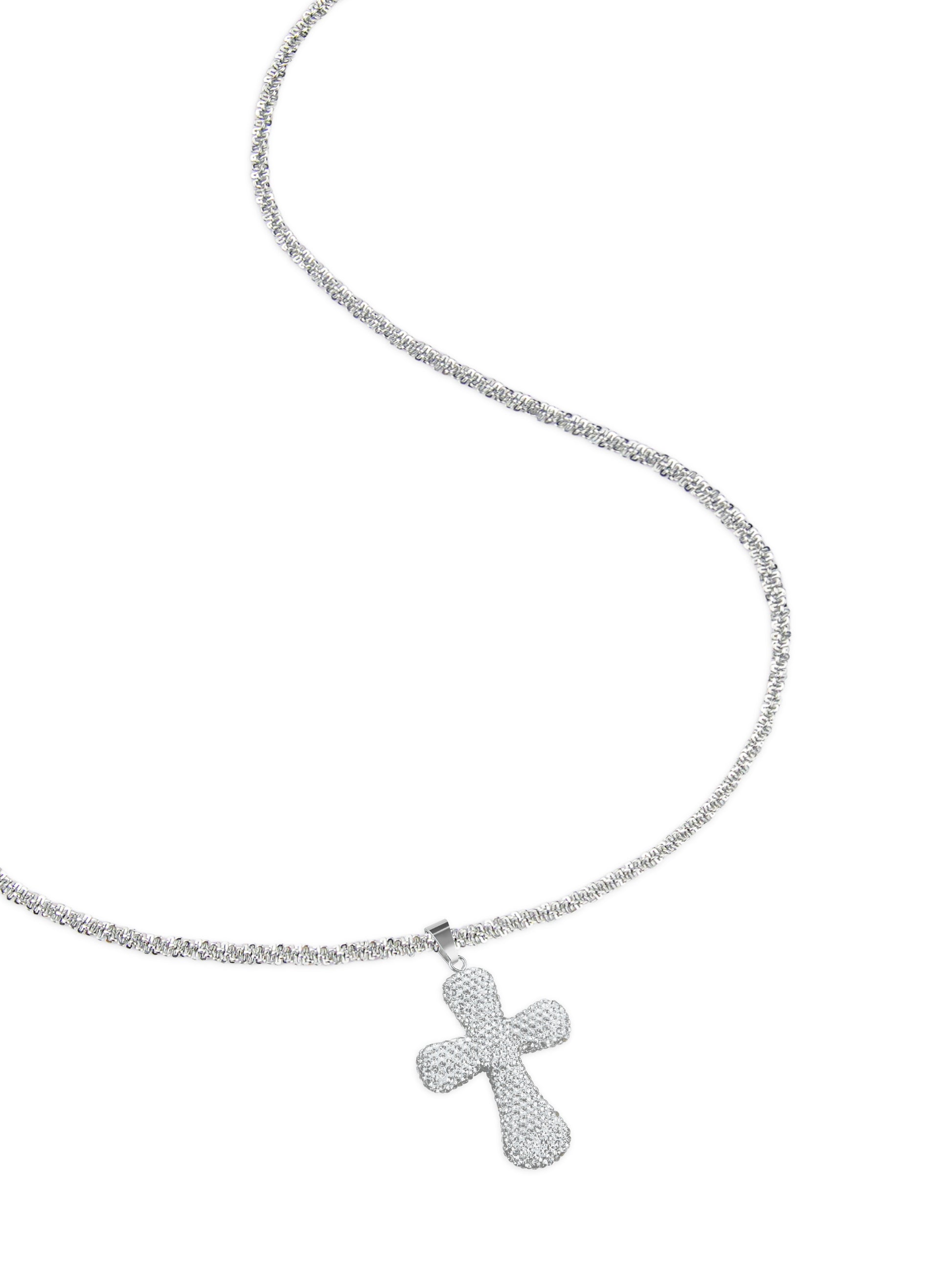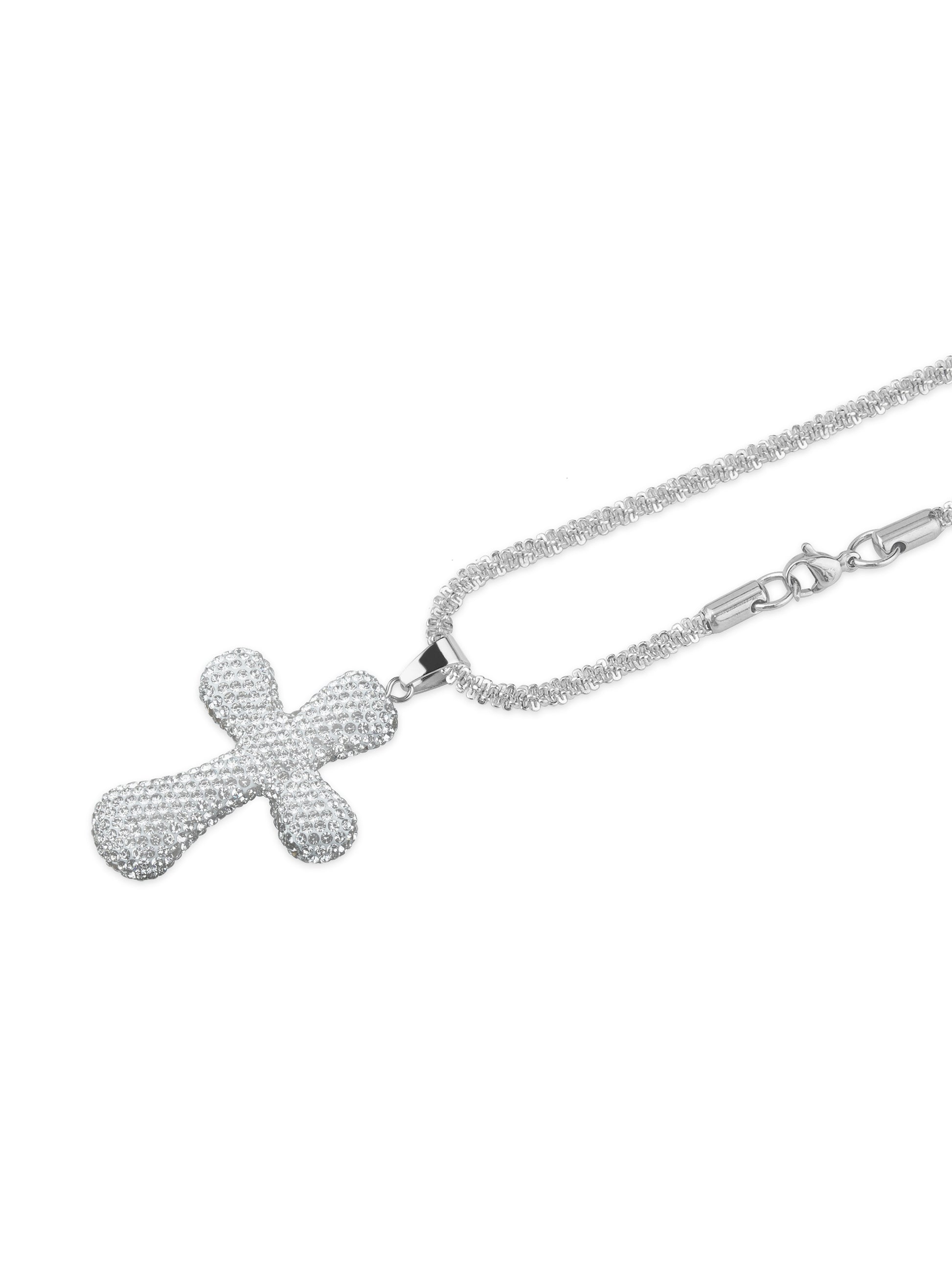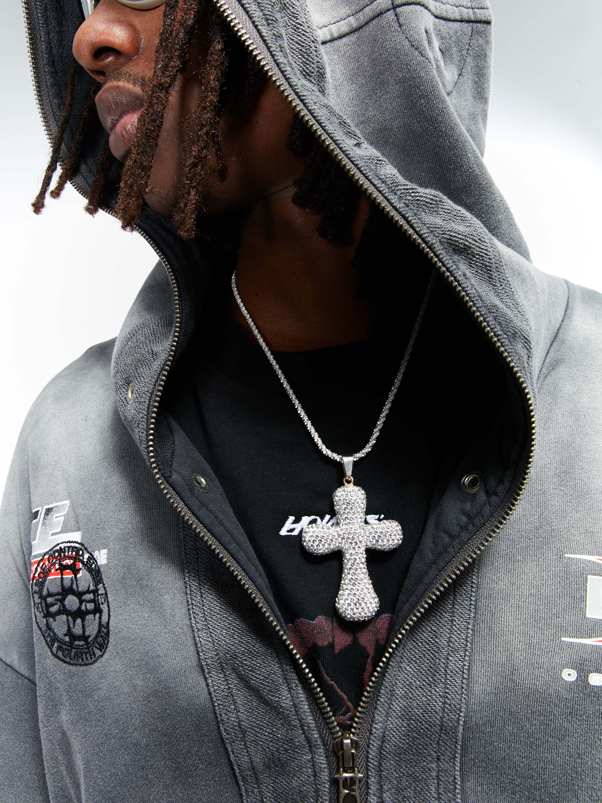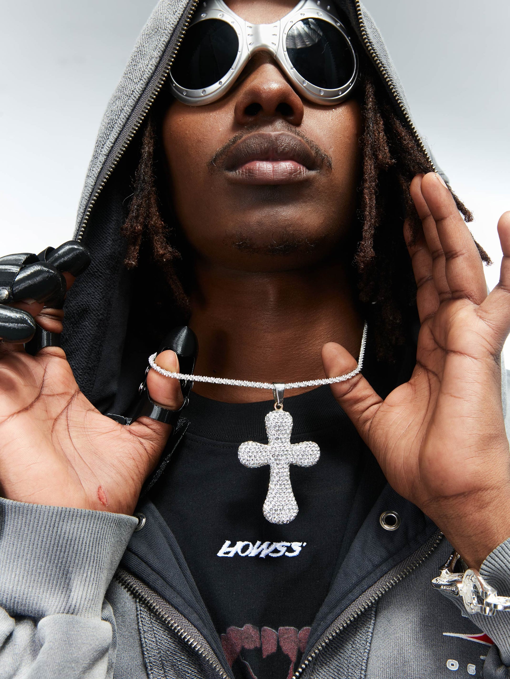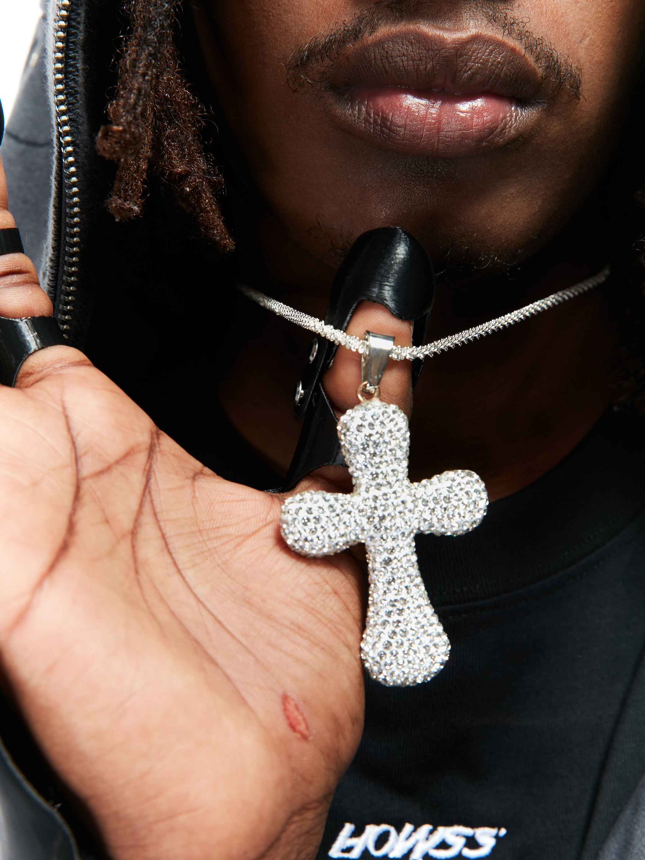 Exclusively designed by HOWSS, HOLY GLARE captures the tension between purity and chaos.The cross, stripped of ornament, becomes a vessel of light — each rhinestone refracting calm precision within defiant clarity.