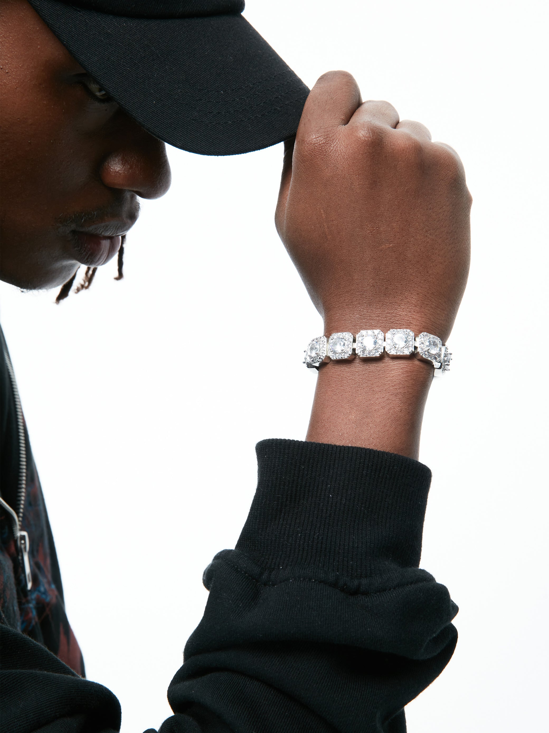This bracelet is crafted by HOWSS. Built entirely from square-cut zircon stones, this piece is all about clean lines and raw shine. Every link locks in place like armor — sharp, symmetrical, and built to hit under cold light. The clasp is fully iced out, finishing the chain with weight and intent. No extras. Just clarity, structure, and presence.
