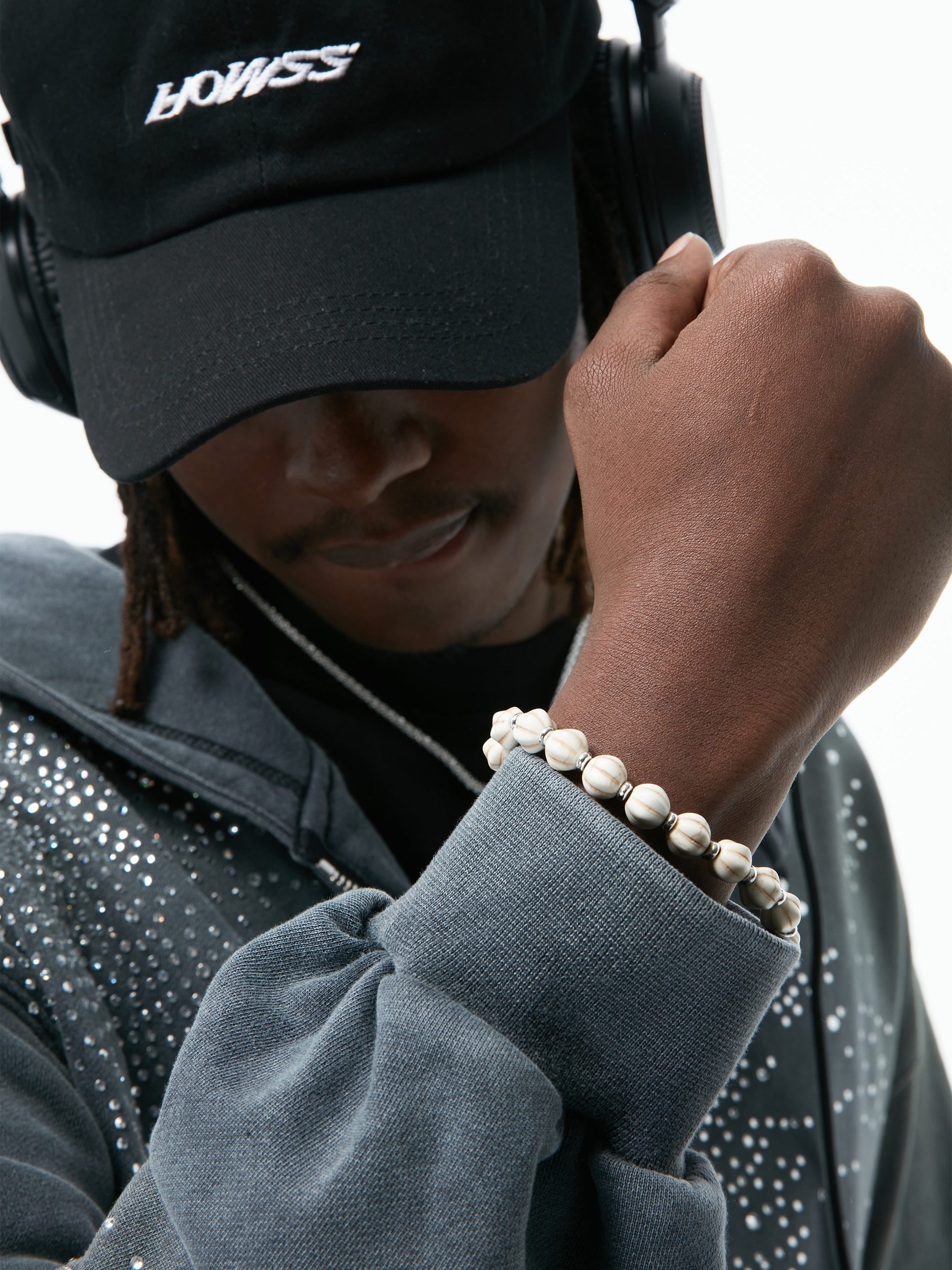 Crafted from polished plated alloy, this bracelet balances minimal structure with raw detail. Irregular beads made from refined artificial stone create a rhythmic texture, while faceted stones in amber or black add a subtle pop of color. With an adjustable extension chain for a flexible fit, this piece blends industrial cool with effortless individuality — perfect for layering or wearing solo.